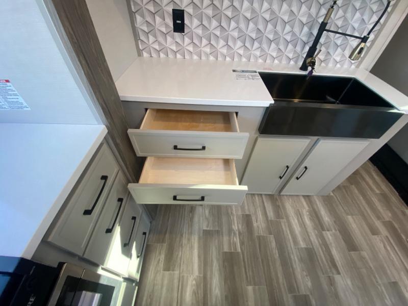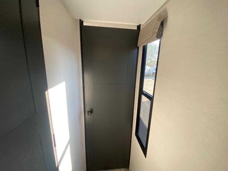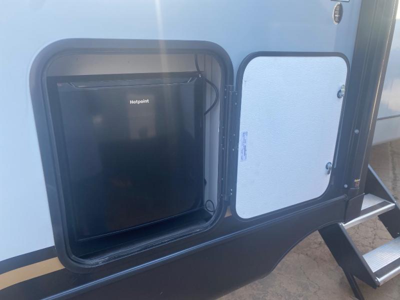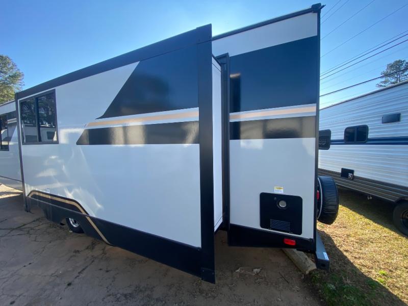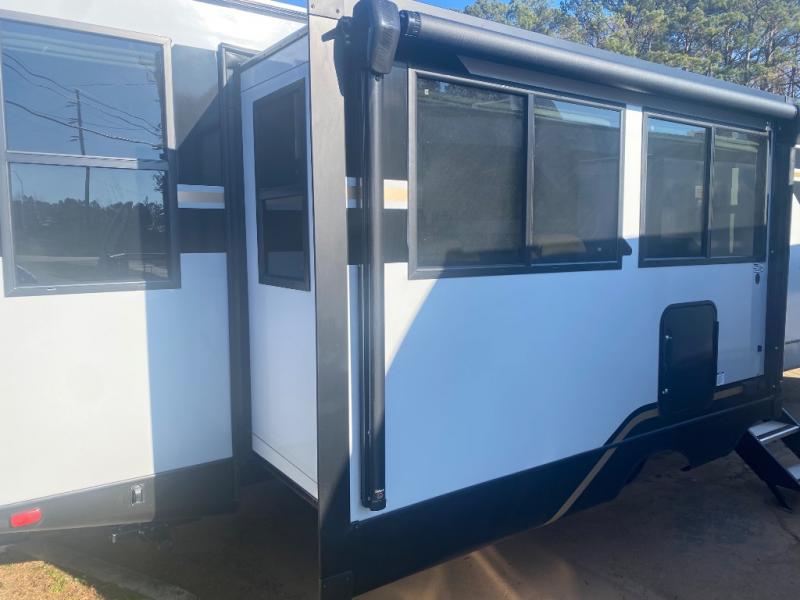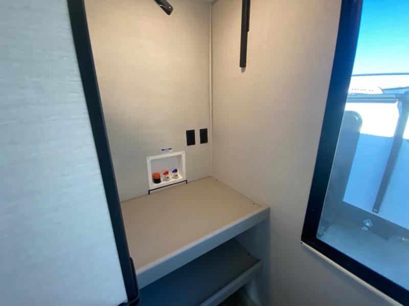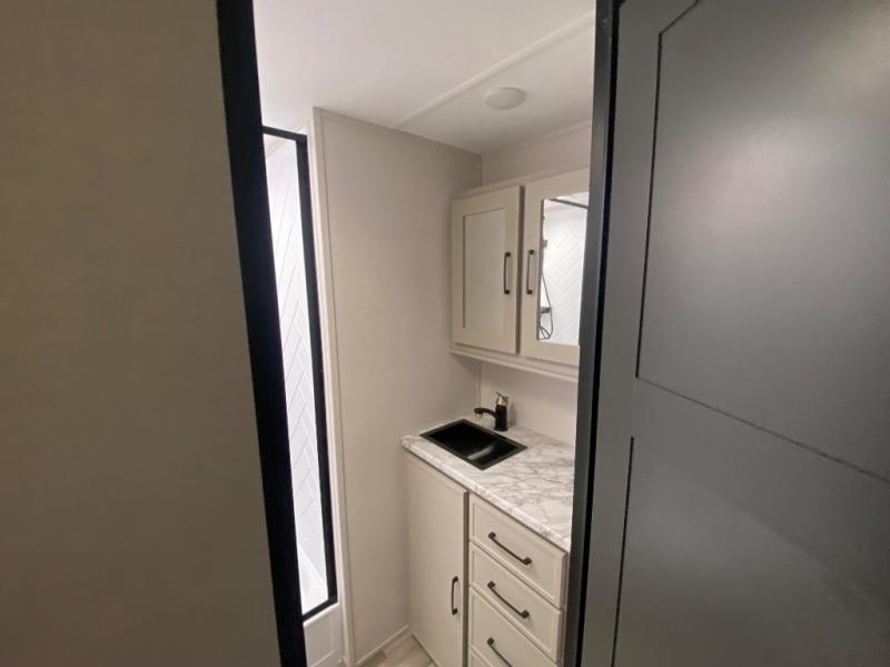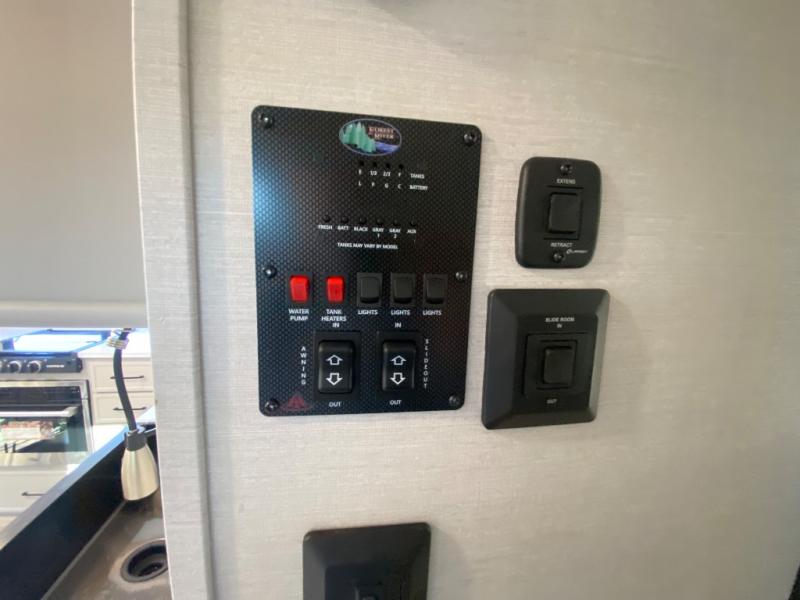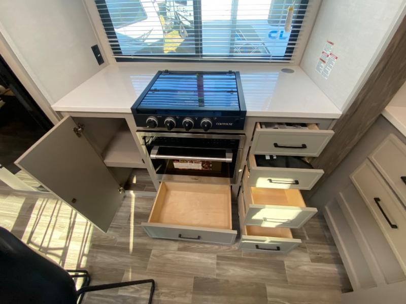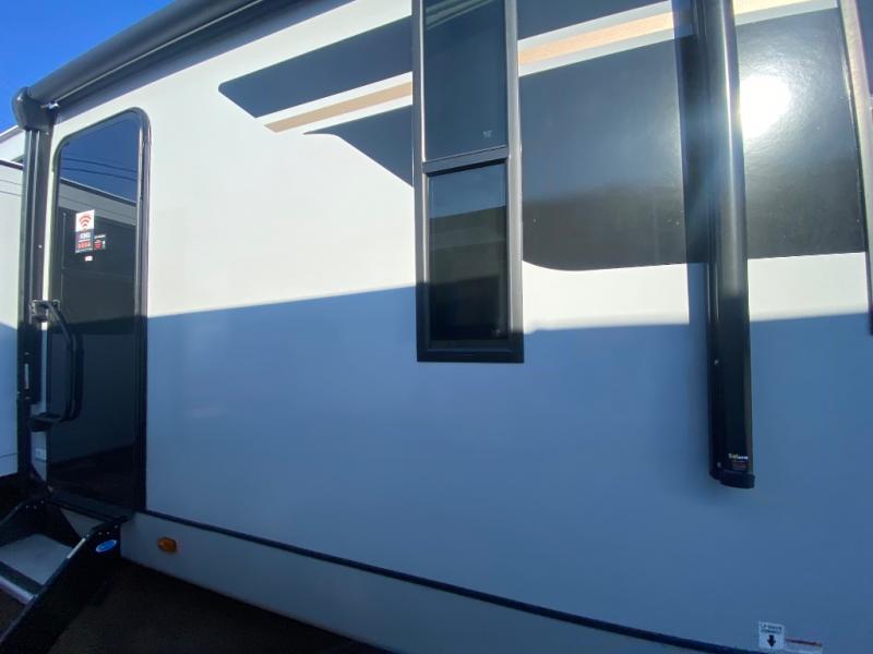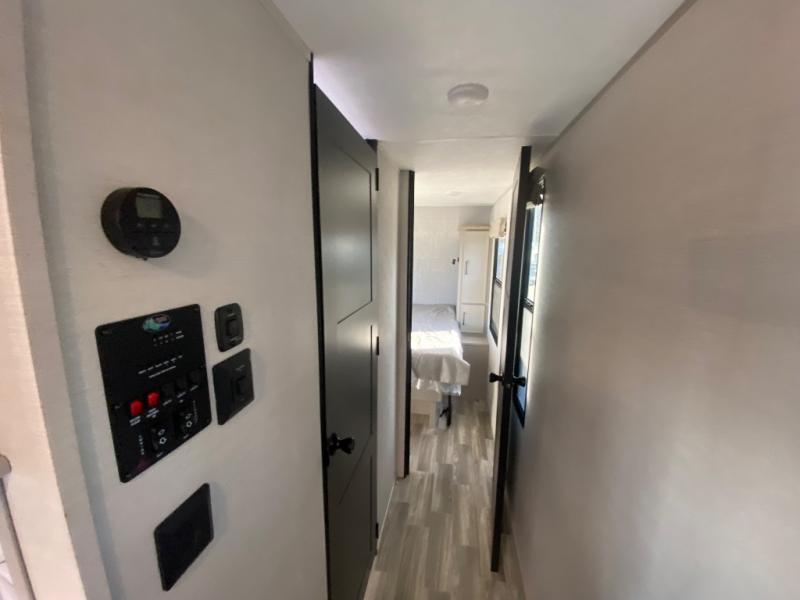 This travel trailer allows you to enjoy the great outdoors without having to give up your creature comforts. The dual opposing slides provide the chef space to work around the kitchen island, and there is plenty of seating space for your guests on the theater seating or the sleeper sofa, plus there's a desk area with chair so you can work on the go. The fireplace with TV above will be perfect for those rainy days, and there is even a large skylight to let natural light into the living room. This model also includes Sure-Step entry steps, pass-through storage, plus two power awnings with LED lights so you can spend more time outdoors with friends and family!