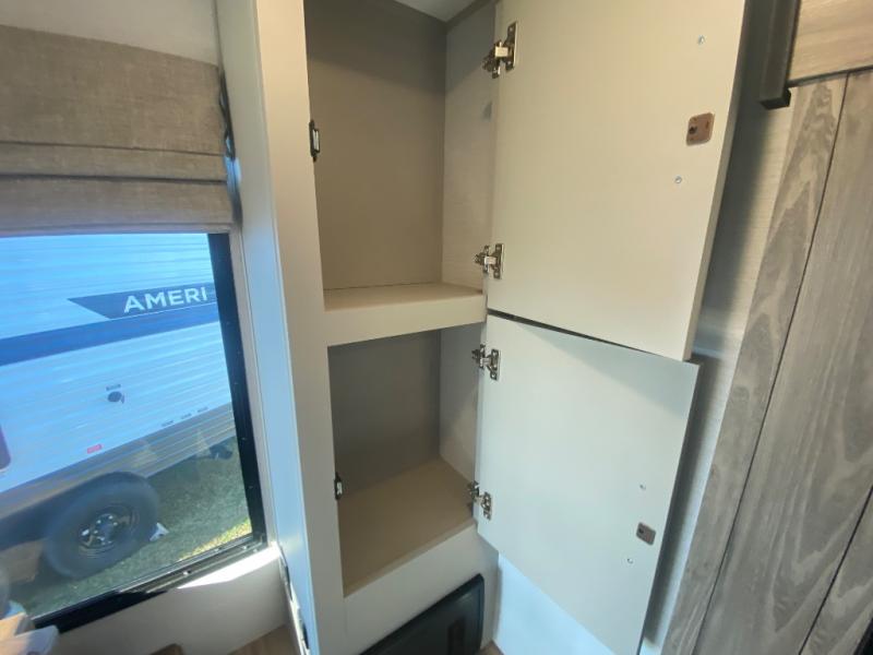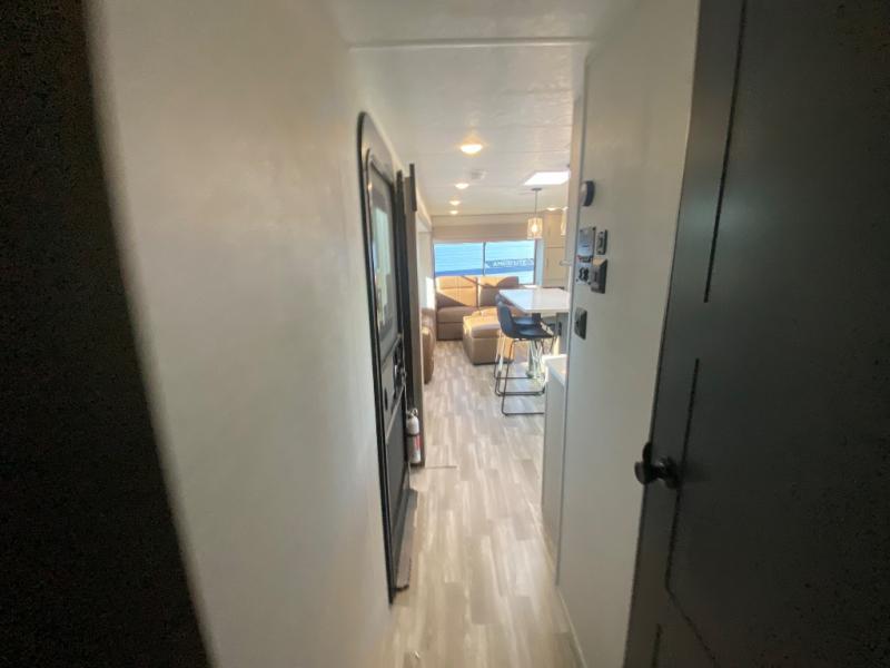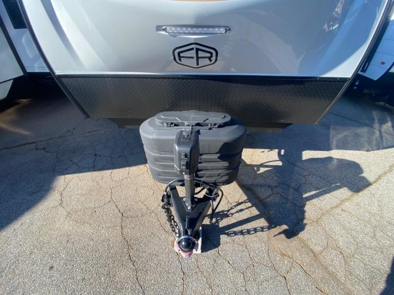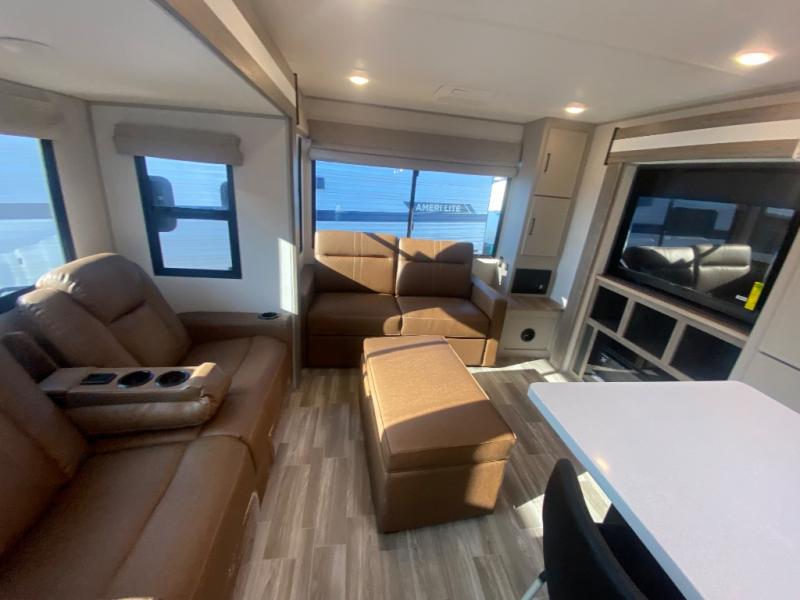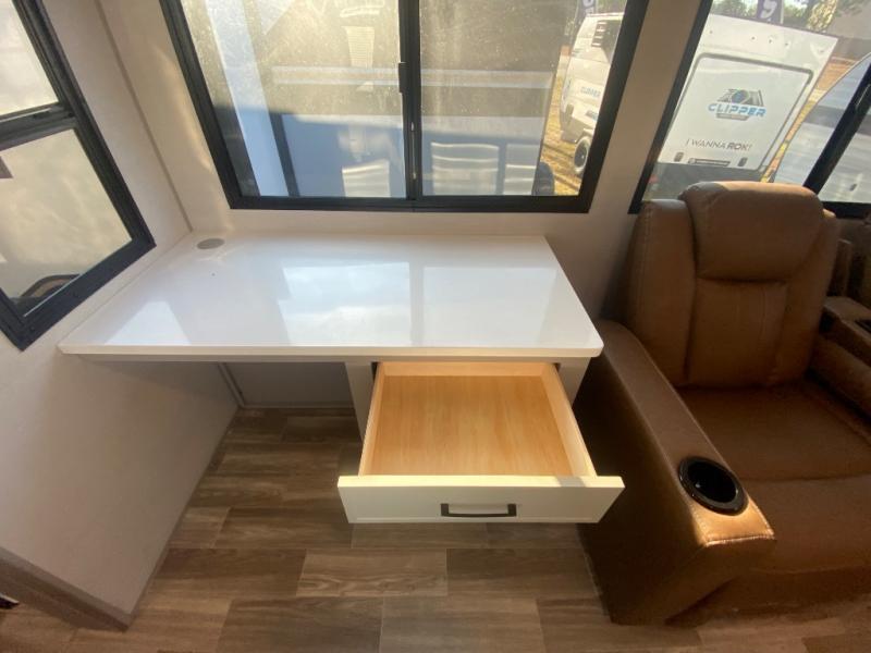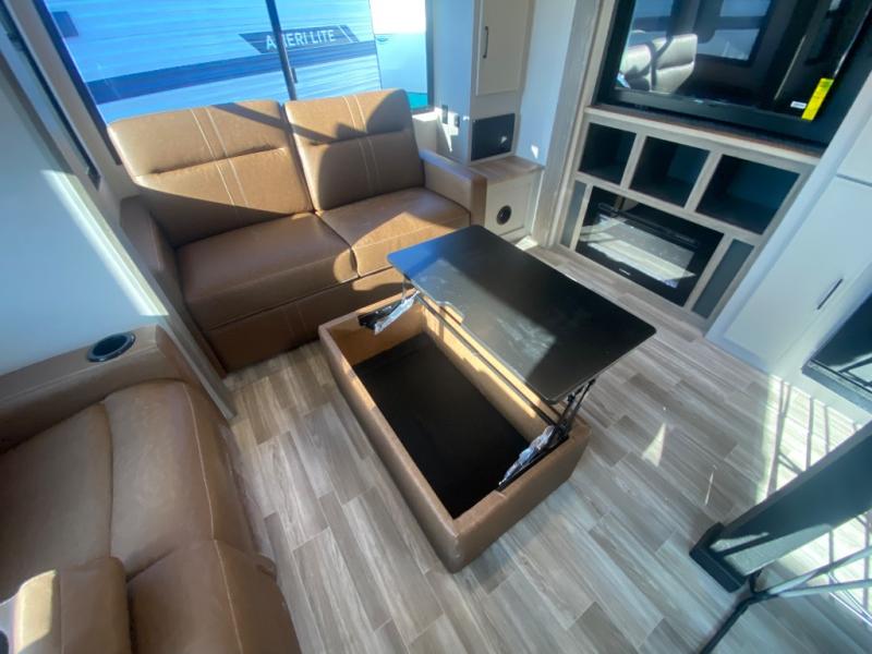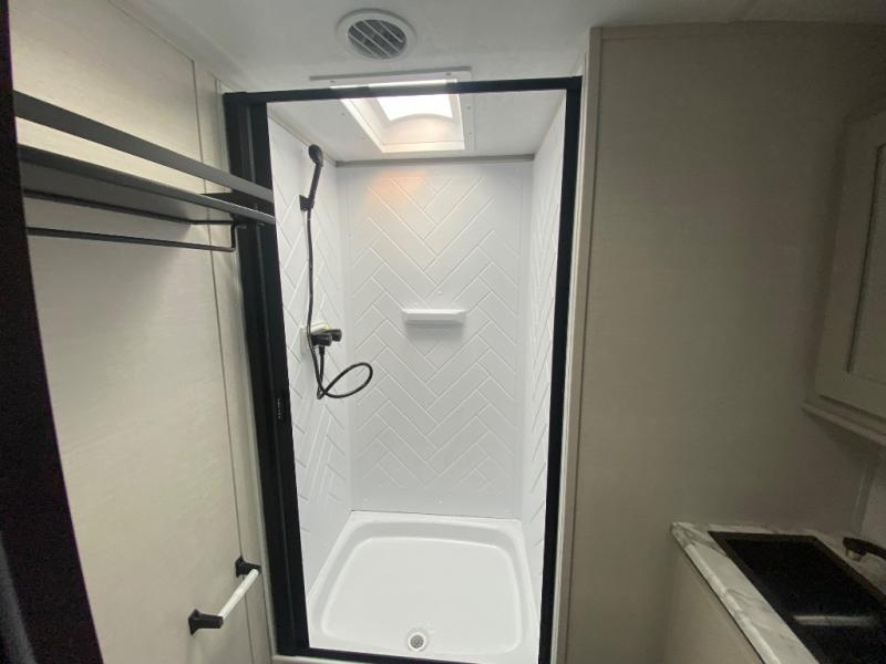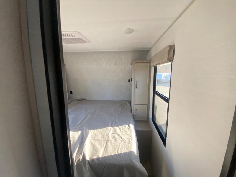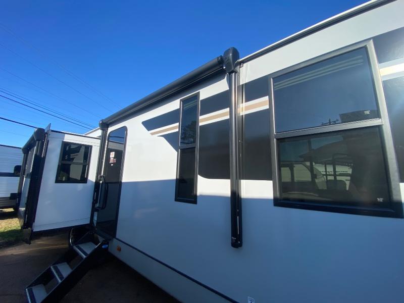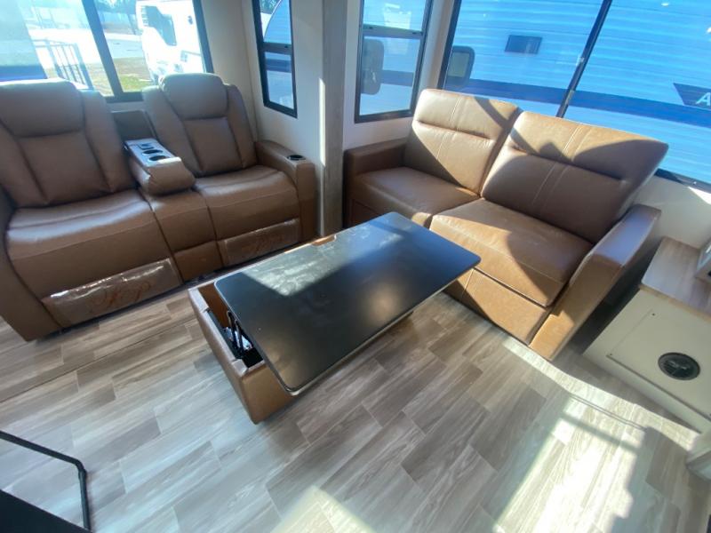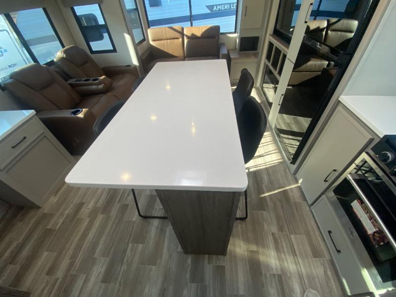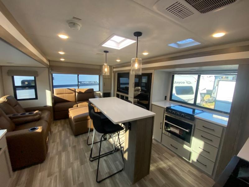 This travel trailer allows you to enjoy the great outdoors without having to give up your creature comforts. The dual opposing slides provide the chef space to work around the kitchen island, and there is plenty of seating space for your guests on the theater seating or the sleeper sofa, plus there's a desk area with chair so you can work on the go. The fireplace with TV above will be perfect for those rainy days, and there is even a large skylight to let natural light into the living room. This model also includes Sure-Step entry steps, pass-through storage, plus two power awnings with LED lights so you can spend more time outdoors with friends and family!