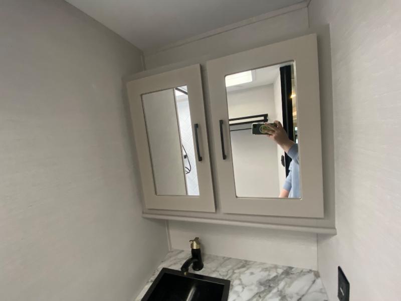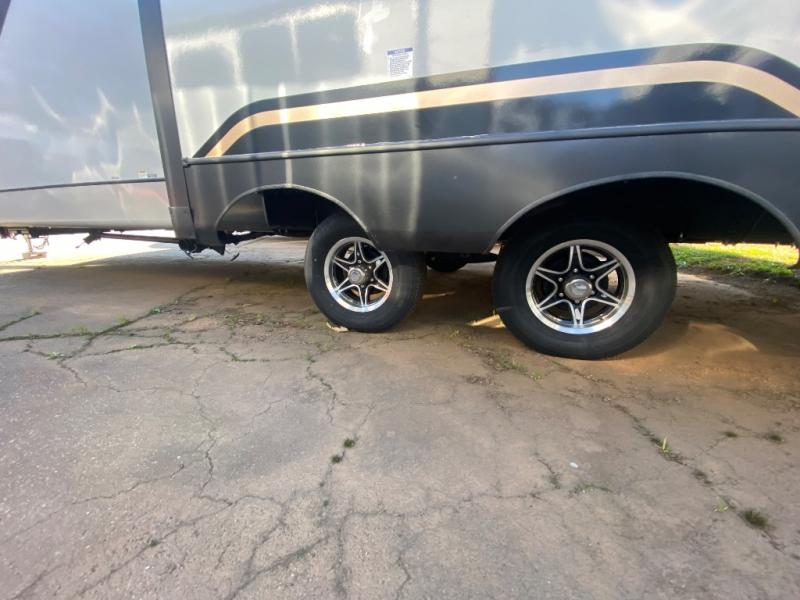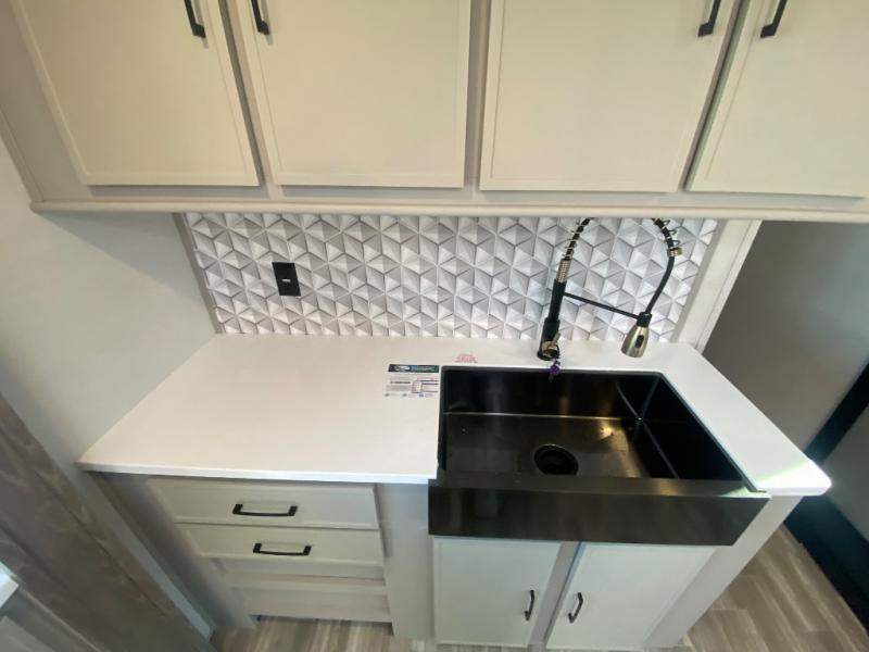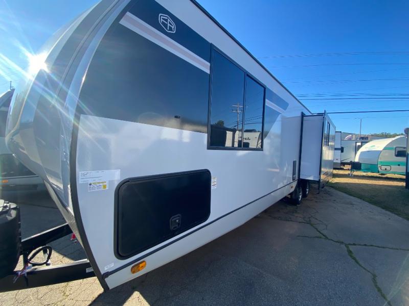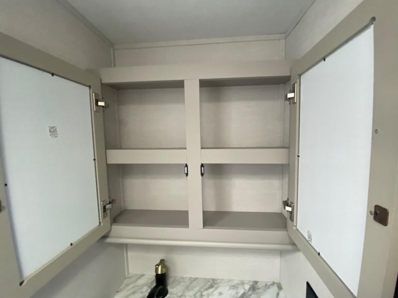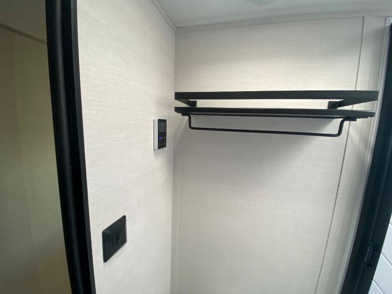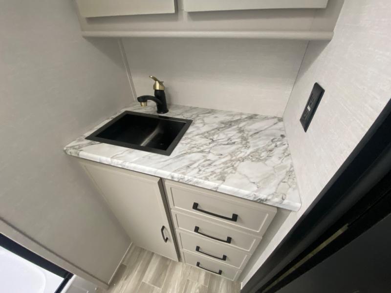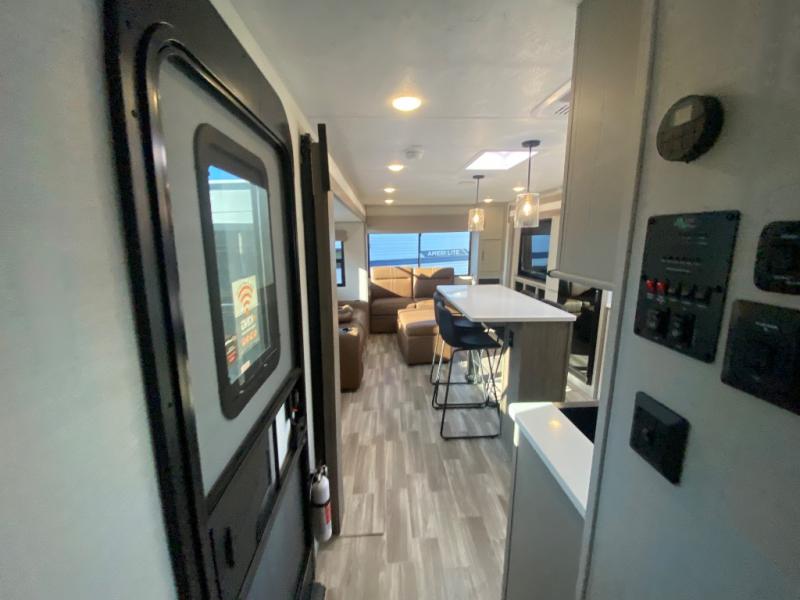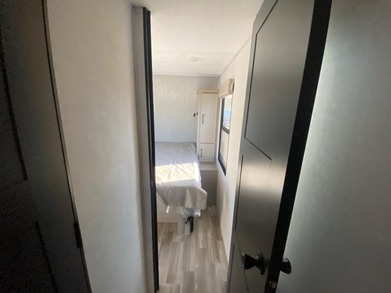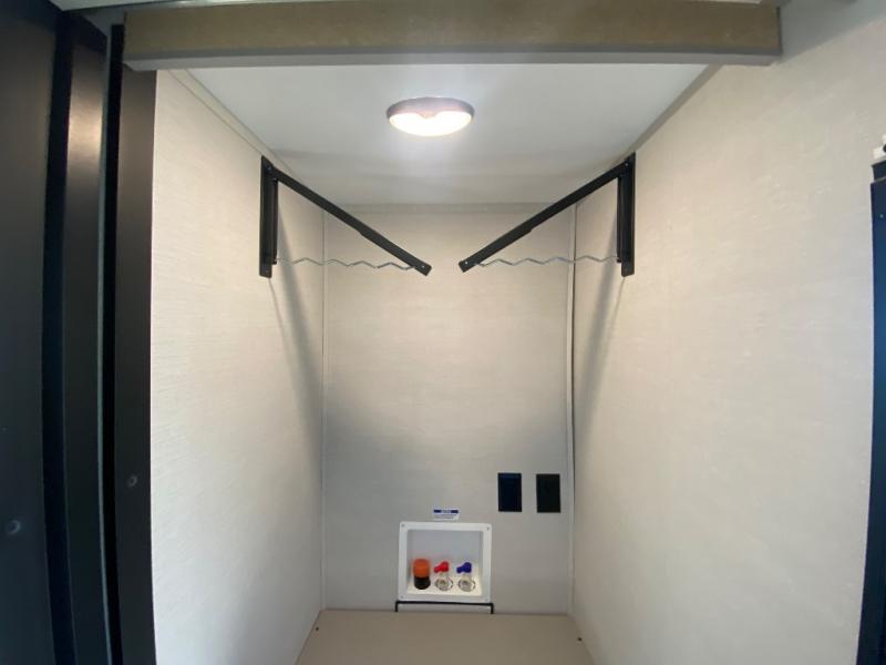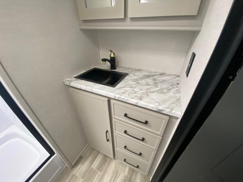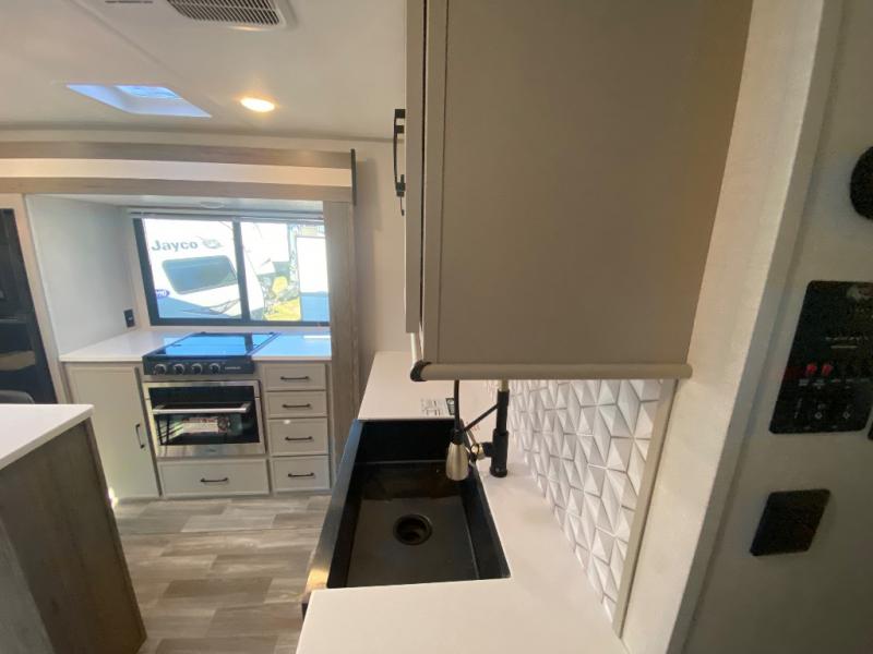 This travel trailer allows you to enjoy the great outdoors without having to give up your creature comforts. The dual opposing slides provide the chef space to work around the kitchen island, and there is plenty of seating space for your guests on the theater seating or the sleeper sofa, plus there's a desk area with chair so you can work on the go. The fireplace with TV above will be perfect for those rainy days, and there is even a large skylight to let natural light into the living room. This model also includes Sure-Step entry steps, pass-through storage, plus two power awnings with LED lights so you can spend more time outdoors with friends and family!