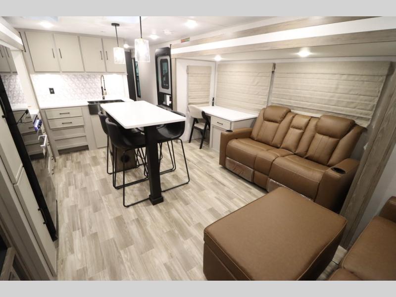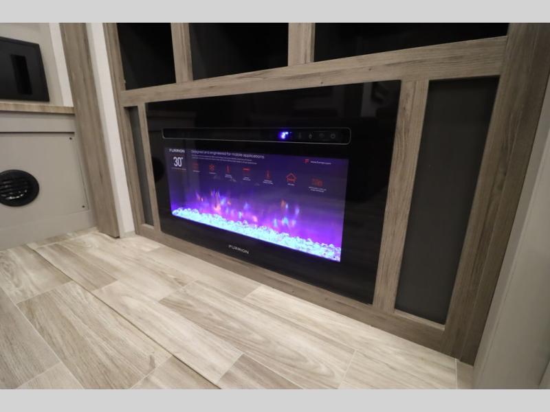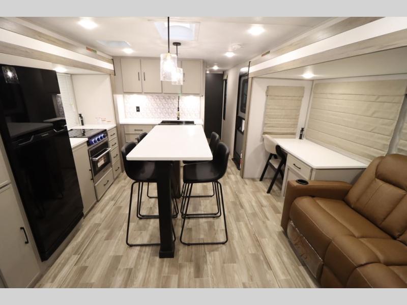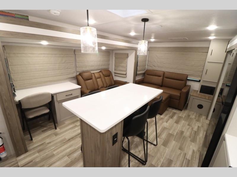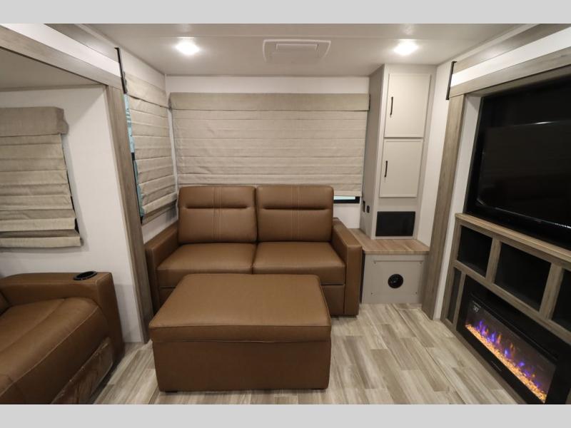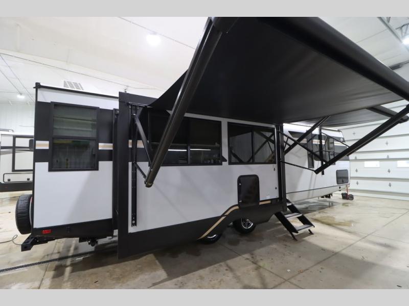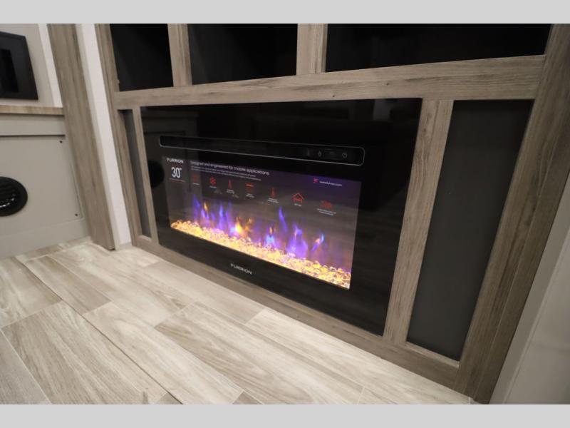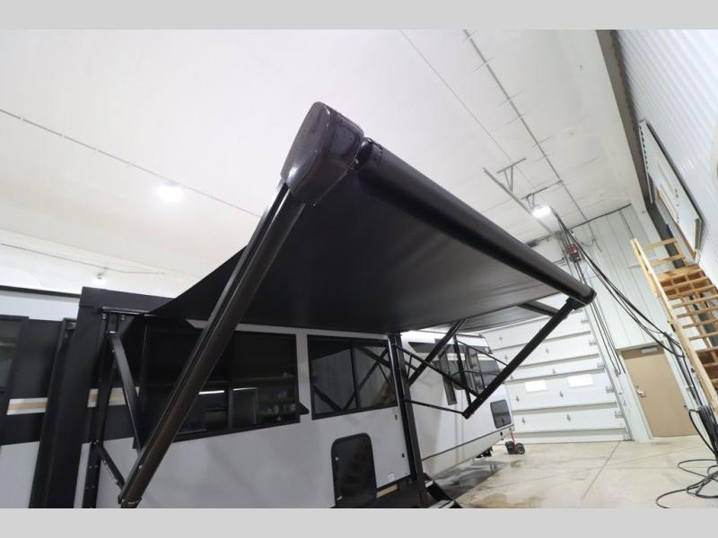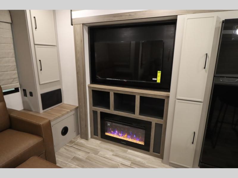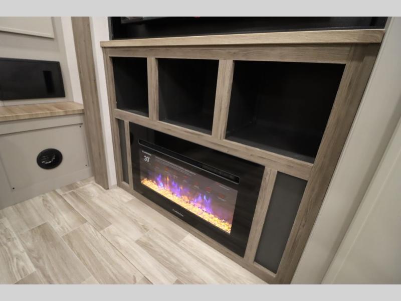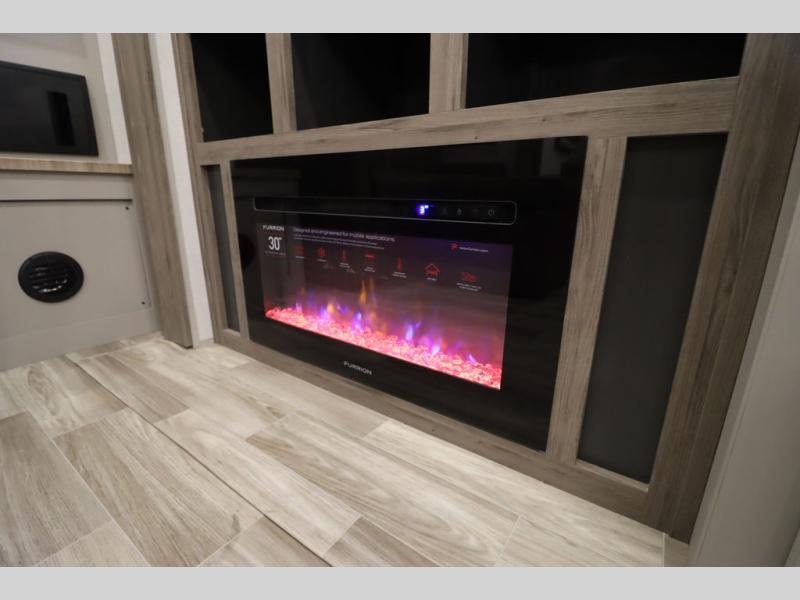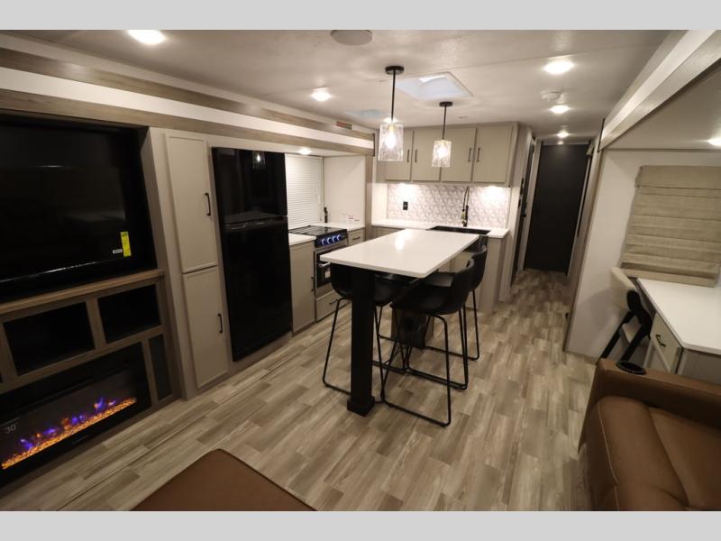 This travel trailer allows you to enjoy the great outdoors without having to give up your creature comforts. The dual opposing slides provide the chef space to work around the kitchen island, and there is plenty of seating space for your guests on the theater seating or the sleeper sofa, plus there's a desk area with chair so you can work on the go. The fireplace with a TV above will be perfect for those rainy days, and there is even a large skylight to let natural light into the living room. This model also includes Sure-Step entry steps, pass-through storage, plus two power awnings with LED lights so you can spend more time outdoors with friends and family!