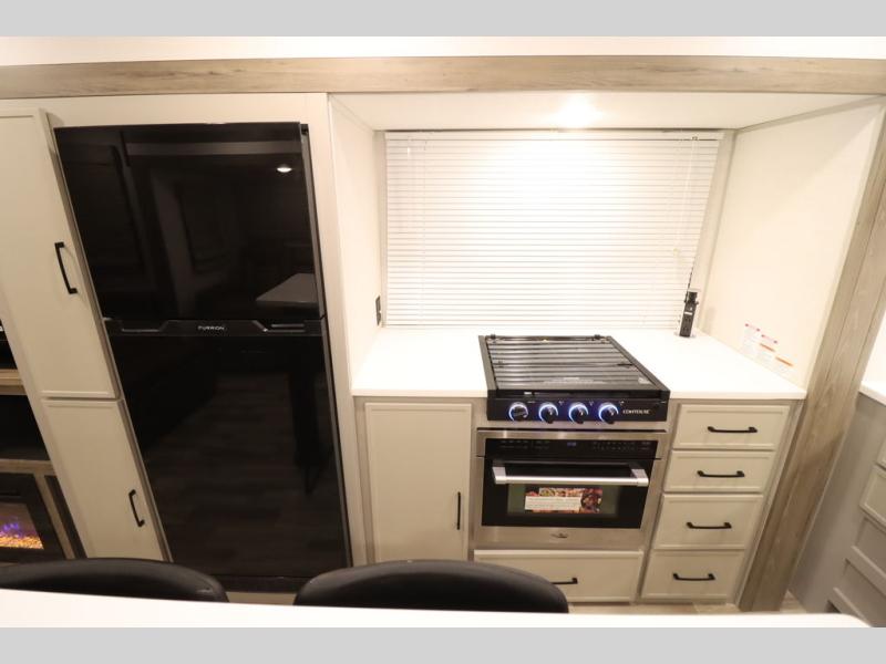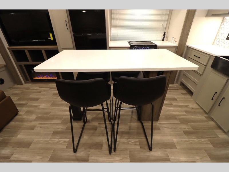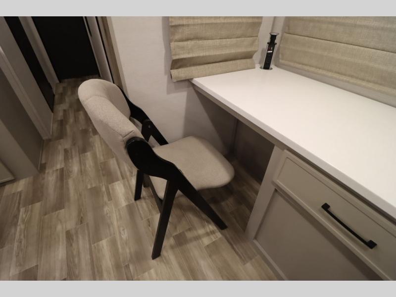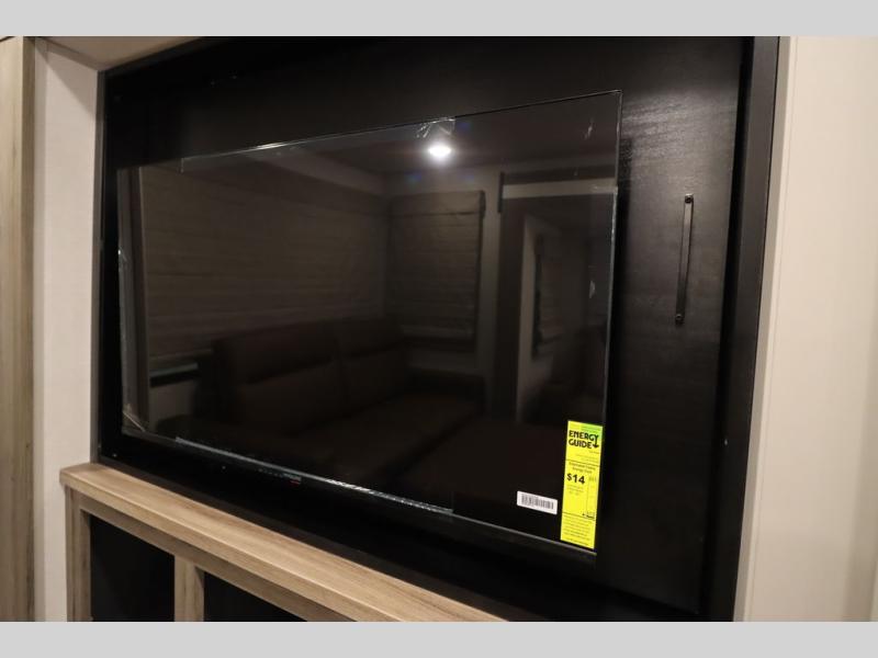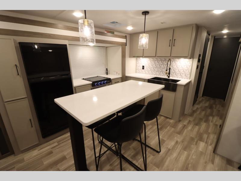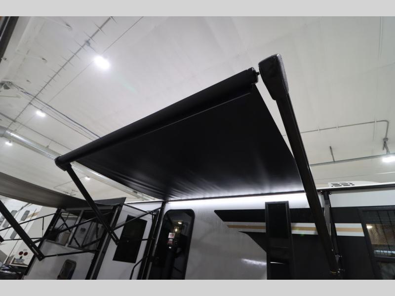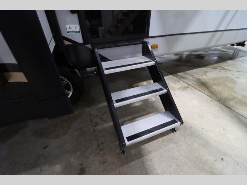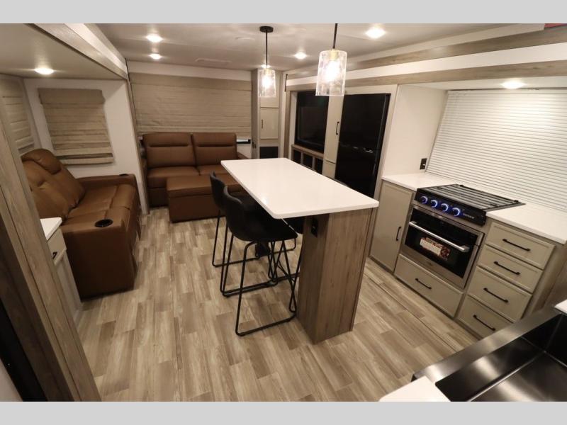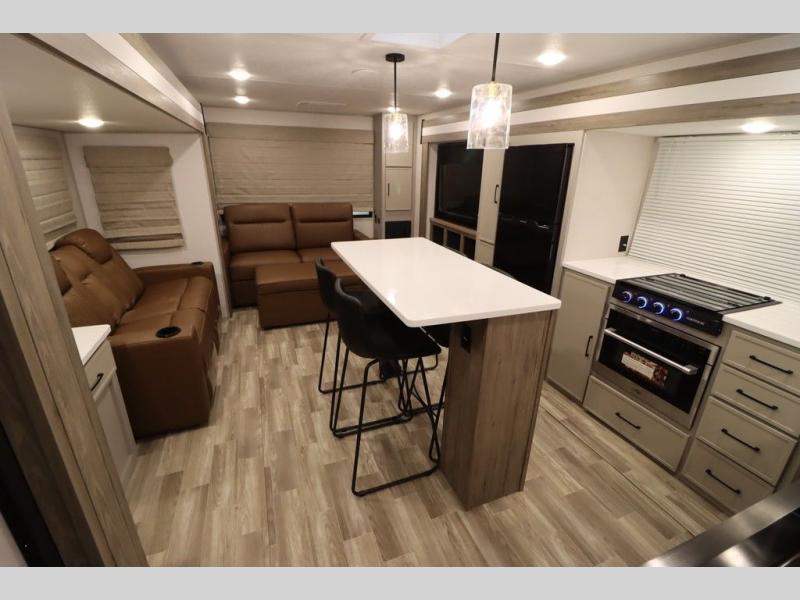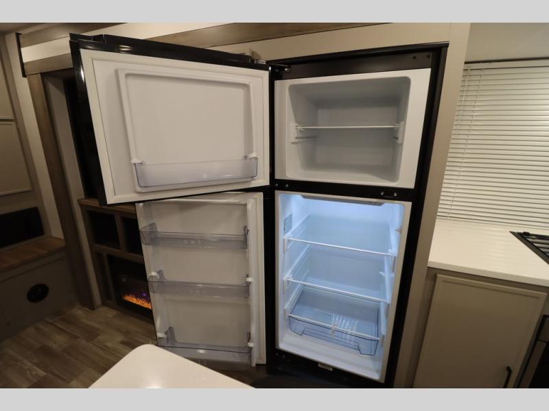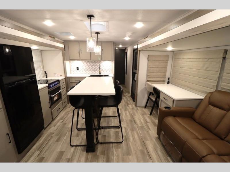 This travel trailer allows you to enjoy the great outdoors without having to give up your creature comforts. The dual opposing slides provide the chef space to work around the kitchen island, and there is plenty of seating space for your guests on the theater seating or the sleeper sofa, plus there's a desk area with chair so you can work on the go. The fireplace with a TV above will be perfect for those rainy days, and there is even a large skylight to let natural light into the living room. This model also includes Sure-Step entry steps, pass-through storage, plus two power awnings with LED lights so you can spend more time outdoors with friends and family!