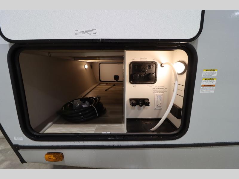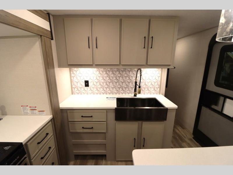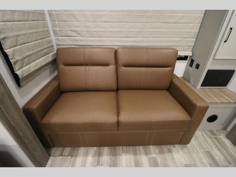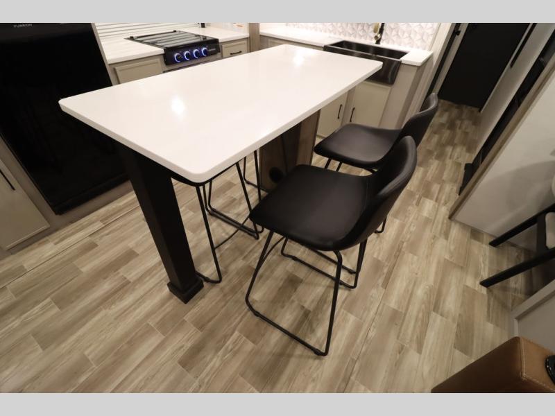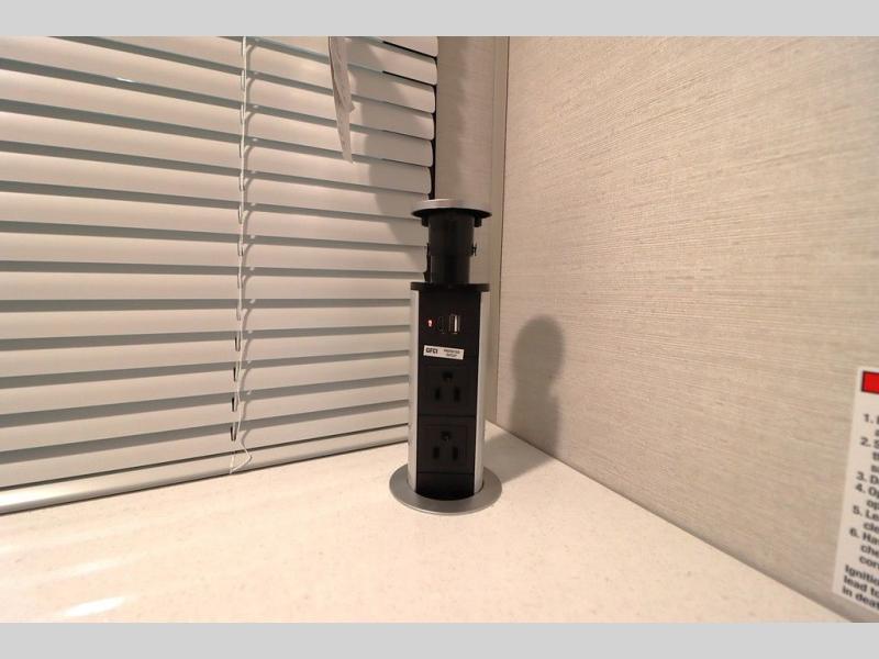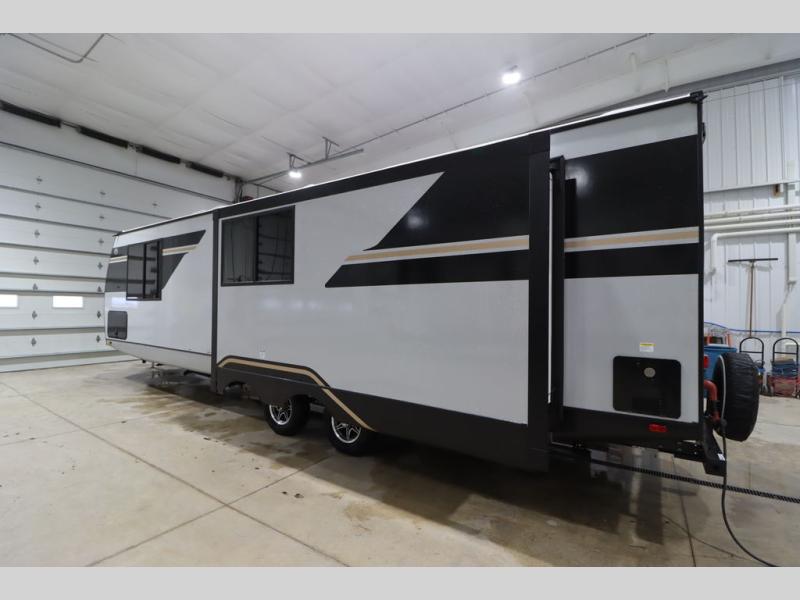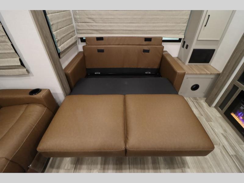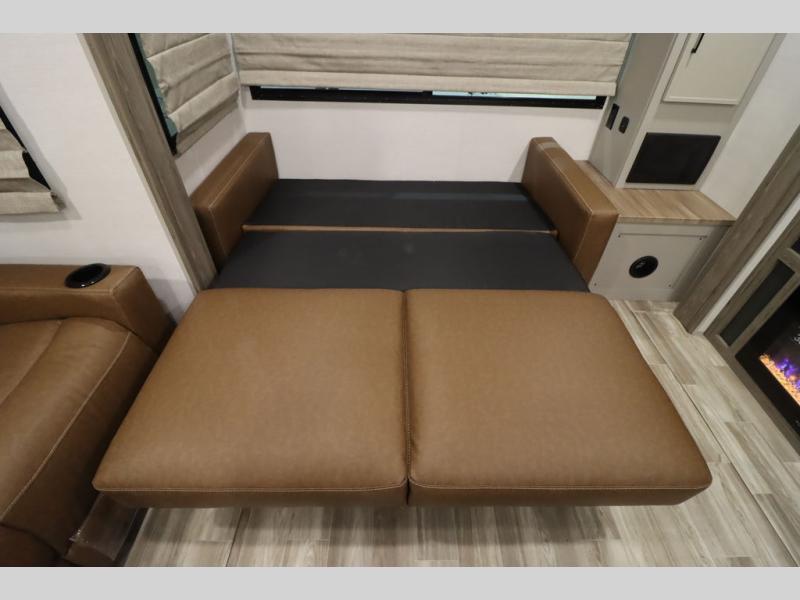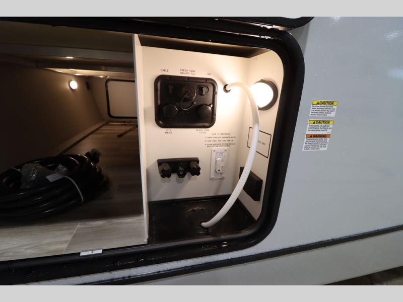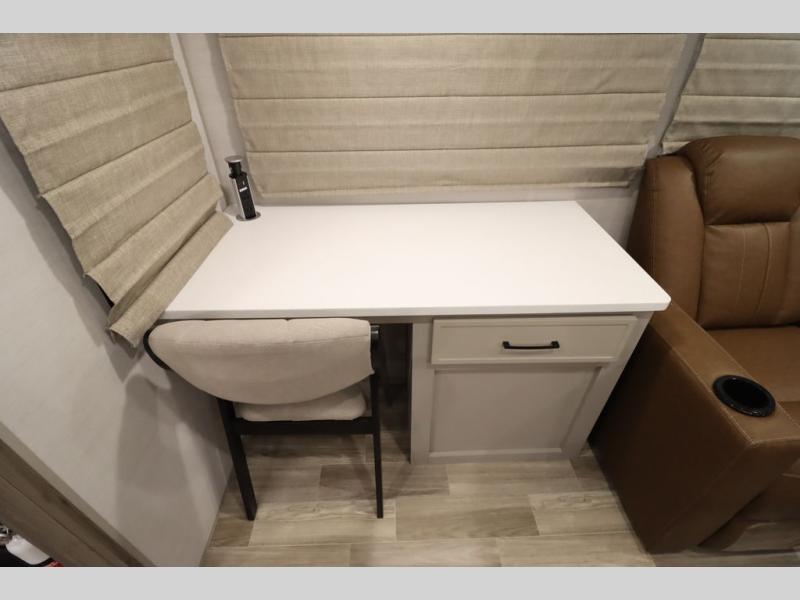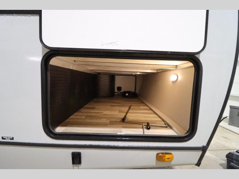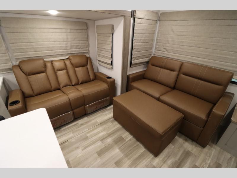 This travel trailer allows you to enjoy the great outdoors without having to give up your creature comforts. The dual opposing slides provide the chef space to work around the kitchen island, and there is plenty of seating space for your guests on the theater seating or the sleeper sofa, plus there's a desk area with chair so you can work on the go. The fireplace with a TV above will be perfect for those rainy days, and there is even a large skylight to let natural light into the living room. This model also includes Sure-Step entry steps, pass-through storage, plus two power awnings with LED lights so you can spend more time outdoors with friends and family!