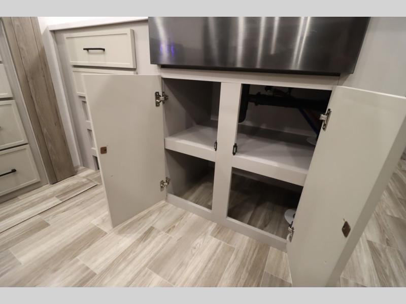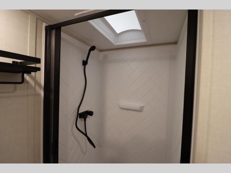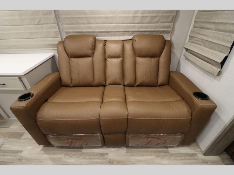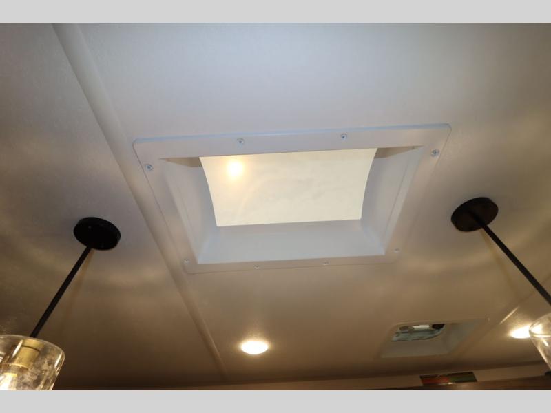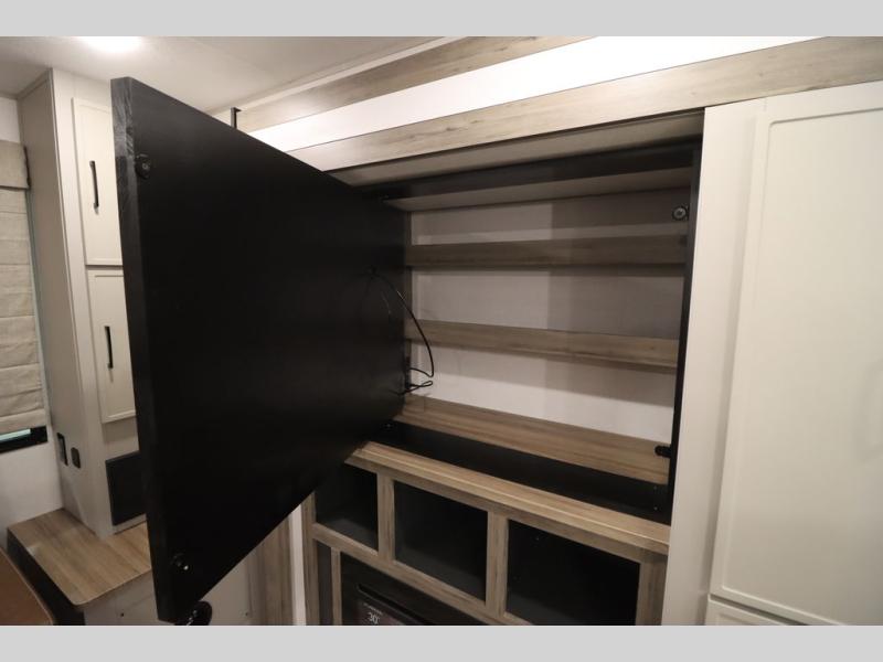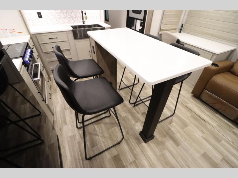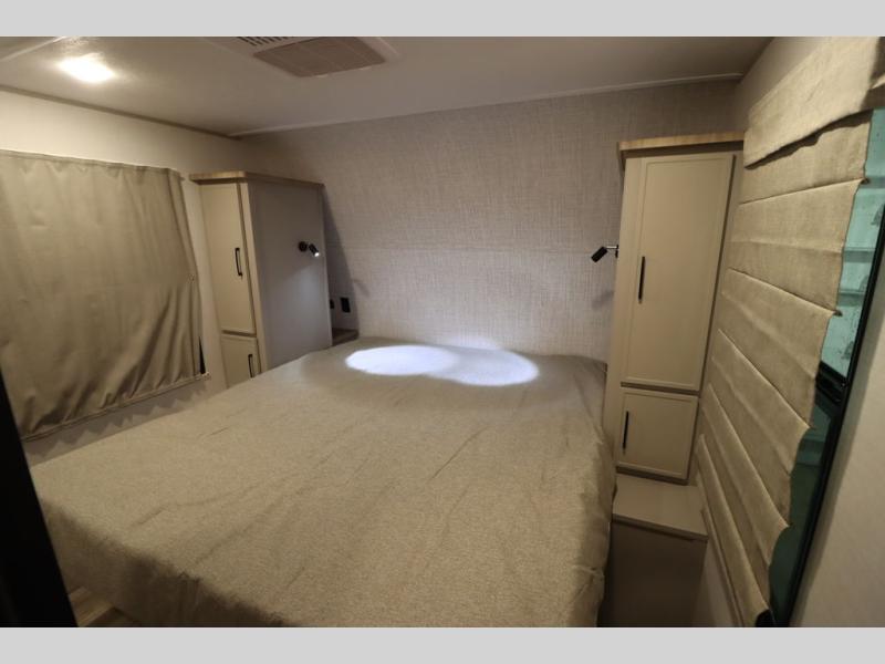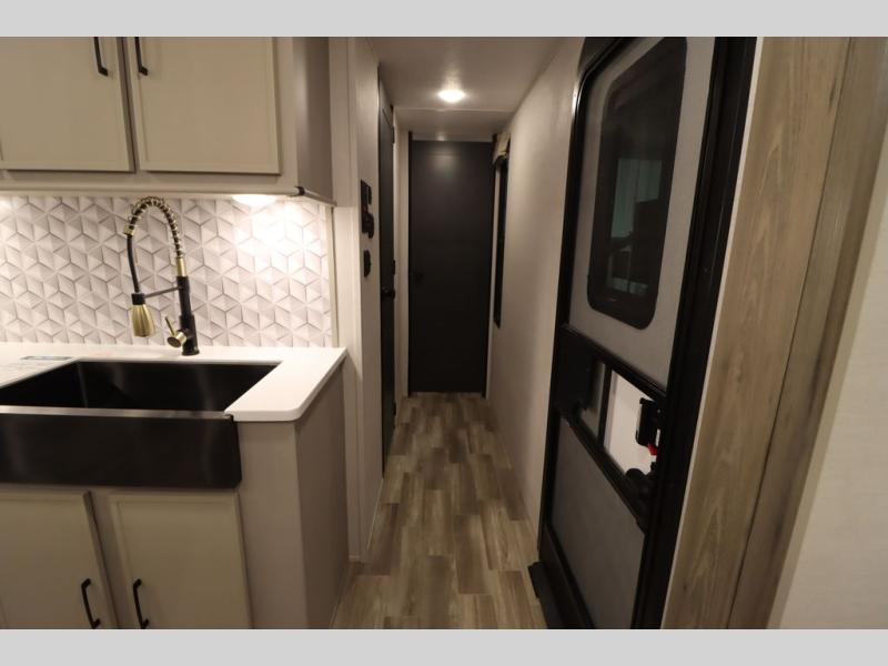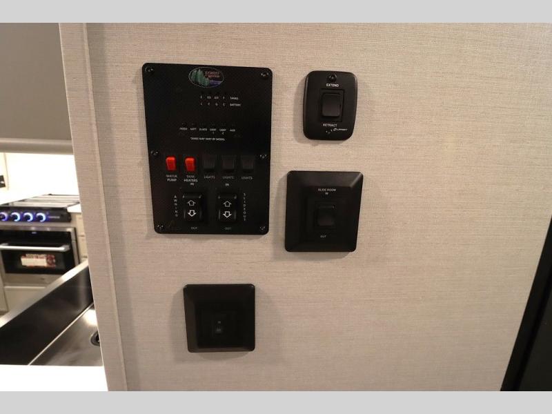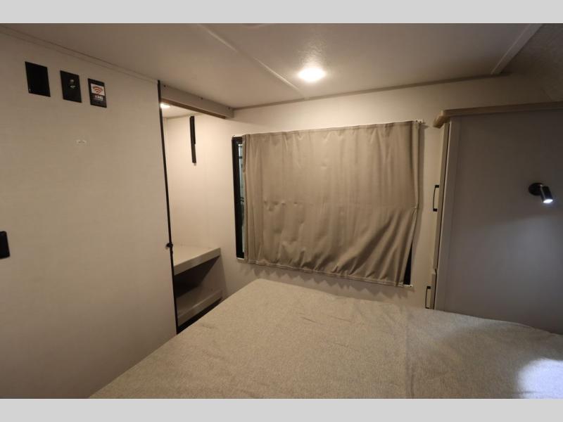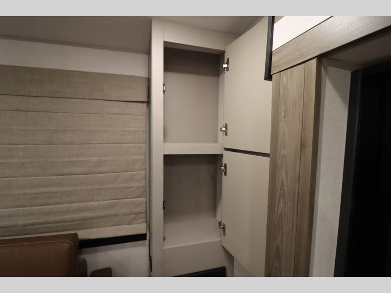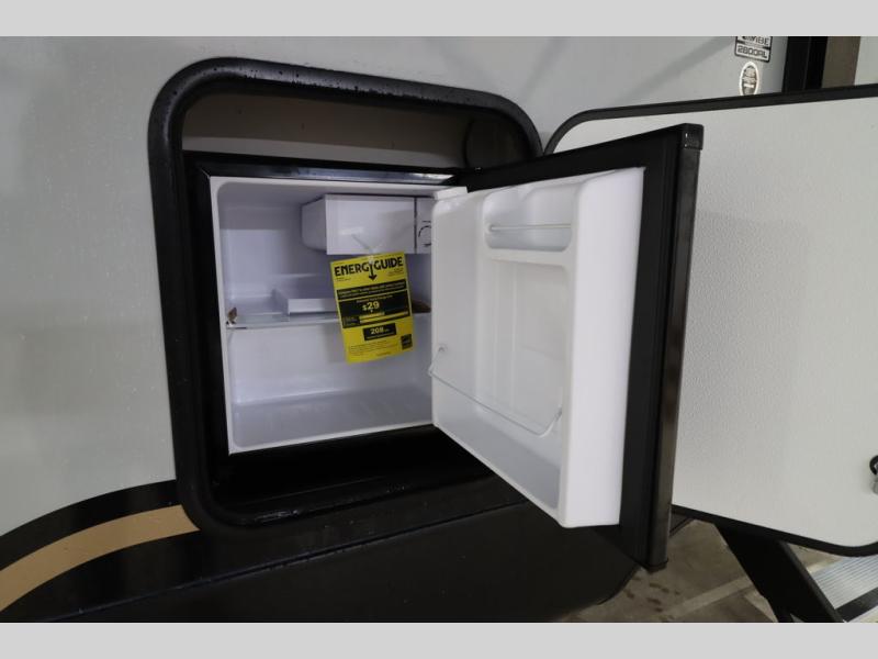 This travel trailer allows you to enjoy the great outdoors without having to give up your creature comforts. The dual opposing slides provide the chef space to work around the kitchen island, and there is plenty of seating space for your guests on the theater seating or the sleeper sofa, plus there's a desk area with chair so you can work on the go. The fireplace with a TV above will be perfect for those rainy days, and there is even a large skylight to let natural light into the living room. This model also includes Sure-Step entry steps, pass-through storage, plus two power awnings with LED lights so you can spend more time outdoors with friends and family!