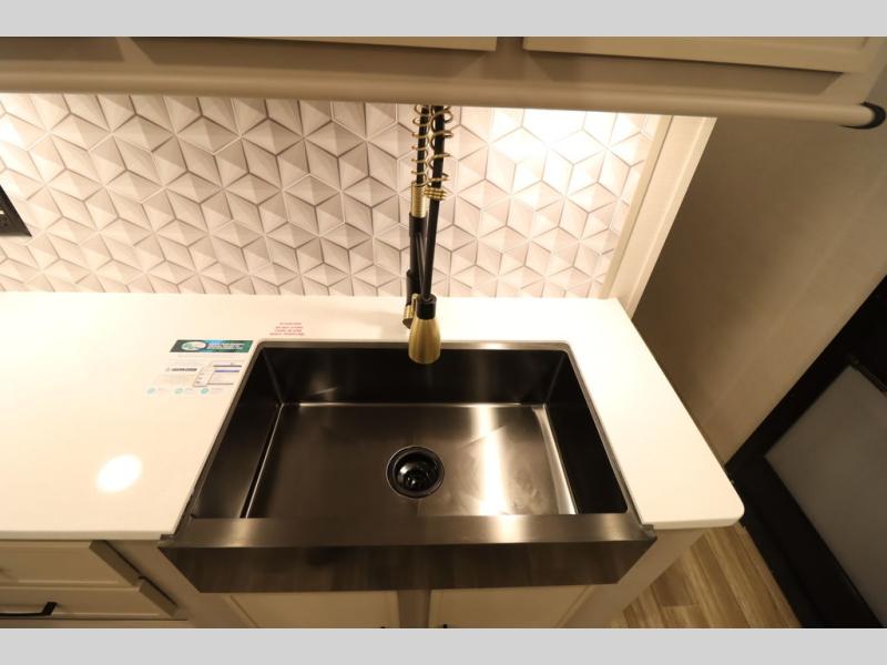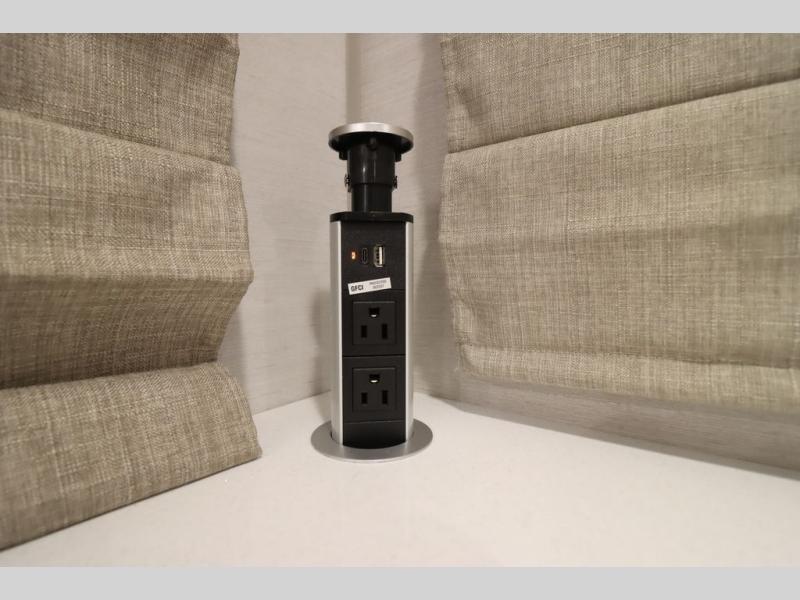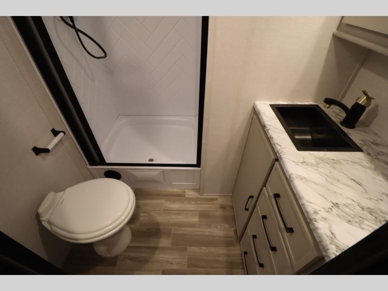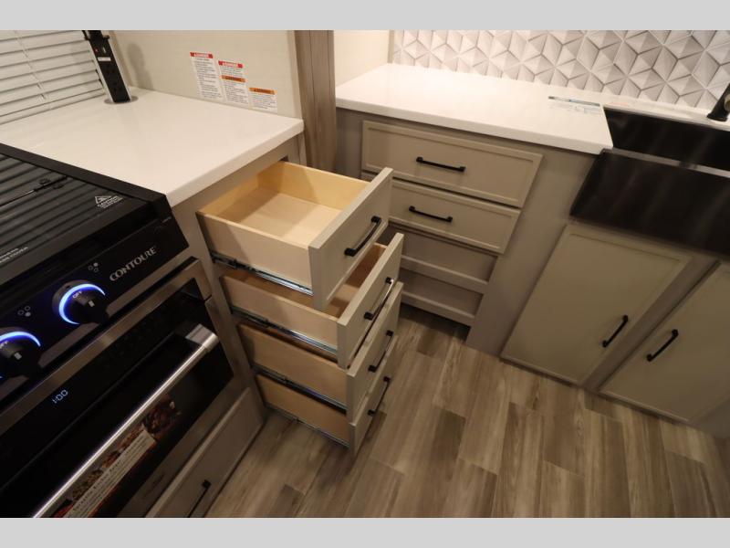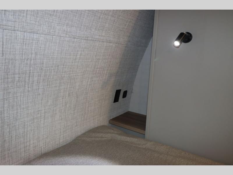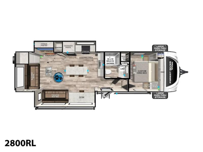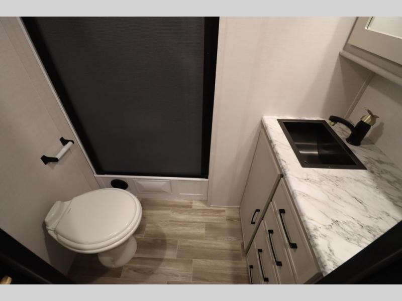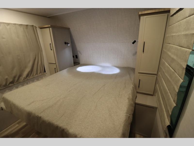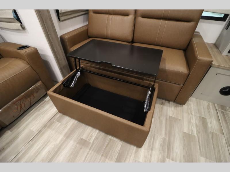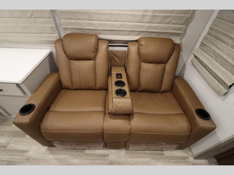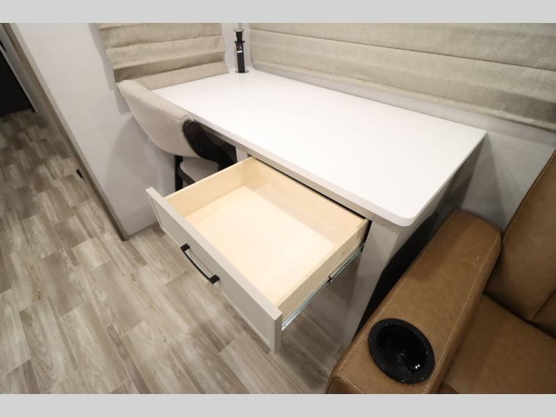 This travel trailer allows you to enjoy the great outdoors without having to give up your creature comforts. The dual opposing slides provide the chef space to work around the kitchen island, and there is plenty of seating space for your guests on the theater seating or the sleeper sofa, plus there's a desk area with chair so you can work on the go. The fireplace with a TV above will be perfect for those rainy days, and there is even a large skylight to let natural light into the living room. This model also includes Sure-Step entry steps, pass-through storage, plus two power awnings with LED lights so you can spend more time outdoors with friends and family!