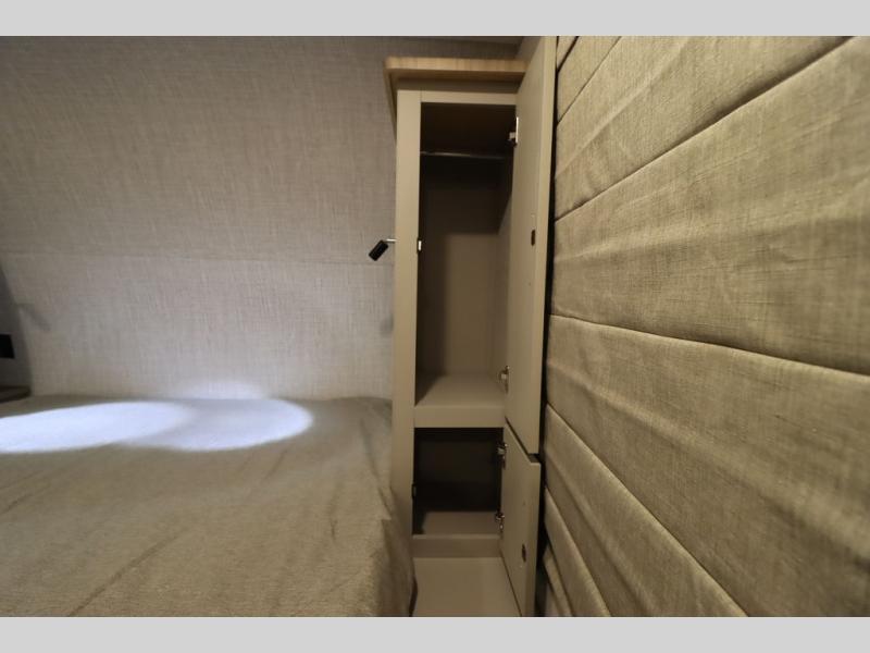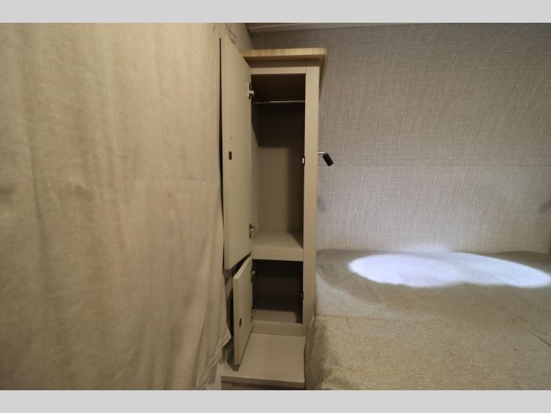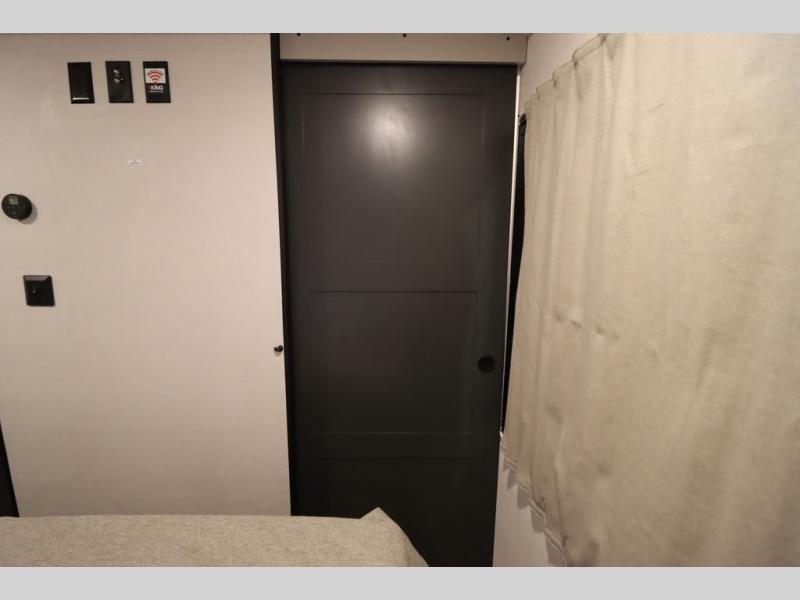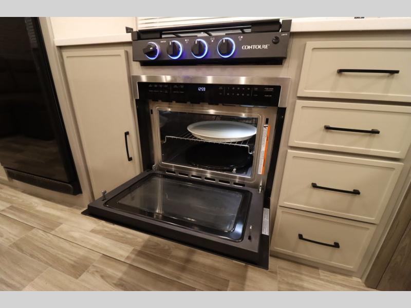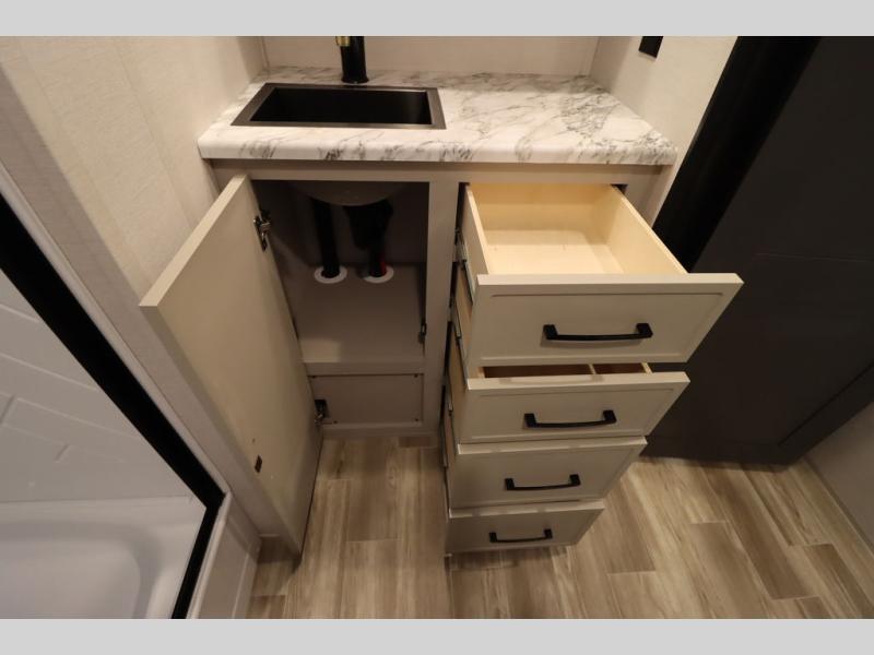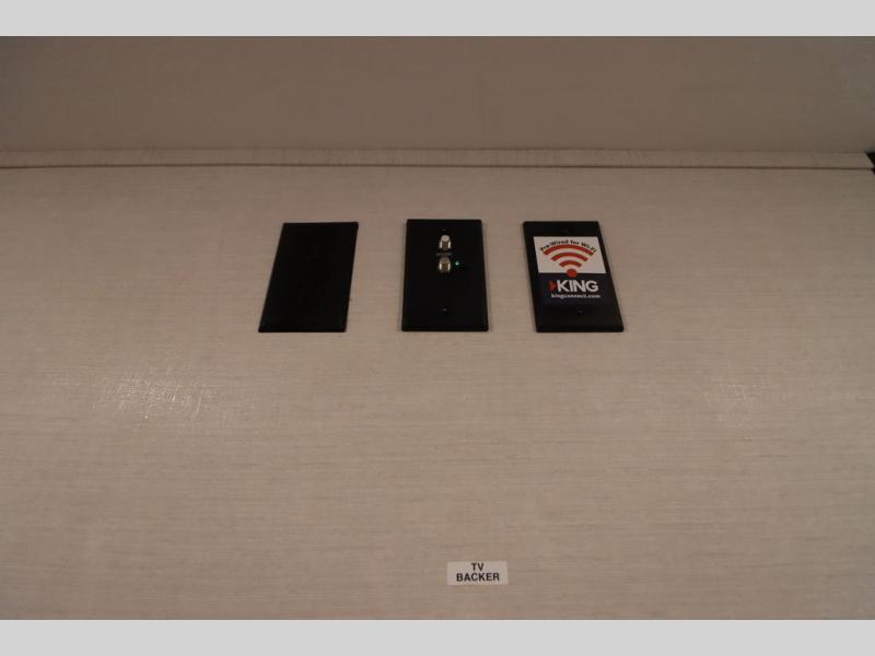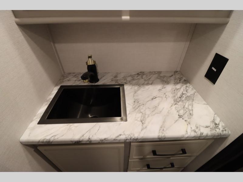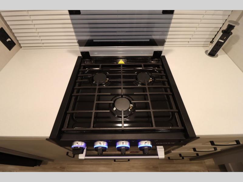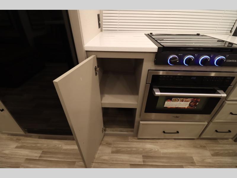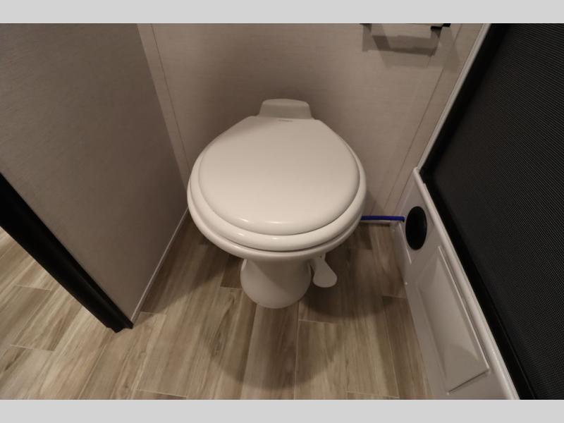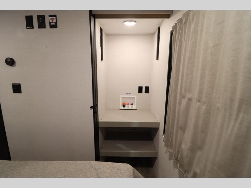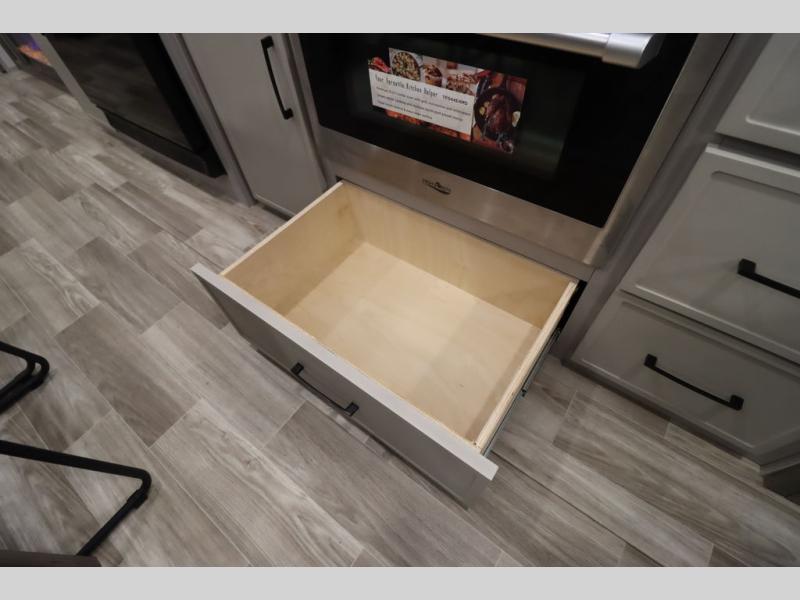 This travel trailer allows you to enjoy the great outdoors without having to give up your creature comforts. The dual opposing slides provide the chef space to work around the kitchen island, and there is plenty of seating space for your guests on the theater seating or the sleeper sofa, plus there's a desk area with chair so you can work on the go. The fireplace with a TV above will be perfect for those rainy days, and there is even a large skylight to let natural light into the living room. This model also includes Sure-Step entry steps, pass-through storage, plus two power awnings with LED lights so you can spend more time outdoors with friends and family!