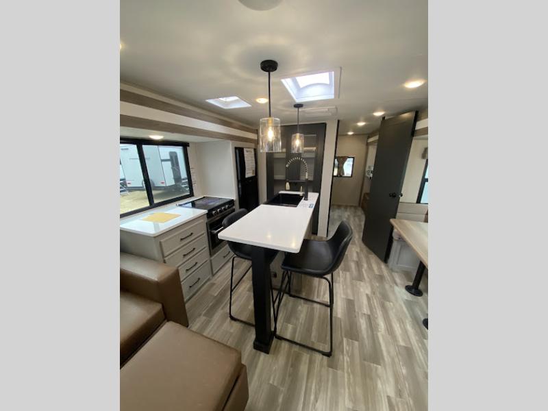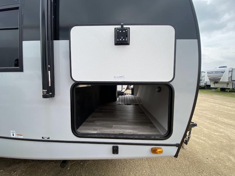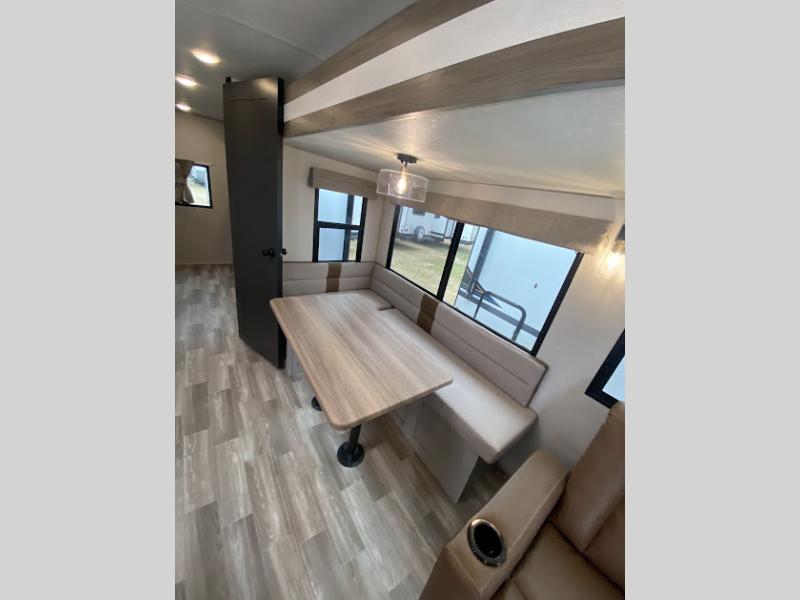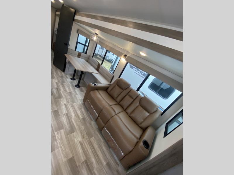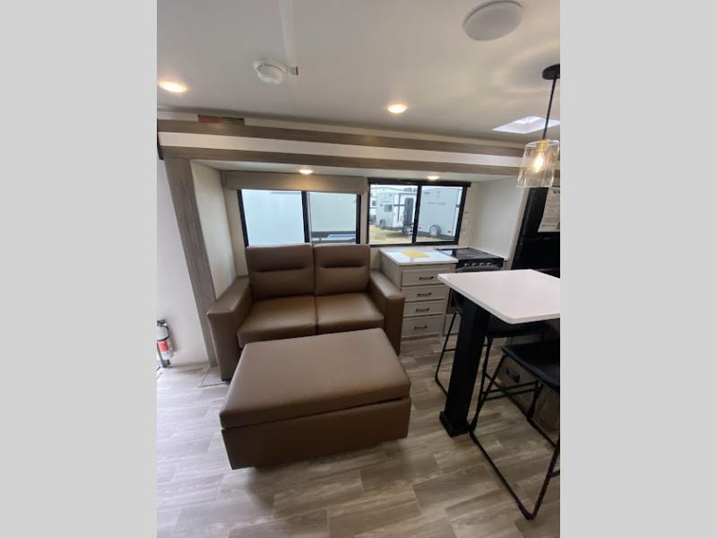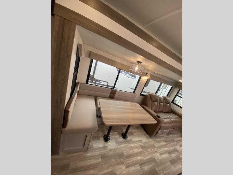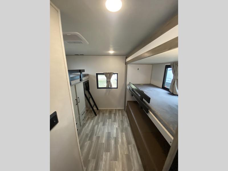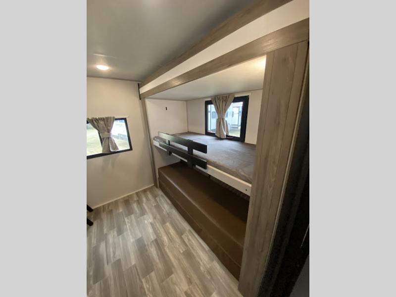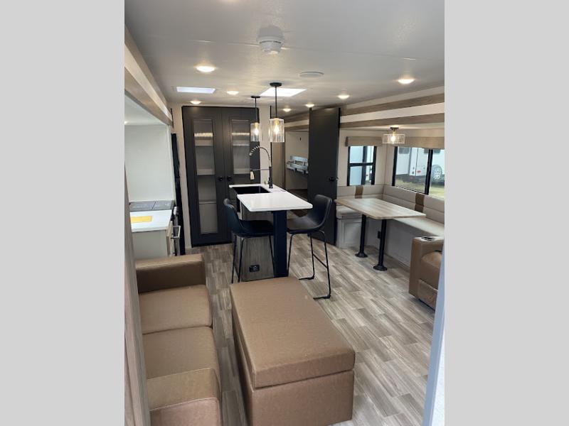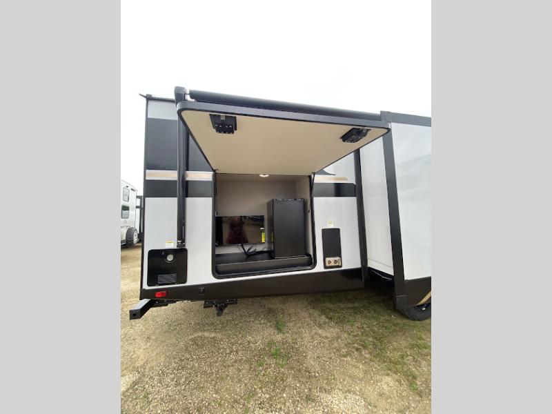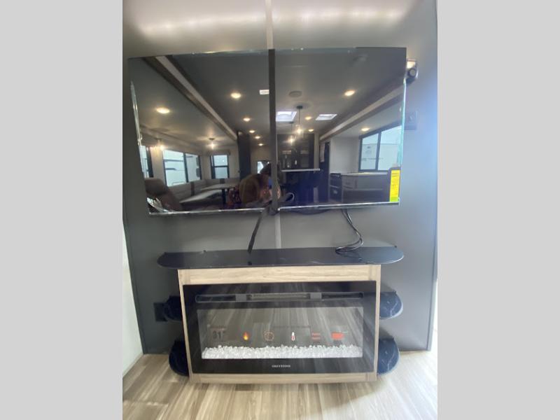 Whether you enjoy spending time outdoors or indoors, there is something for everyone in this travel trailer. The large pass-through storage can store your fishing poles, and the 20' electric awning with LED lights will create an outdoor living space. There is even an outdoor refrigerator with an outside storage cabinet and 32" TV! You will love all the interior space thanks to the dual opposing slides in the main living area, which will give the chef space to work around the kitchen island. Your crew can visit on the tri-fold sofa, theater seating and 5-person dinette while the fireplace is going, but you'll probably find the kids spending most of their time in the private bunkhouse! What more could you want in a travel trailer?!