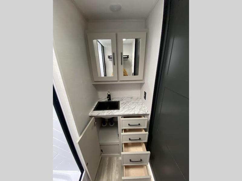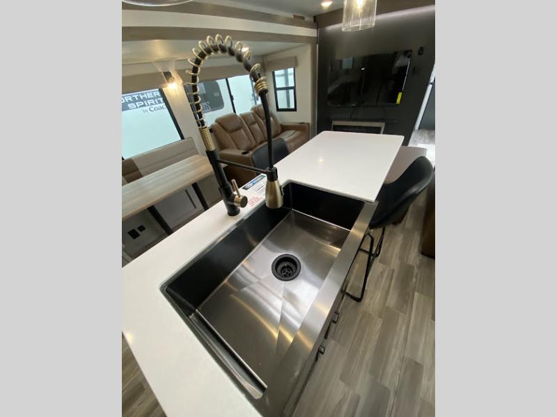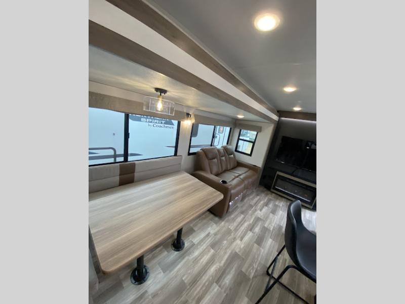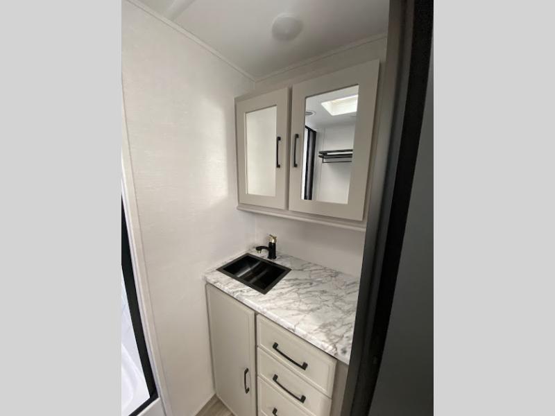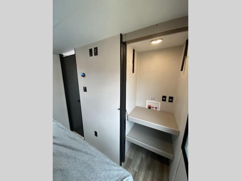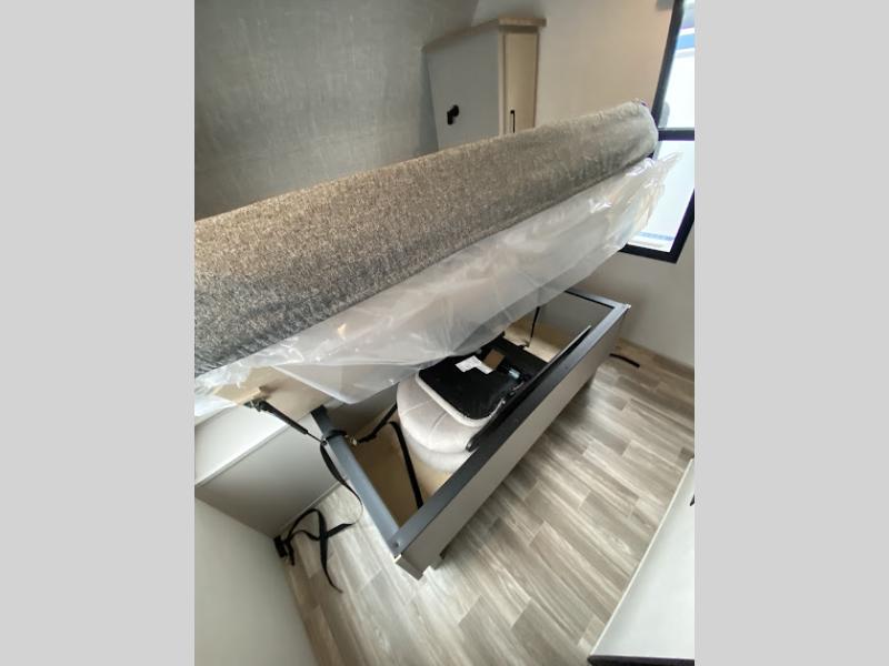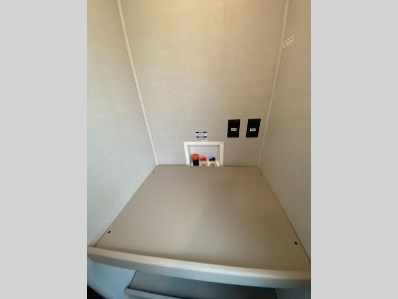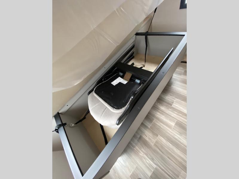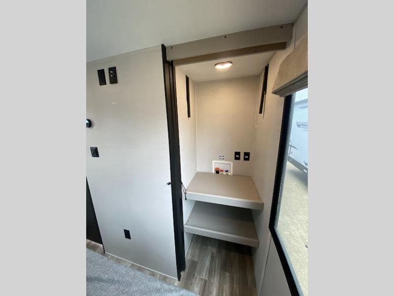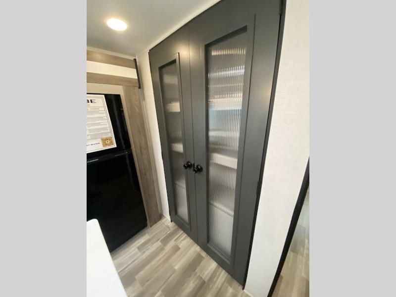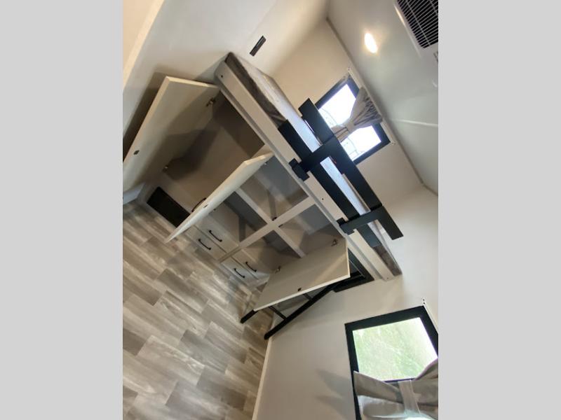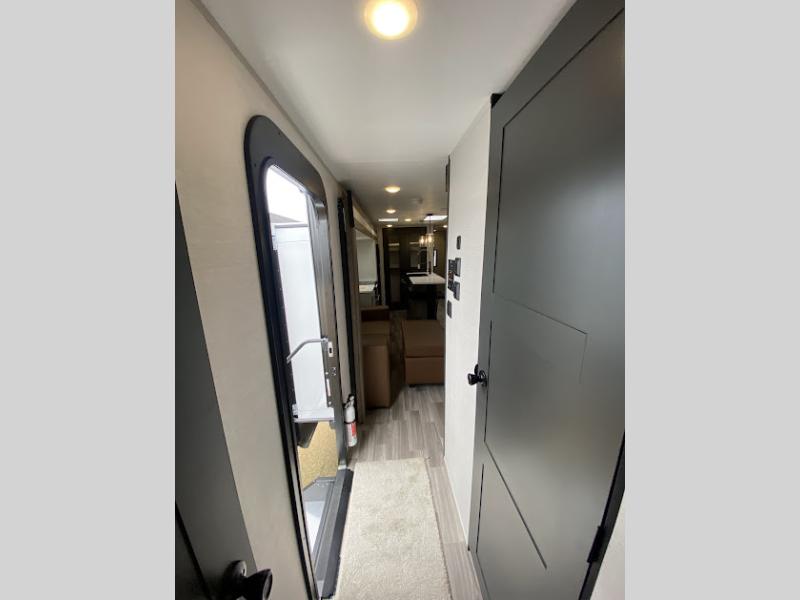 Whether you enjoy spending time outdoors or indoors, there is something for everyone in this travel trailer. The large pass-through storage can store your fishing poles, and the 20' electric awning with LED lights will create an outdoor living space. There is even an outdoor refrigerator with an outside storage cabinet and 32" TV! You will love all the interior space thanks to the dual opposing slides in the main living area, which will give the chef space to work around the kitchen island. Your crew can visit on the tri-fold sofa, theater seating and 5-person dinette while the fireplace is going, but you'll probably find the kids spending most of their time in the private bunkhouse! What more could you want in a travel trailer?!