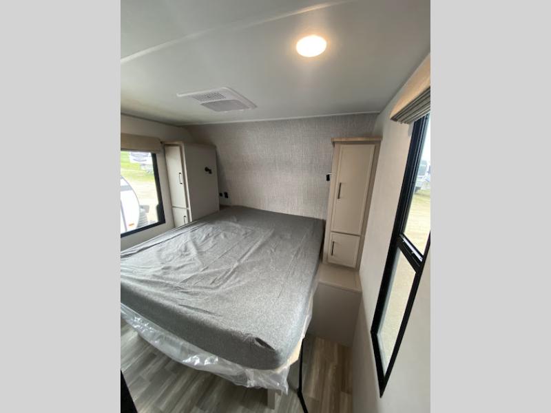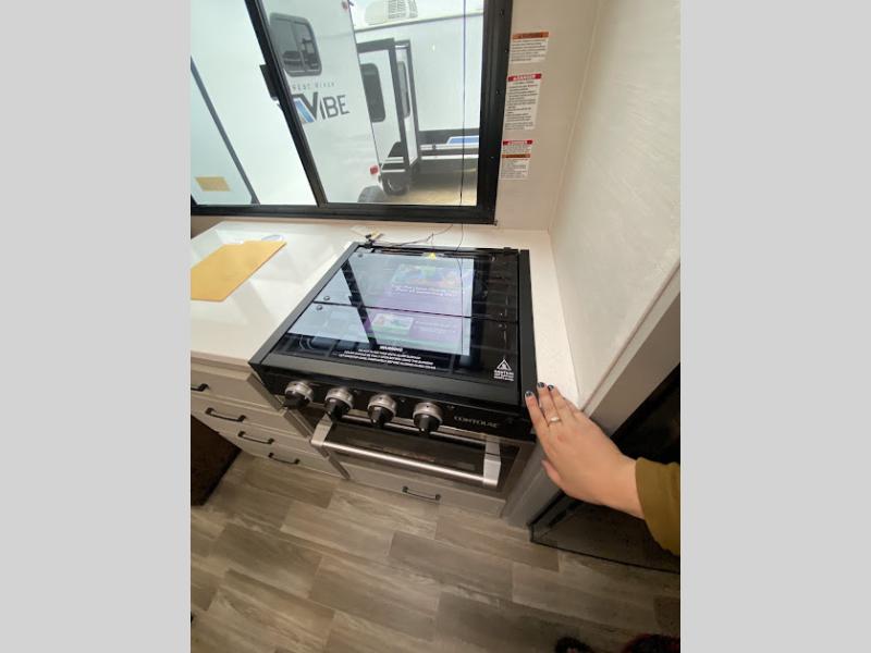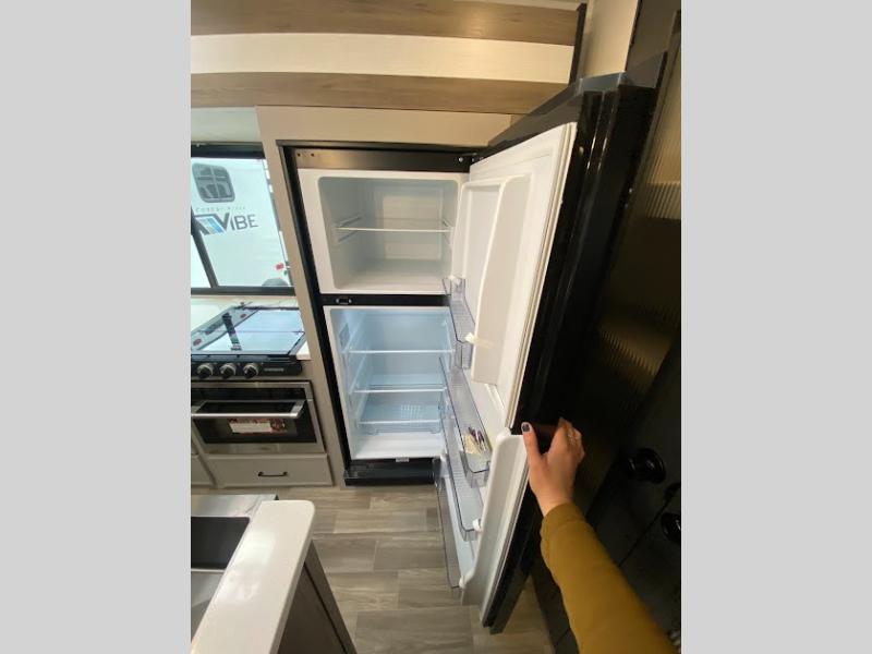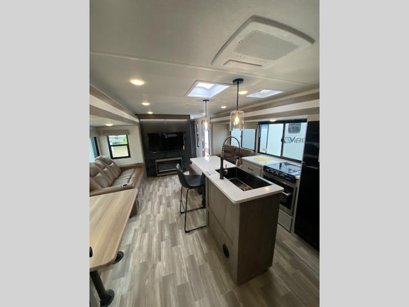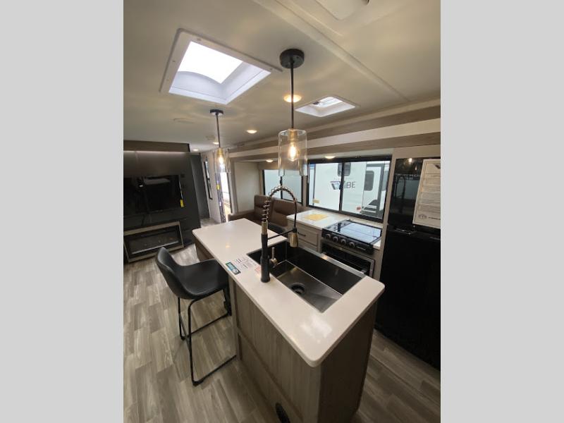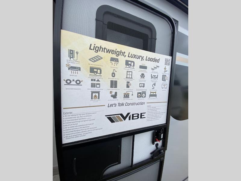 With any Vibe travel trailer by Forest River, you will enjoy comfort at every turn! There is a Norco huck-bolted steel frame, an enclosed underbelly with 12V heating pads, and a PVC roof membrane for added durability. You will also find a universal docking station outside, along with slam latch doors, European style square windows, and an automotive painted front cap. Head inside to enjoy the premium residential-style furniture, decorative window treatments, privacy shades in the living room and bedroom, and many more comforts!