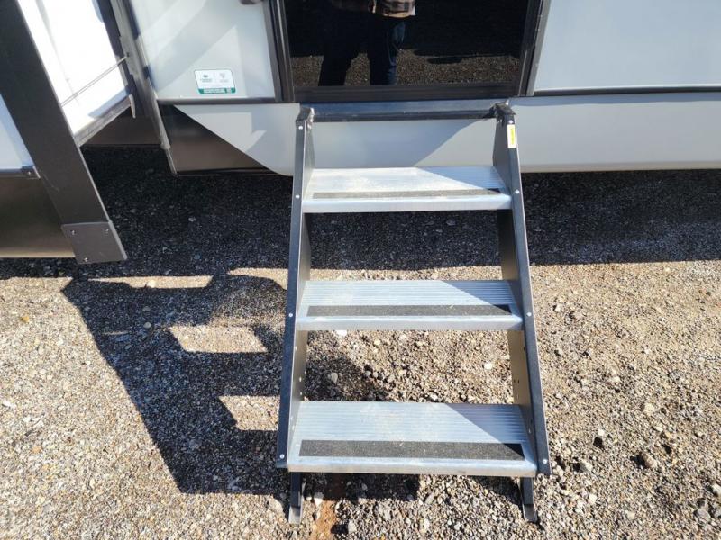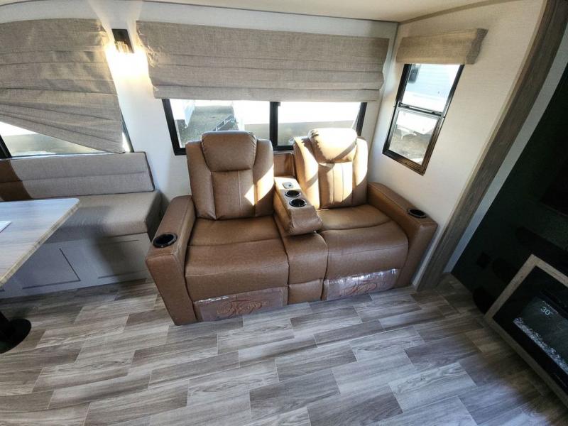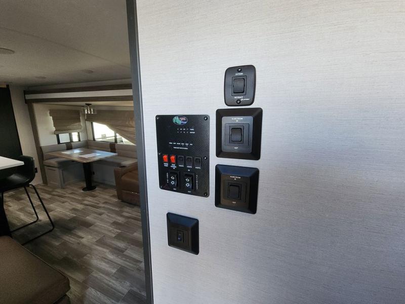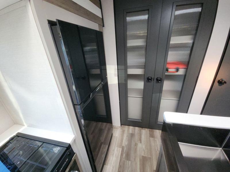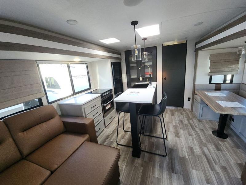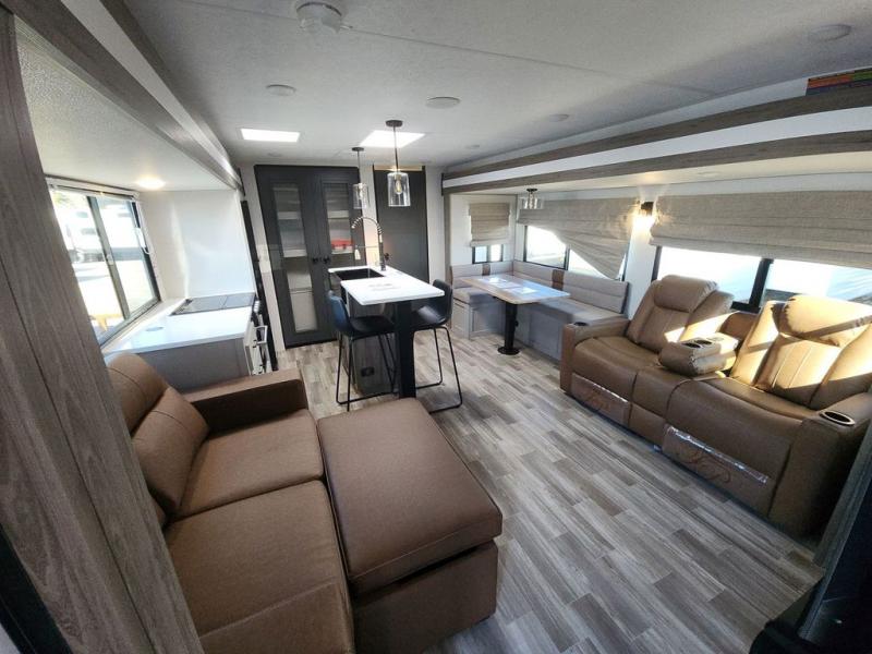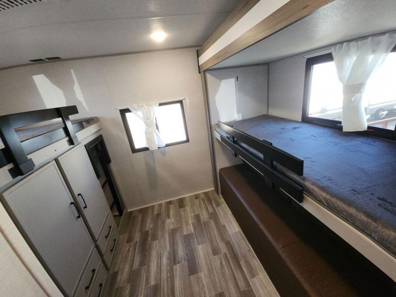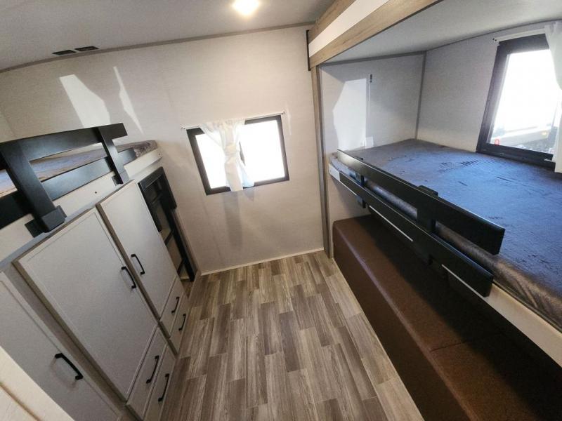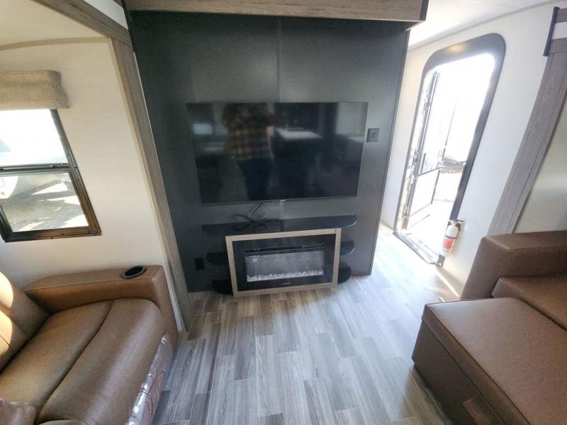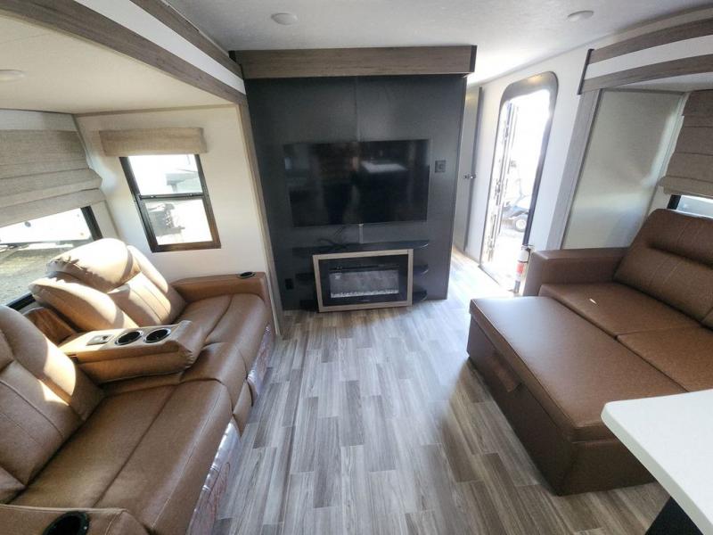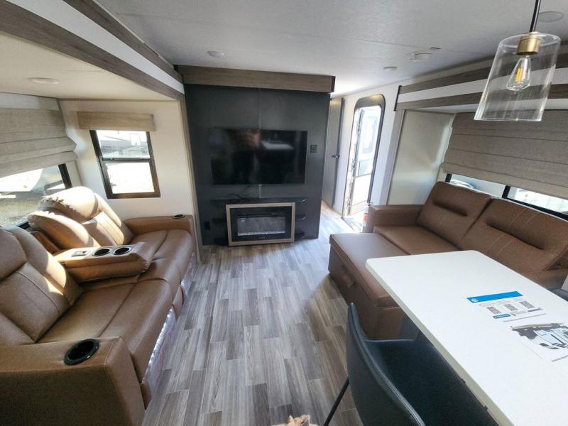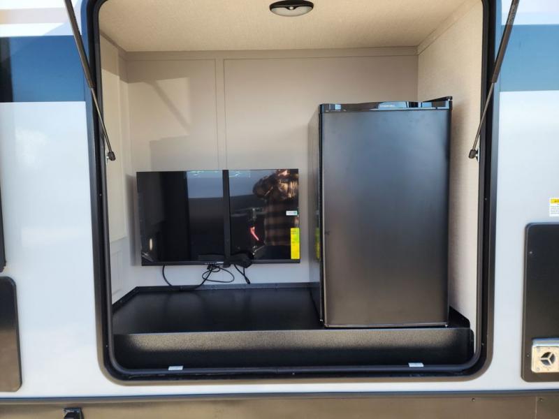 Whether you enjoy spending time outdoors or indoors, there is something for everyone in this travel trailer. The large pass-through storage can store your fishing poles, and the 20' electric awning with LED lights will create an outdoor living space. There is even an exterior baggage door with two exterior refrigerators, a TV, a spray port, and storage for snacks! You will love all the interior space thanks to the dual opposing slides in the main living area, which will give the chef space to work around the kitchen island. Your crew can visit on the tri-fold sofa, theater seating and booth dinette while the fireplace is going, but you'll probably find the kids spending most of their time in the private bunkhouse! What more could you want in a travel trailer?!