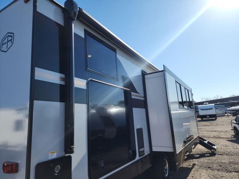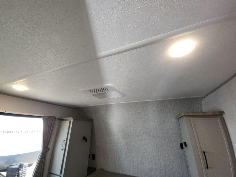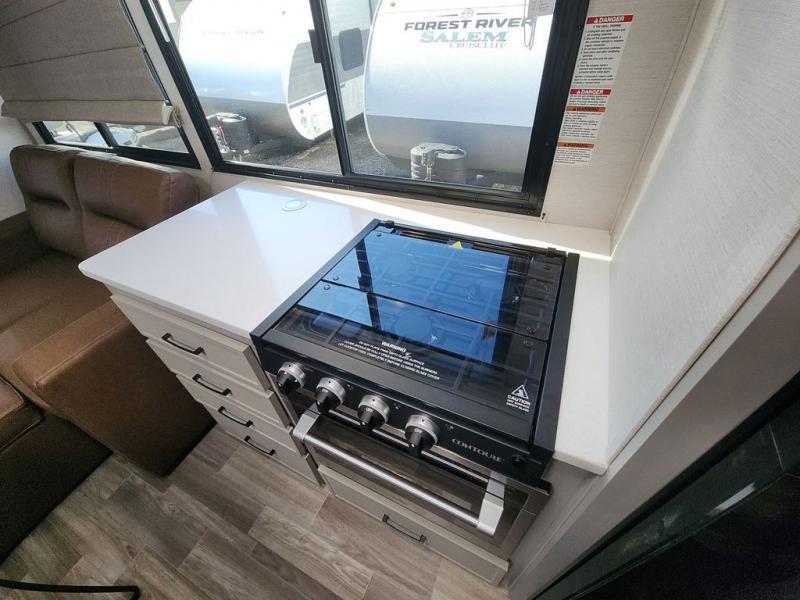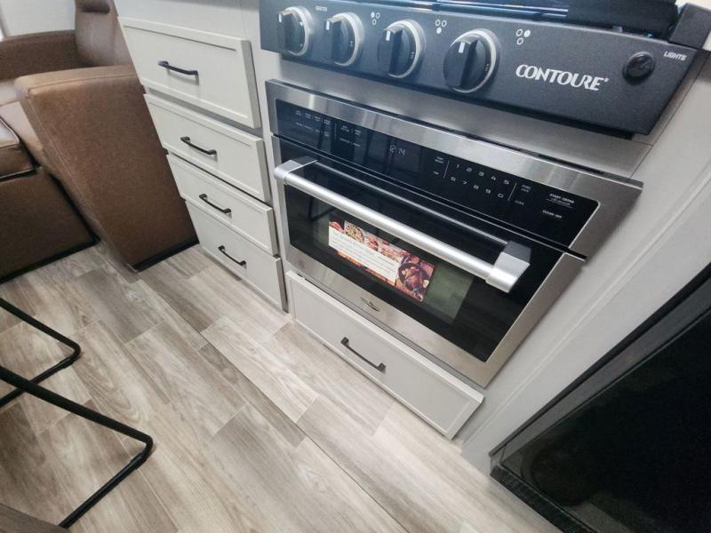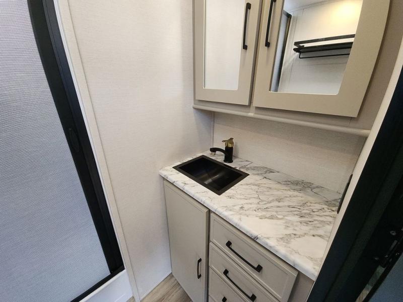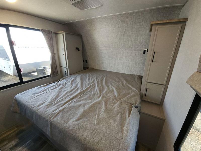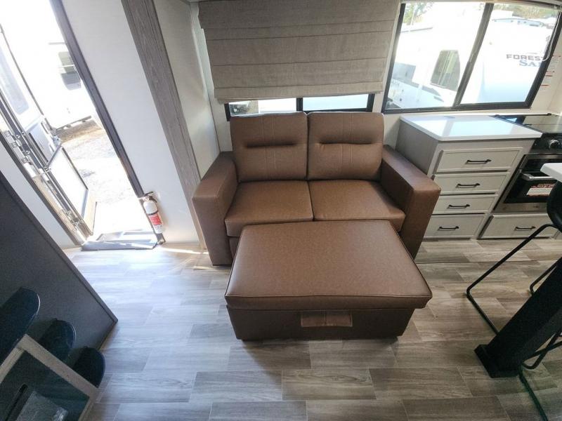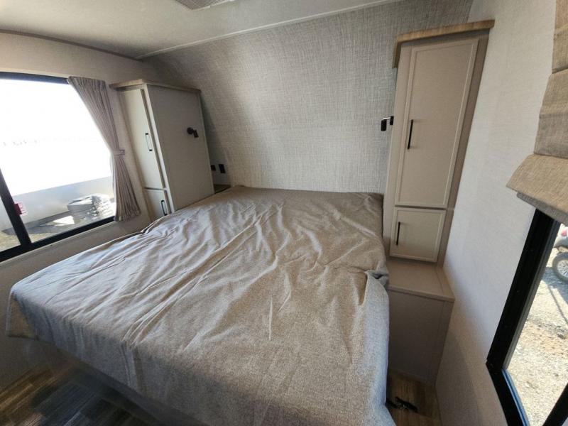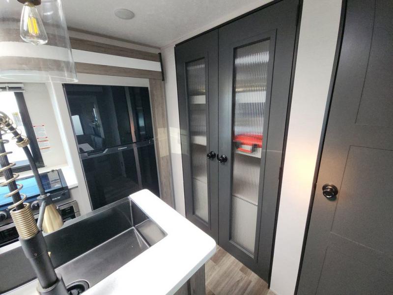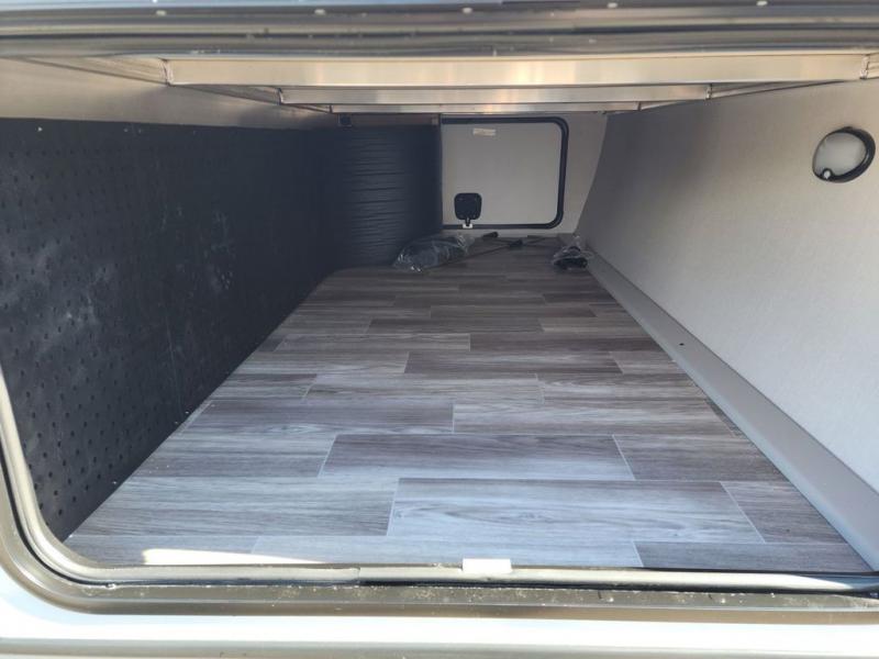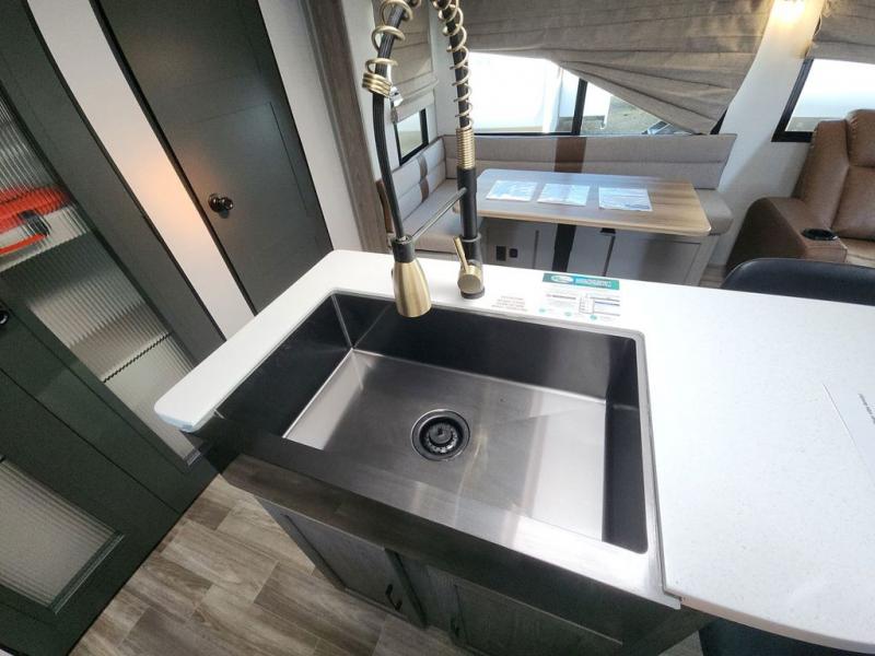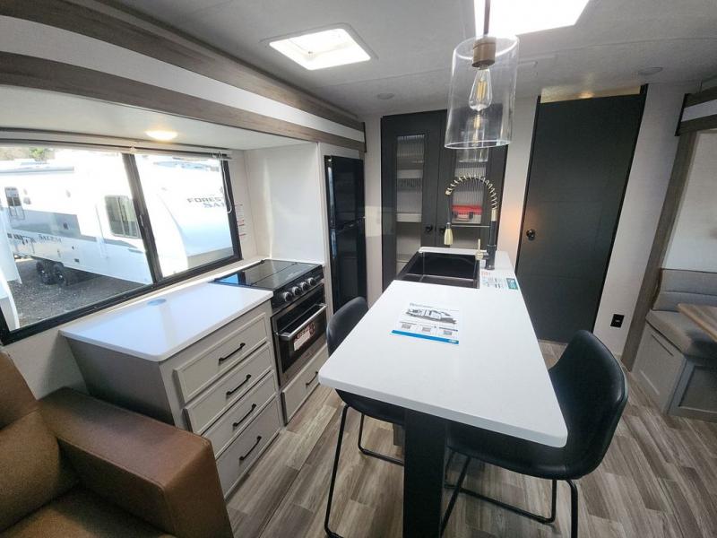 Whether you enjoy spending time outdoors or indoors, there is something for everyone in this travel trailer. The large pass-through storage can store your fishing poles, and the 20' electric awning with LED lights will create an outdoor living space. There is even an exterior baggage door with two exterior refrigerators, a TV, a spray port, and storage for snacks! You will love all the interior space thanks to the dual opposing slides in the main living area, which will give the chef space to work around the kitchen island. Your crew can visit on the tri-fold sofa, theater seating and booth dinette while the fireplace is going, but you'll probably find the kids spending most of their time in the private bunkhouse! What more could you want in a travel trailer?!