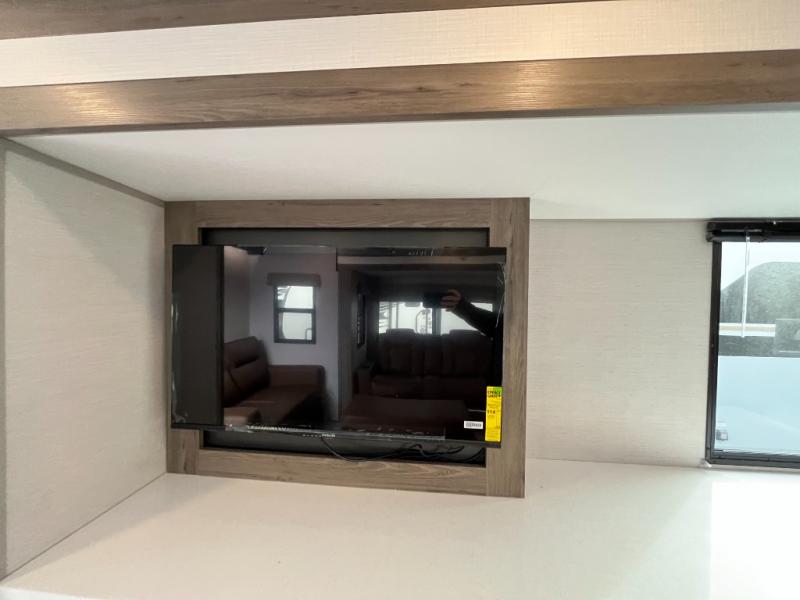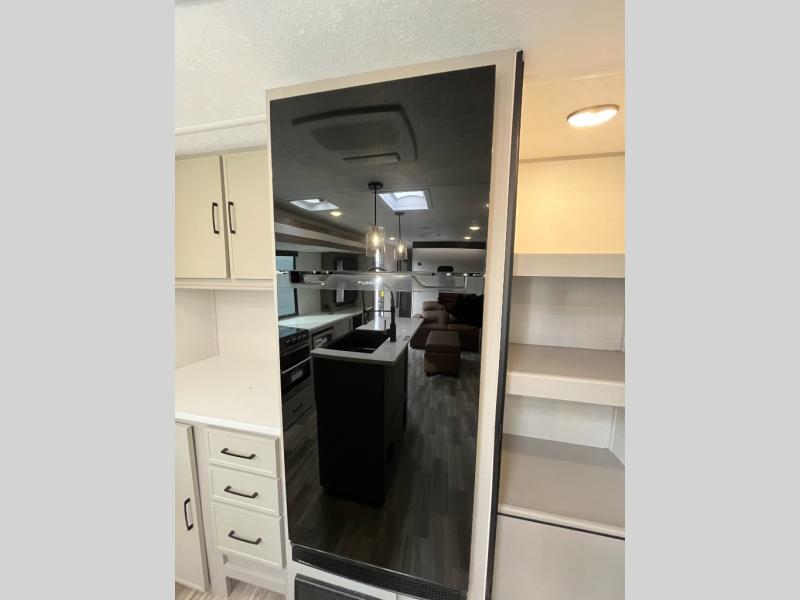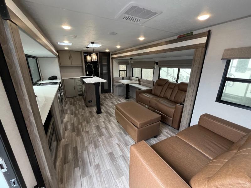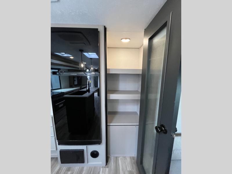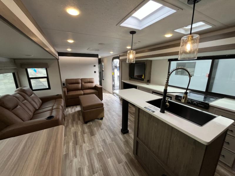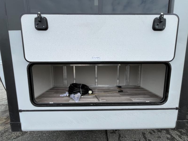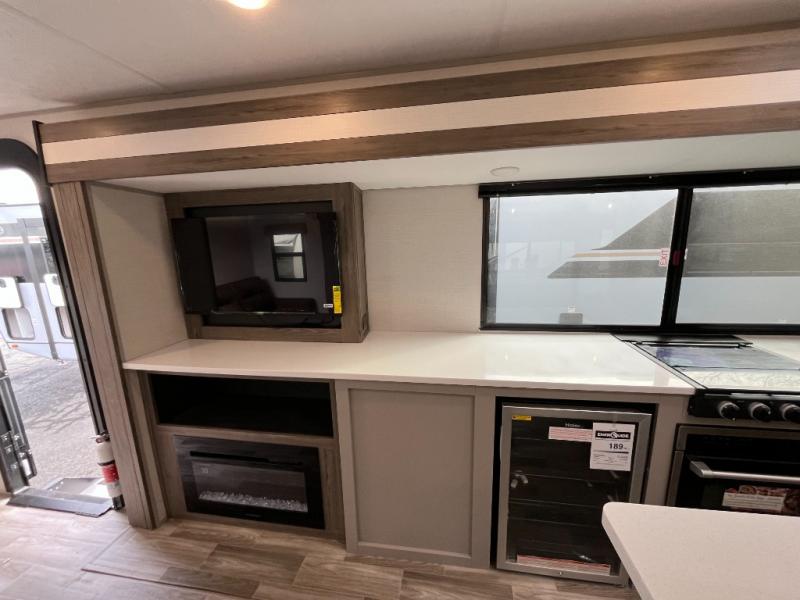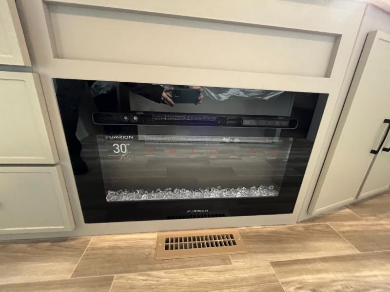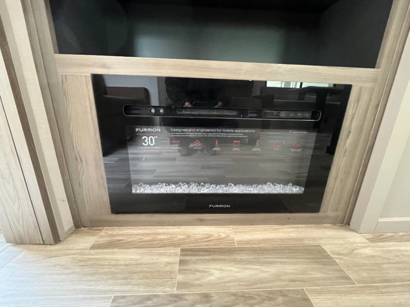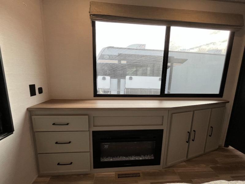 You won't believe all that this travel trailer has to offer! If you need to get some work done then you can utilize the flip-up desk next to the oversized refrigerator and large pantry. The kitchen island makes meal prepping easier, and the beverage cooler helps save space in your refrigerator for perishables. The kitchen skylight brings in natural lighting. Relax each night on either the tri-fold sofa or theater seating across from the entertainment center with a fireplace, or you can play some games at the booth dinette. As you enter the bathroom, you will notice the washer and dryer prep that will give you the ability to add these appliances. The front private bedroom has a custom king bed slide with nightstands on either side with power to charge your electronics while you recharge. The exterior not only has pass-through storage and two awnings, but also a 48" x 48" baggage door!