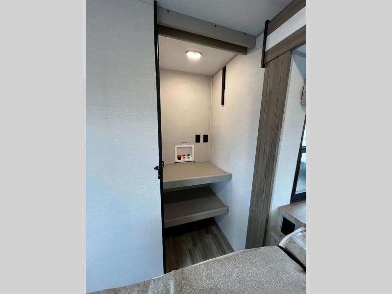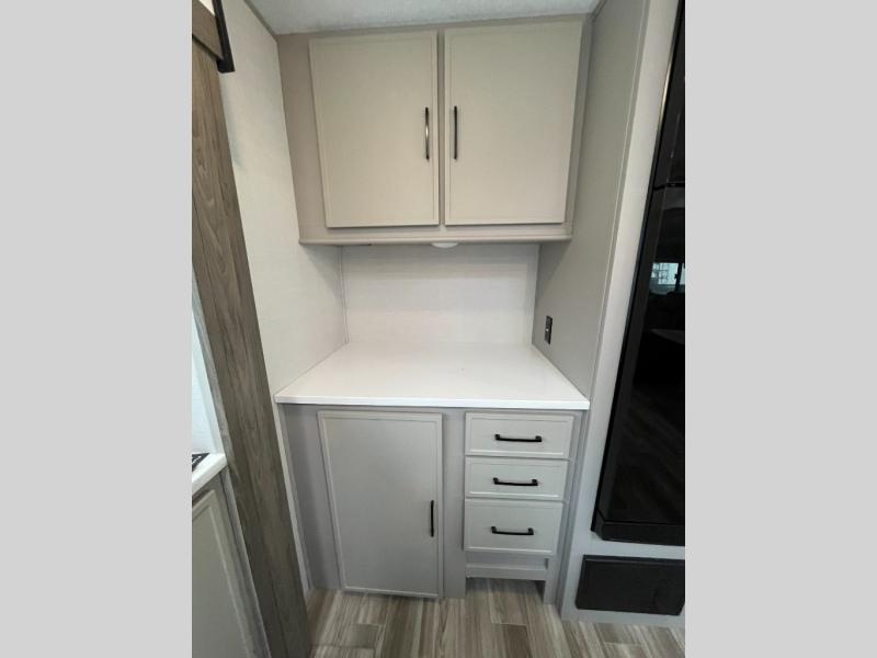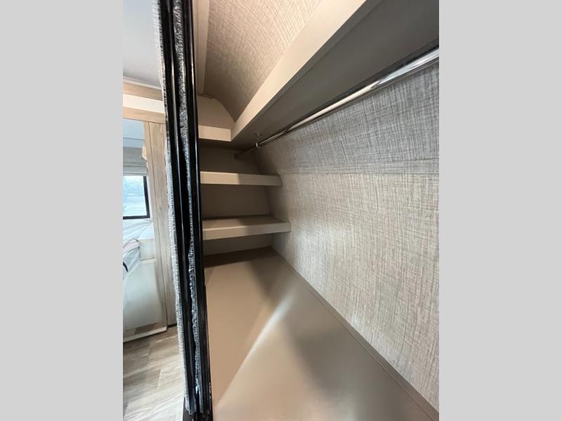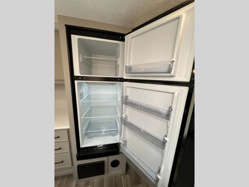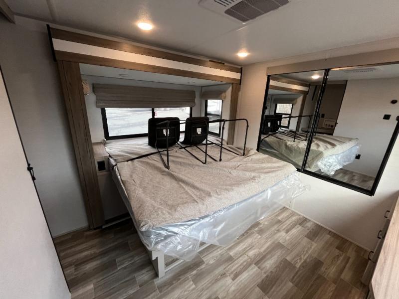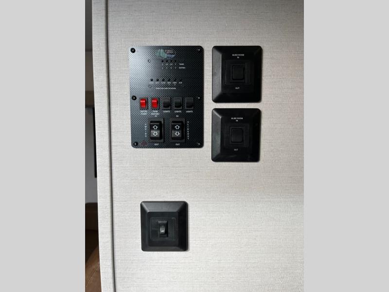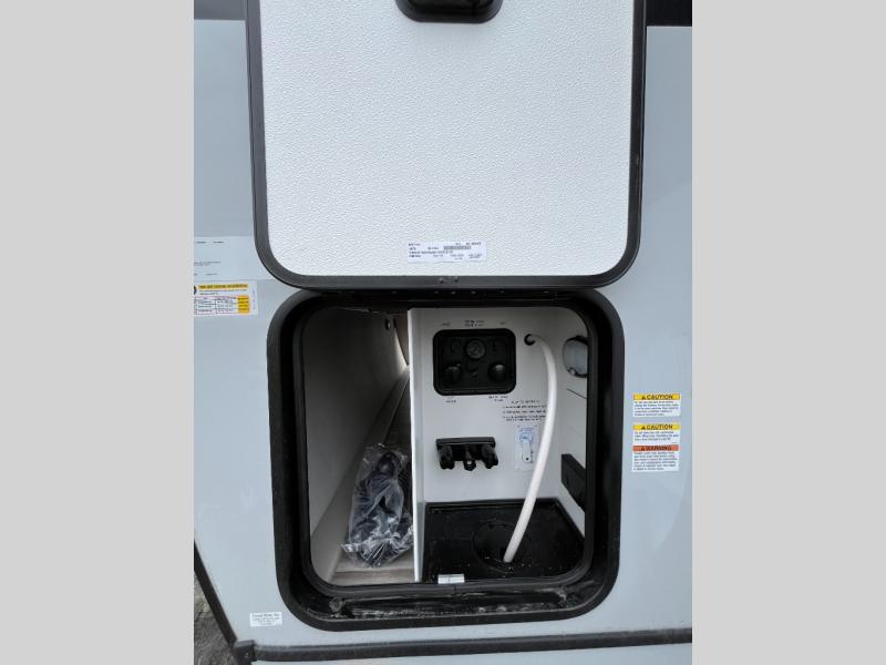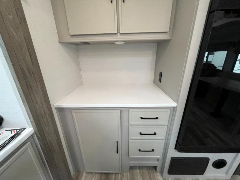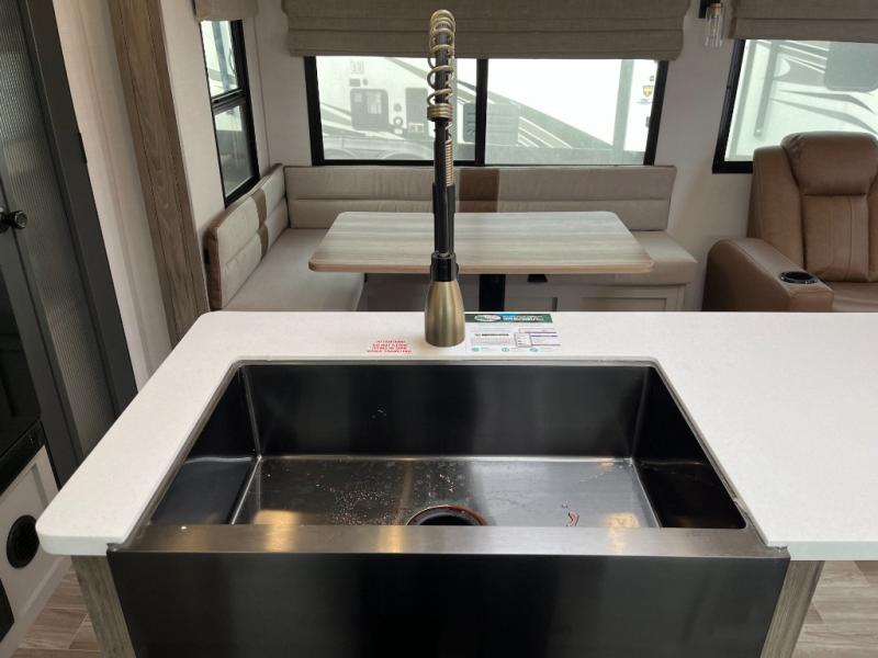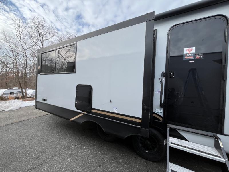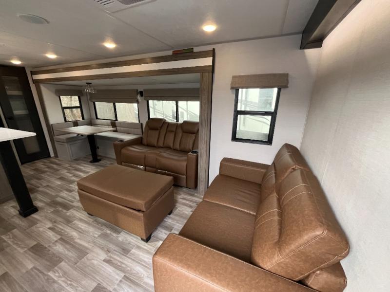 You won't believe all that this travel trailer has to offer! If you need to get some work done then you can utilize the flip-up desk next to the oversized refrigerator and large pantry. The kitchen island makes meal prepping easier, and the beverage cooler helps save space in your refrigerator for perishables. The kitchen skylight brings in natural lighting. Relax each night on either the tri-fold sofa or theater seating across from the entertainment center with a fireplace, or you can play some games at the booth dinette. As you enter the bathroom, you will notice the washer and dryer prep that will give you the ability to add these appliances. The front private bedroom has a custom king bed slide with nightstands on either side with power to charge your electronics while you recharge. The exterior not only has pass-through storage and two awnings, but also a 48" x 48" baggage door!