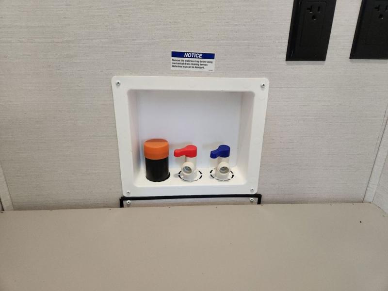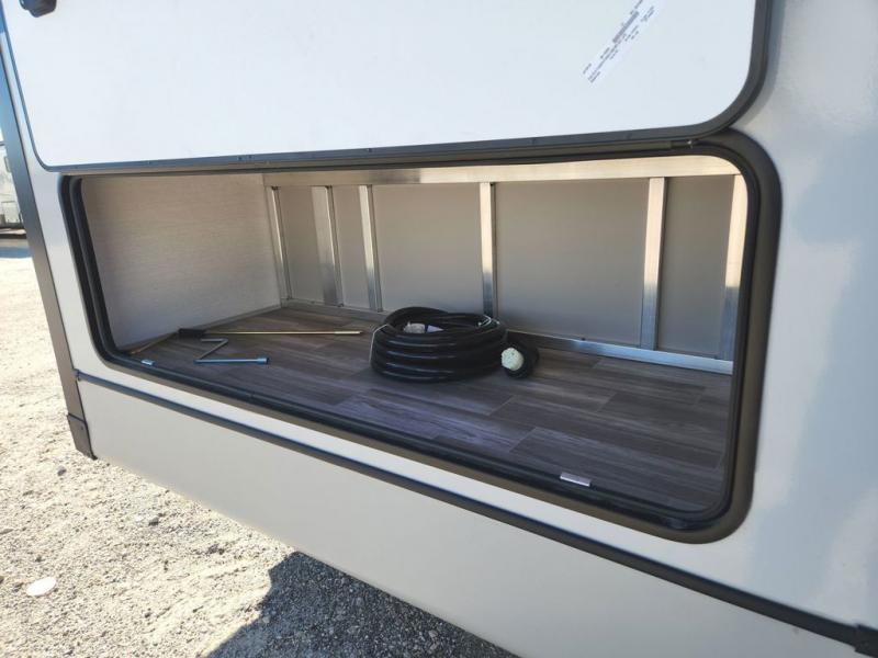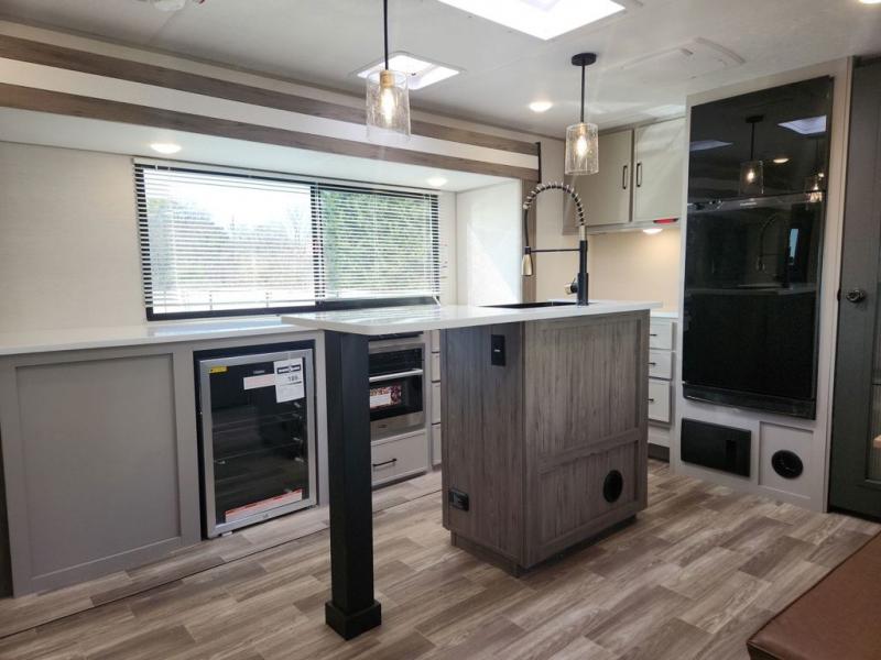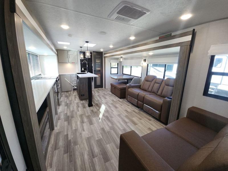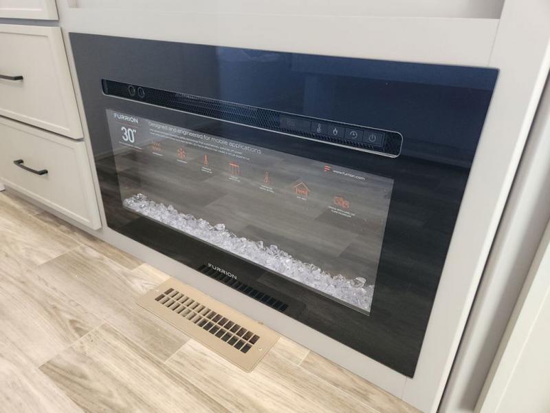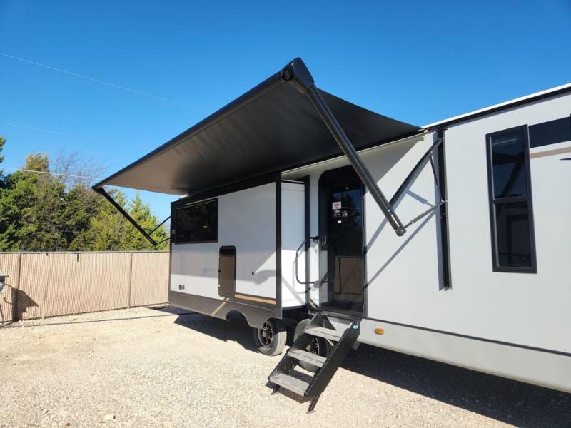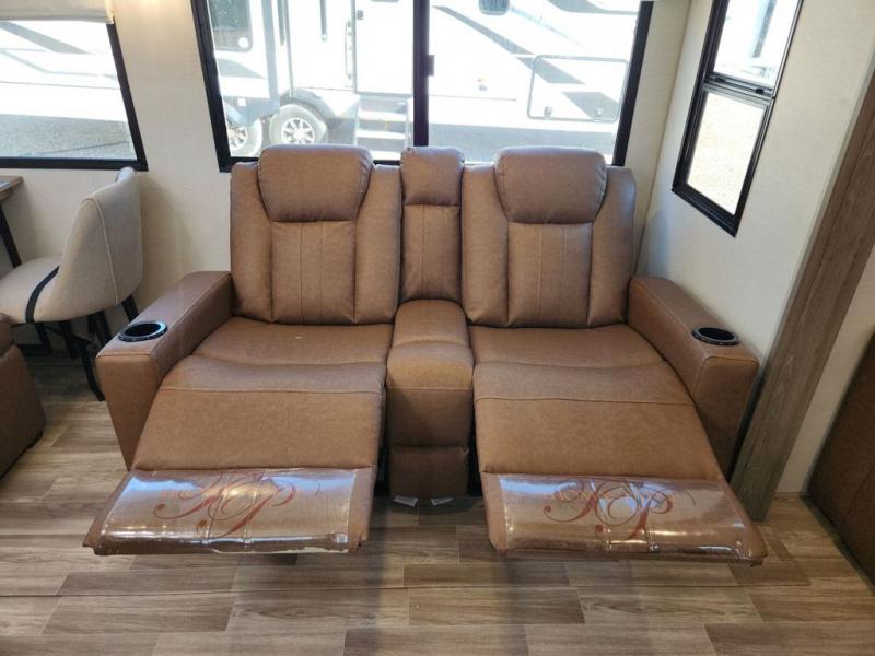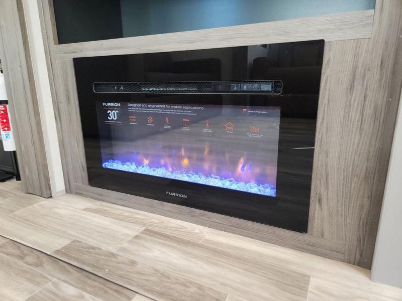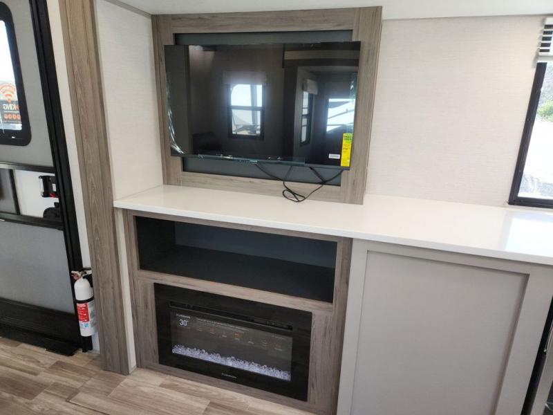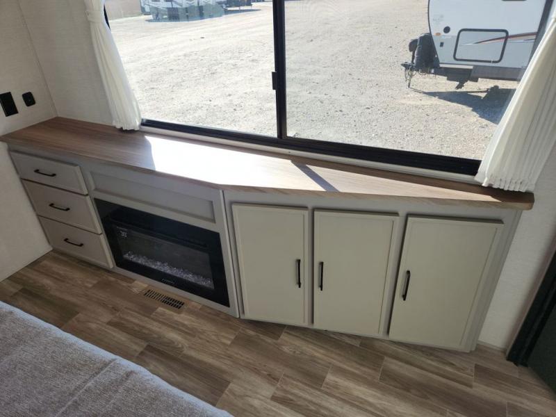 You won't believe all that this travel trailer has to offer! If you need to get some work done then you can utilize the flip-up desk next to the oversized refrigerator and large pantry. The kitchen island makes meal prepping easier, and the beverage cooler helps save space in your refrigerator for perishables. The kitchen skylight brings in natural lighting. Relax each night on either the tri-fold sofa or theater seating across from the entertainment center with a fireplace, or you can play some games at the booth dinette. As you enter the bathroom, you will notice the washer and dryer prep that will give you the ability to add these appliances. The front private bedroom has a custom king bed slide with nightstands on either side with power to charge your electronics while you recharge. The exterior not only has pass-through storage and two awnings, but also a 48" x 48" baggage door!