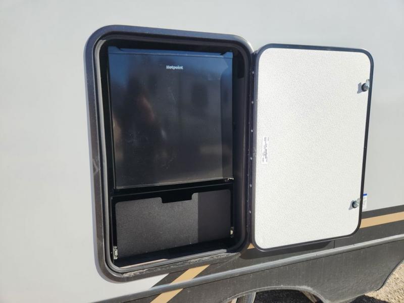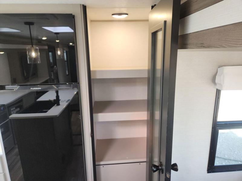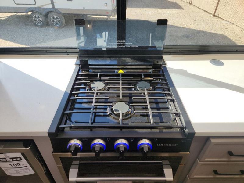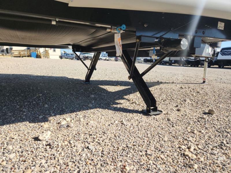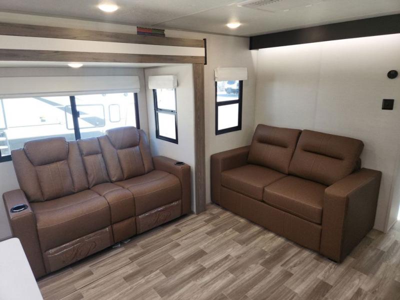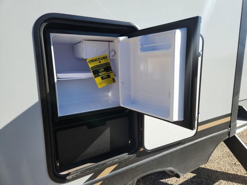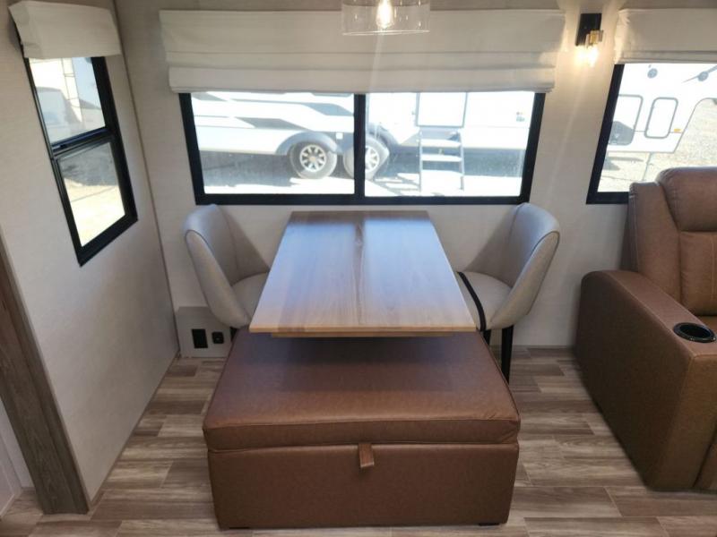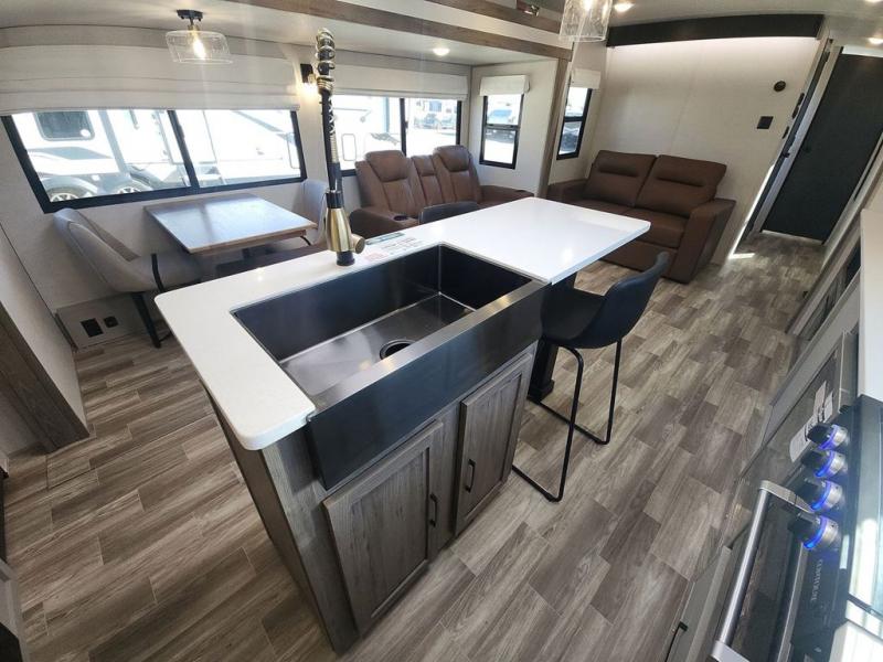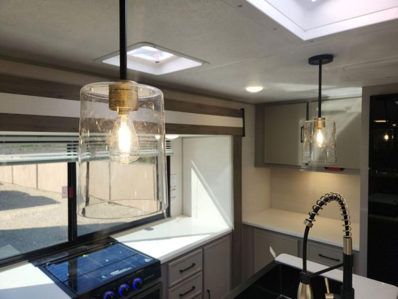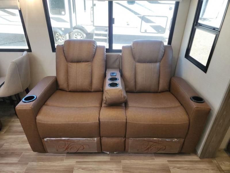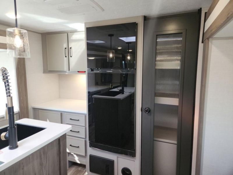You won't believe all that this travel trailer has to offer! If you need to get some work done then you can utilize the flip-up desk next to the oversized refrigerator and large pantry. The kitchen island makes meal prepping easier, and the beverage cooler helps save space in your refrigerator for perishables. The kitchen skylight brings in natural lighting. Relax each night on either the tri-fold sofa or theater seating across from the entertainment center with a fireplace, or you can play some games at the booth dinette. As you enter the bathroom, you will notice the washer and dryer prep that will give you the ability to add these appliances. The front private bedroom has a custom king bed slide with nightstands on either side with power to charge your electronics while you recharge. The exterior not only has pass-through storage and two awnings, but also a 48" x 48" baggage door!