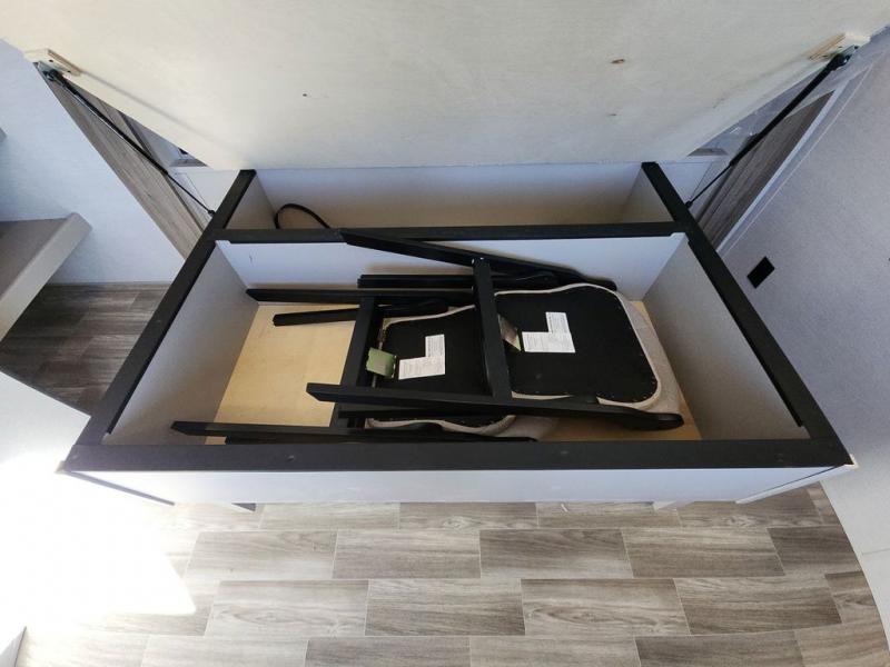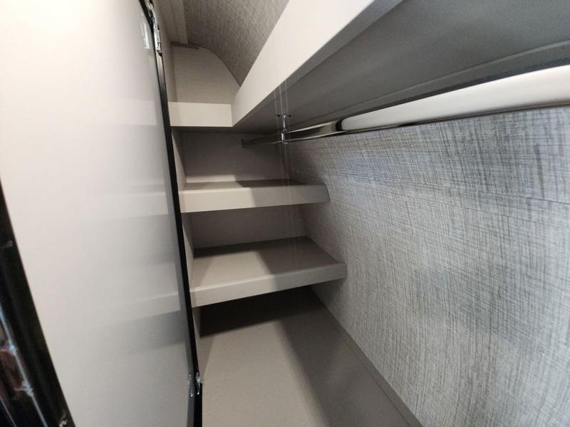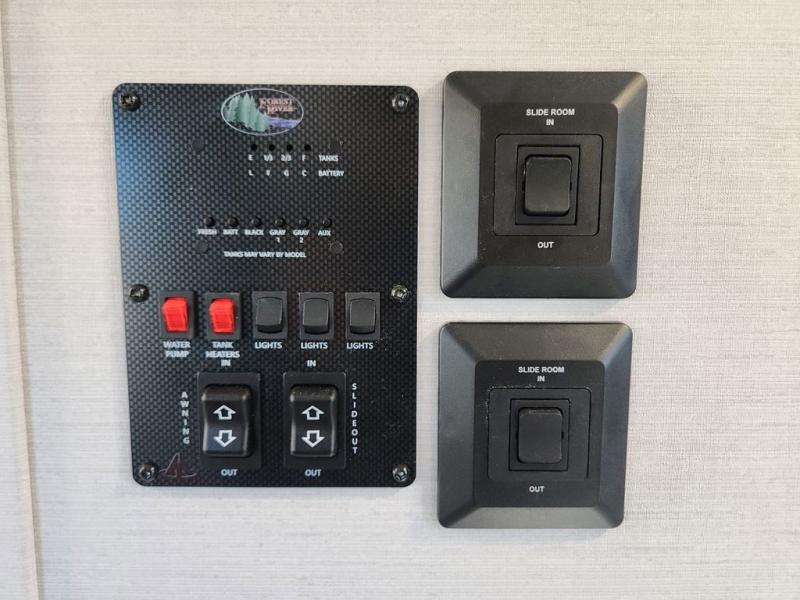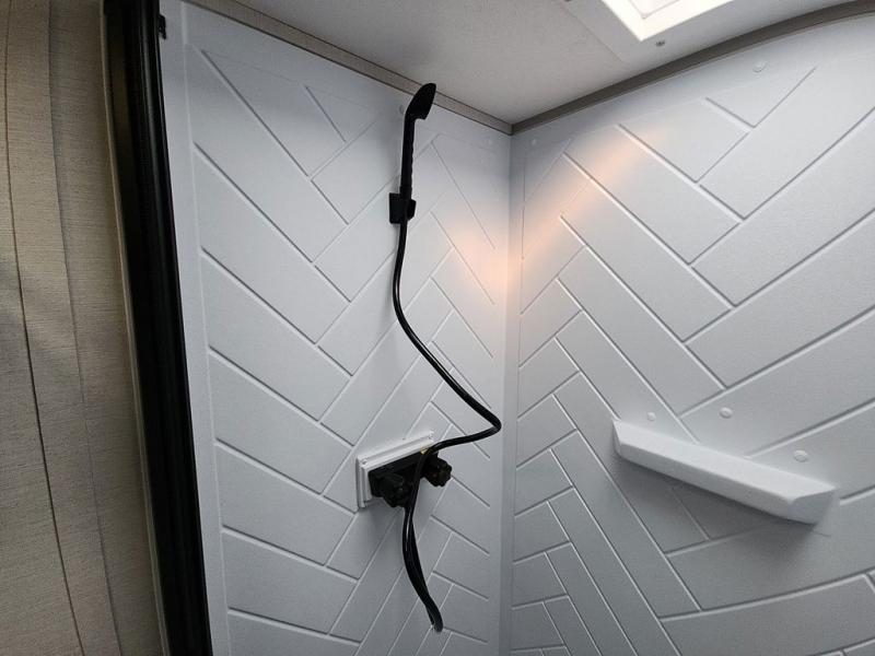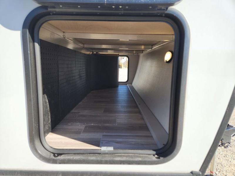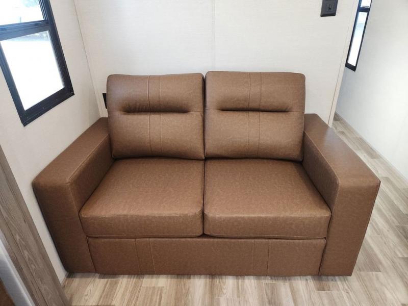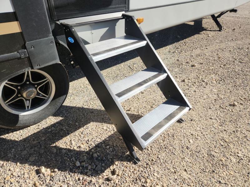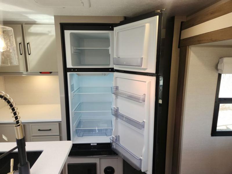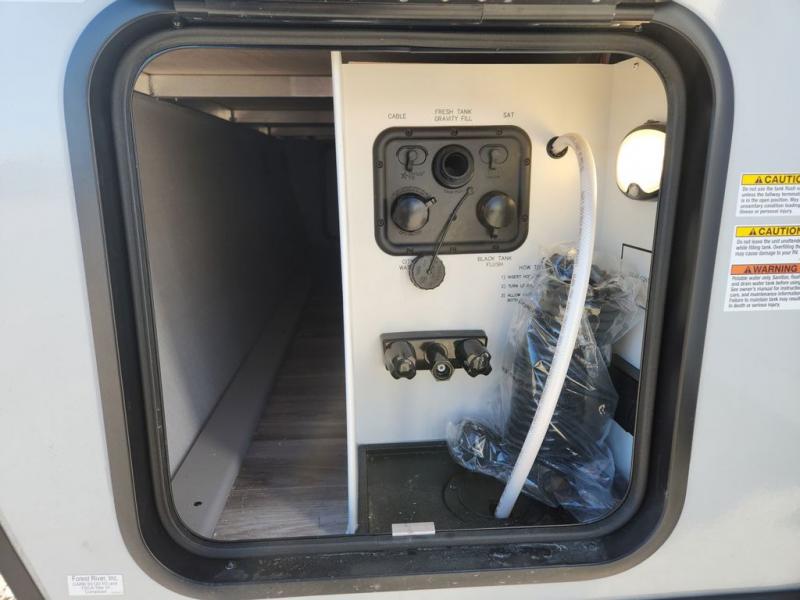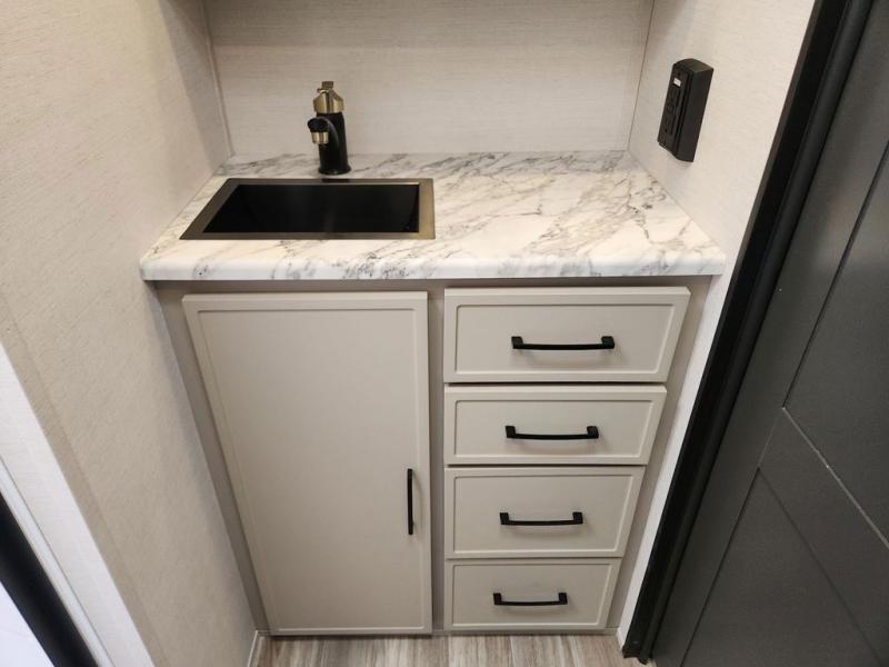 You won't believe all that this travel trailer has to offer! If you need to get some work done then you can utilize the flip-up desk next to the oversized refrigerator and large pantry. The kitchen island makes meal prepping easier, and the beverage cooler helps save space in your refrigerator for perishables. The kitchen skylight brings in natural lighting. Relax each night on either the tri-fold sofa or theater seating across from the entertainment center with a fireplace, or you can play some games at the booth dinette. As you enter the bathroom, you will notice the washer and dryer prep that will give you the ability to add these appliances. The front private bedroom has a custom king bed slide with nightstands on either side with power to charge your electronics while you recharge. The exterior not only has pass-through storage and two awnings, but also a 48" x 48" baggage door!