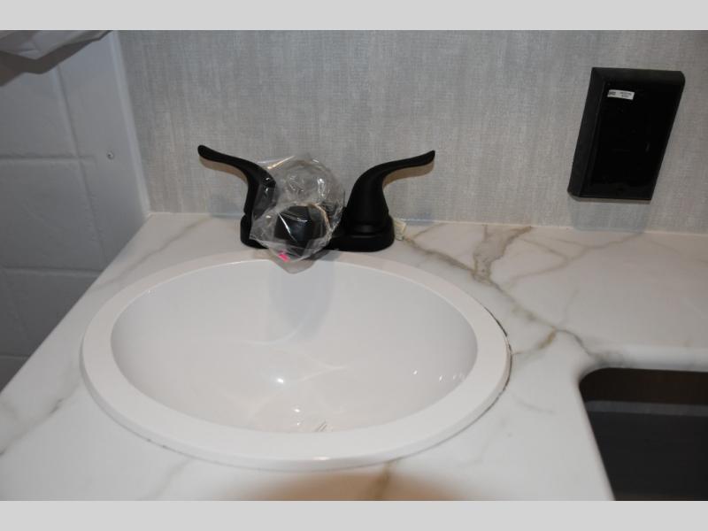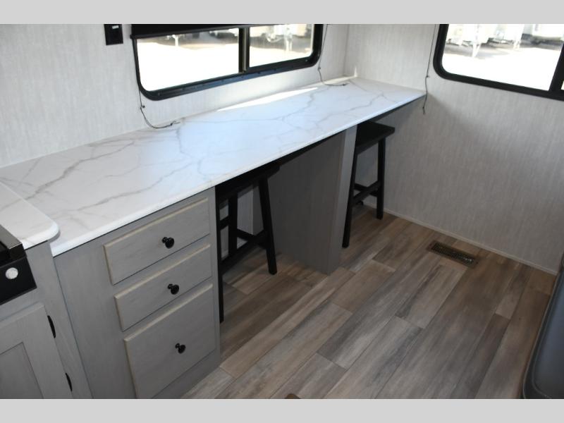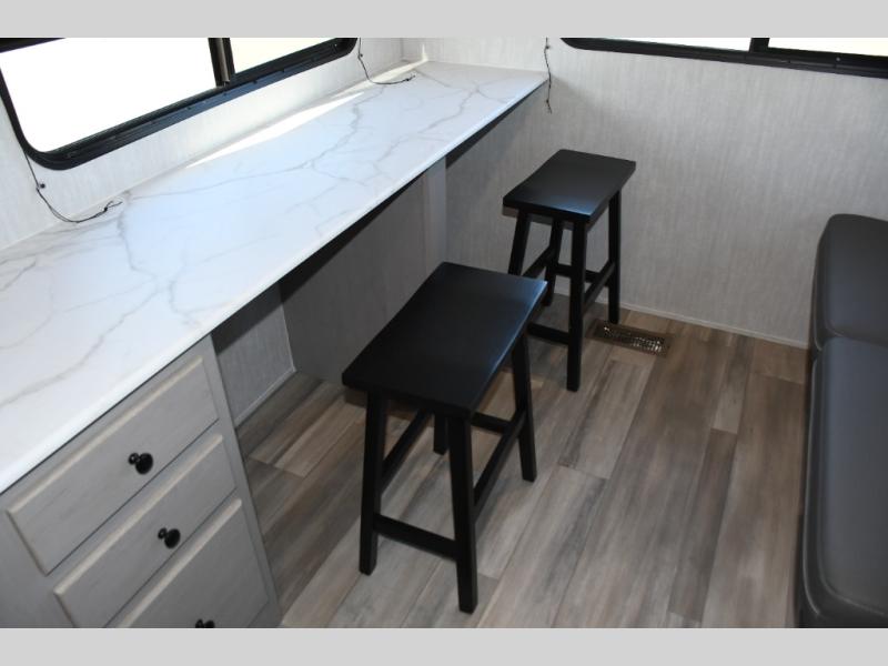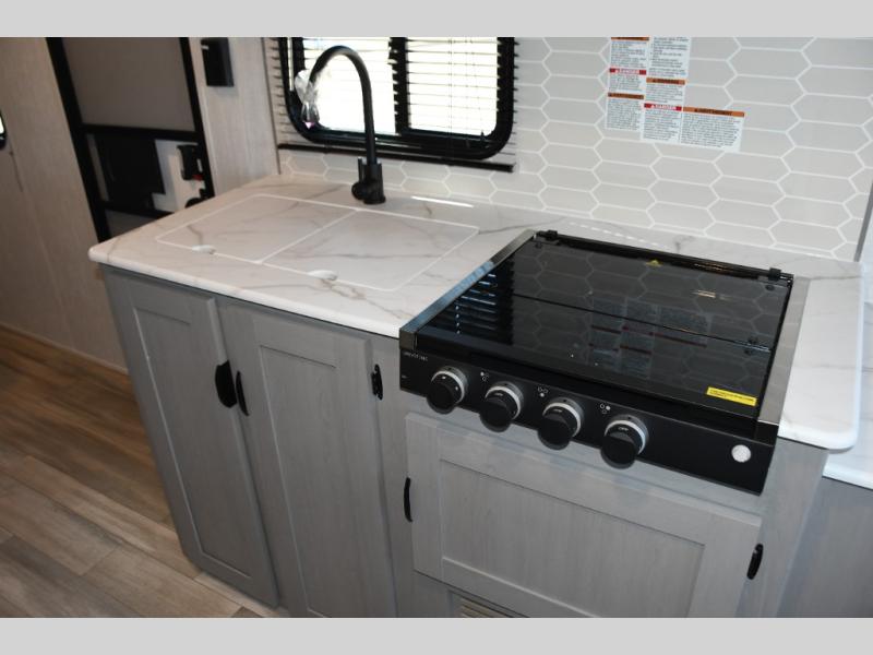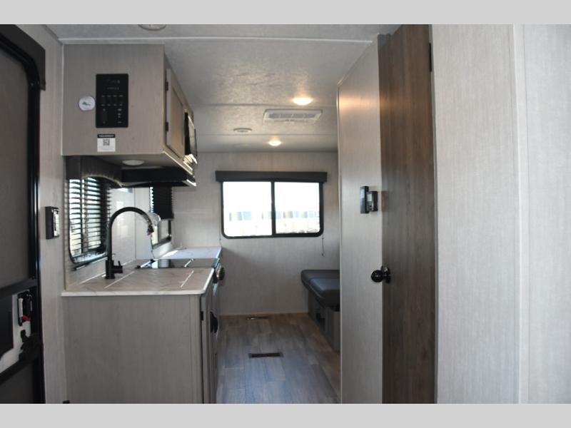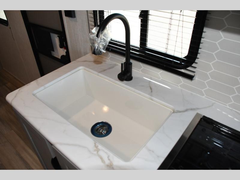 Step inside and you’ll notice the carefully designed interior, featuring a spacious mid-kitchen with modern appliances and plenty of storage, a comfortable U-shaped dinette perfect for meals or game nights, and a private front bedroom for restful nights. Every inch of this travel trailer is crafted to provide convenience and style, from durable flooring and sleek cabinetry to a modern bathroom that makes life on the road easy.