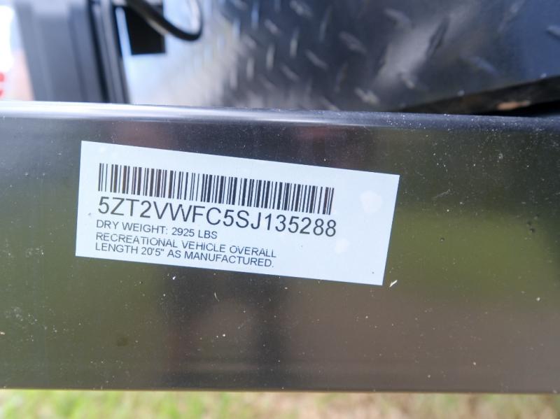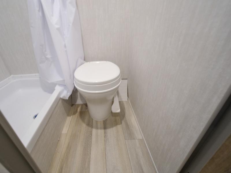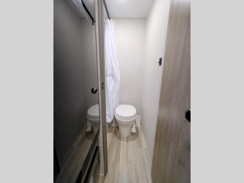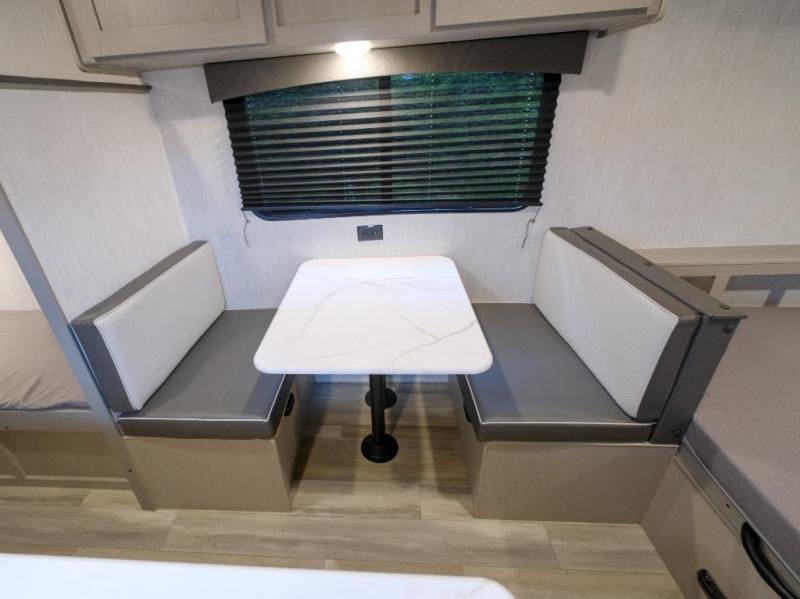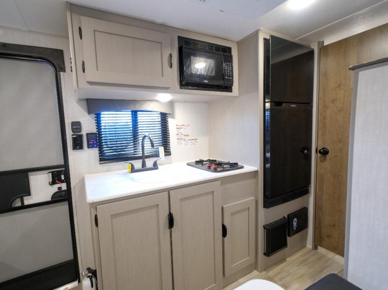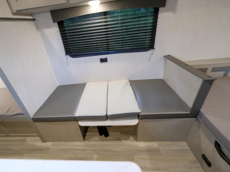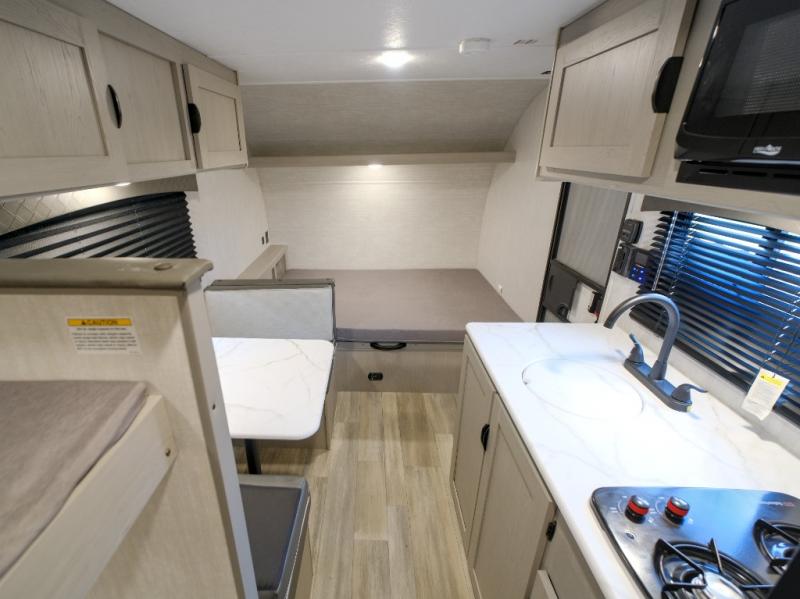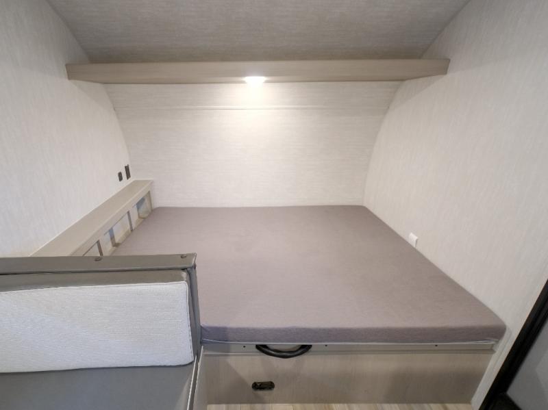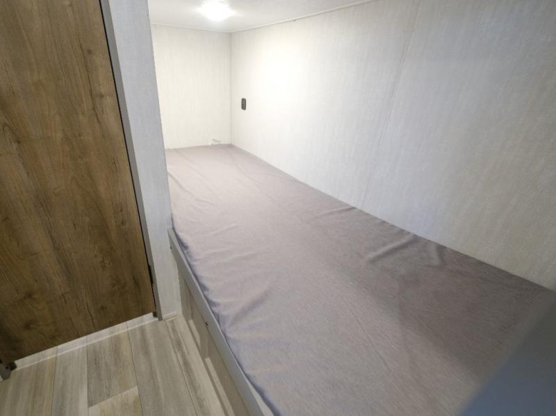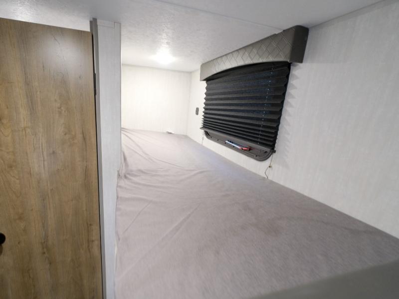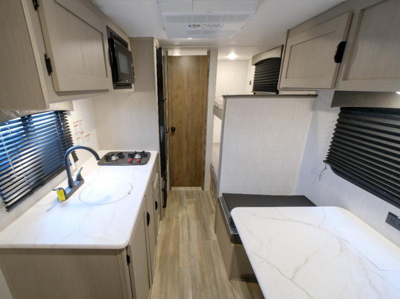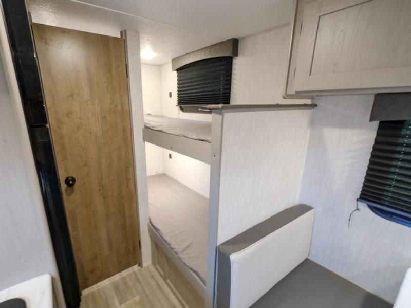 This is the perfect travel trailer for a family of four or five since it includes bunk beds for the kids, and a 54" x 74" bed up front as well as a booth dinette that can be converted to sleep one more. There is an induction cooktop to cook meals on, and a sink to easily clean up each day. You can dine at the booth dinette or take your plate outdoors to sit under the 10' power awning with LED lighting. This model also includes a 24" x 36" shower to get cleaned up each day. Get an early start on family vacations with this travel trailer in tow!