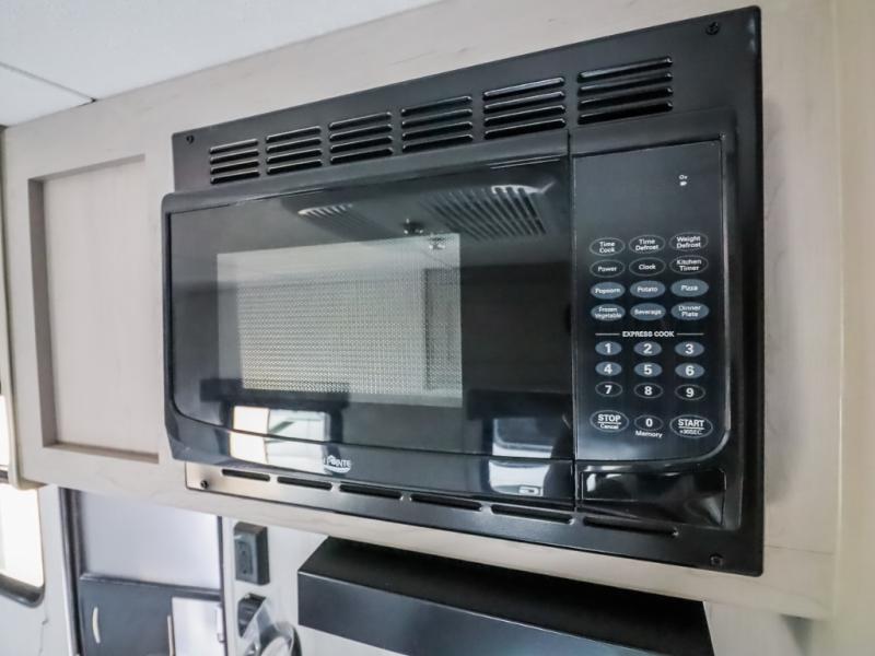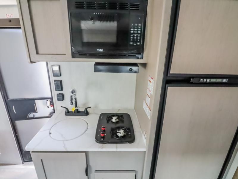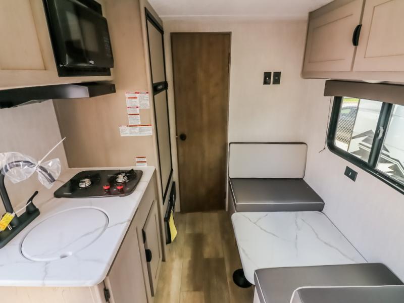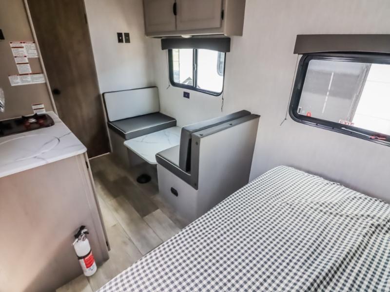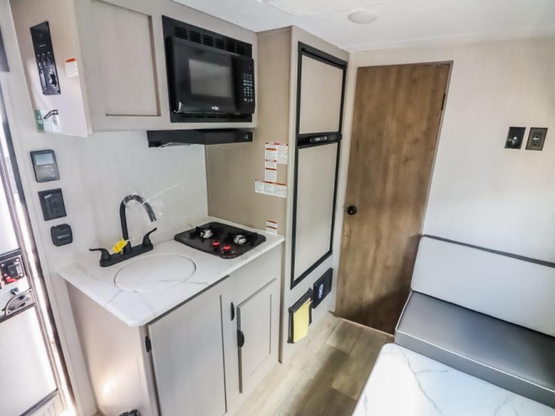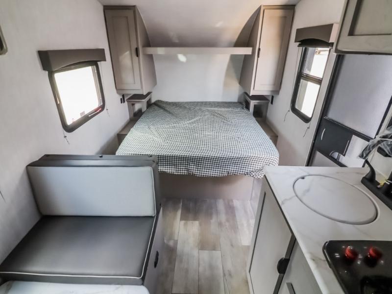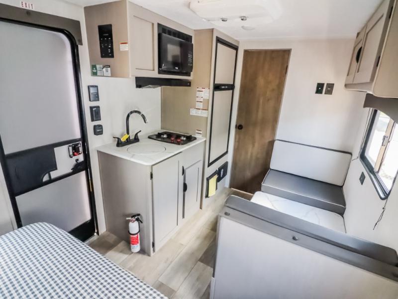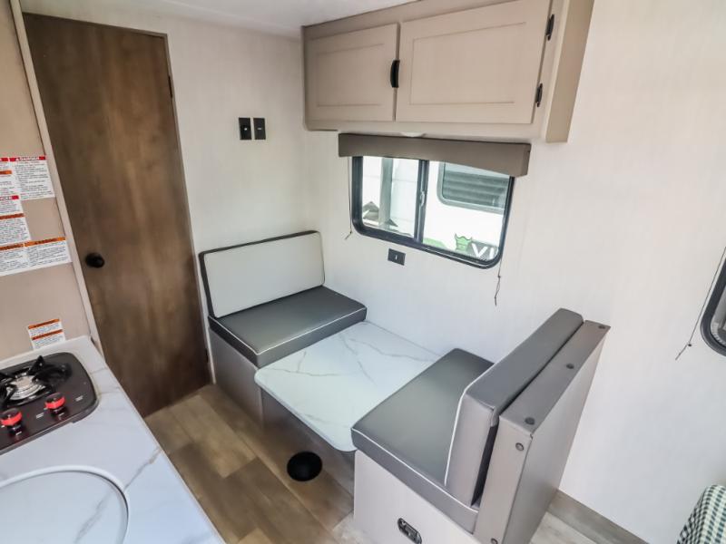 This Viking 3K Series is a cozy couples trailer or one perfect for a small family of three or four featuring a queen bed up front with overhead storage. The booth dinette also features additional storage and can be converted to sleeping space for one or two more depending on size. You will have an induction cooktop and sink with cover to provide a bit more counter space when the sink is not being used. A rear full bath including a 24" x 36" shower, toilet, and vanity with a sink, as well as an overhead medicine cabinet for your toothbrushes and other toiletries. On the outside, a 10' power patio awning will provide added protection from the sun and rain giving you added living space outside to enjoy with camp chairs. And, a front pass-through compartment for your outdoor camping gear, plus so much more!