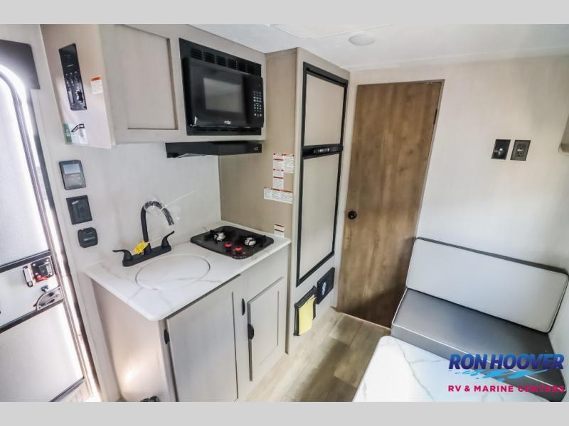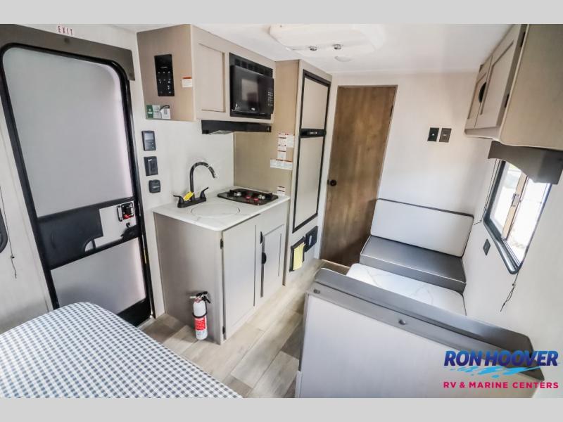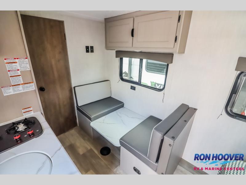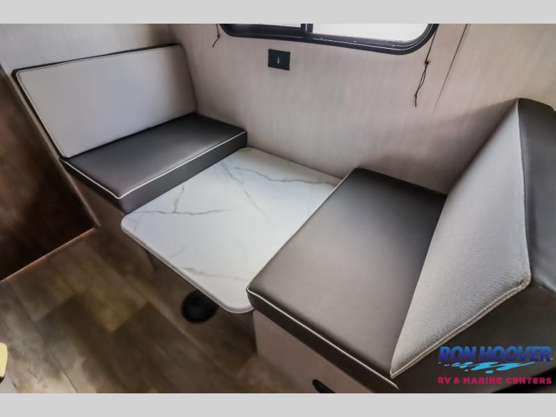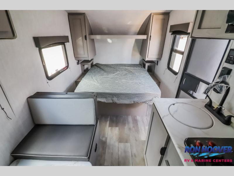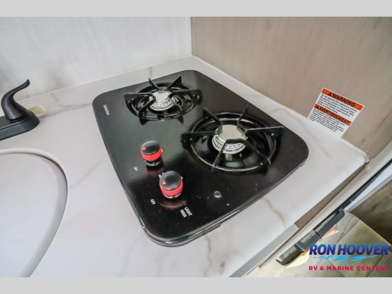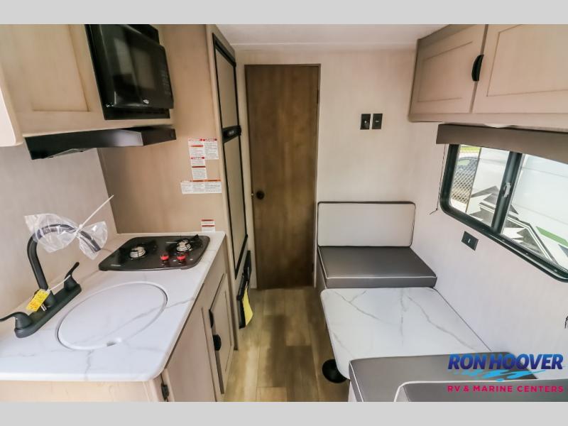 This Viking 3K Series is a cozy couples trailer or one perfect for a small family of three or four featuring a queen bed up front with overhead storage. The booth dinette also features additional storage and can be converted to sleeping space for one or two more depending on size. You will have an induction cooktop and sink with cover to provide a bit more counter space when the sink is not being used. A rear full bath including a 24" x 36" shower, toilet, and vanity with a sink, as well as an overhead medicine cabinet for your toothbrushes and other toiletries. On the outside, a 10' power patio awning will provide added protection from the sun and rain giving you added living space outside to enjoy with camp chairs. And, a front pass-through compartment for your outdoor camping gear, plus so much more!
