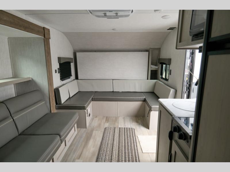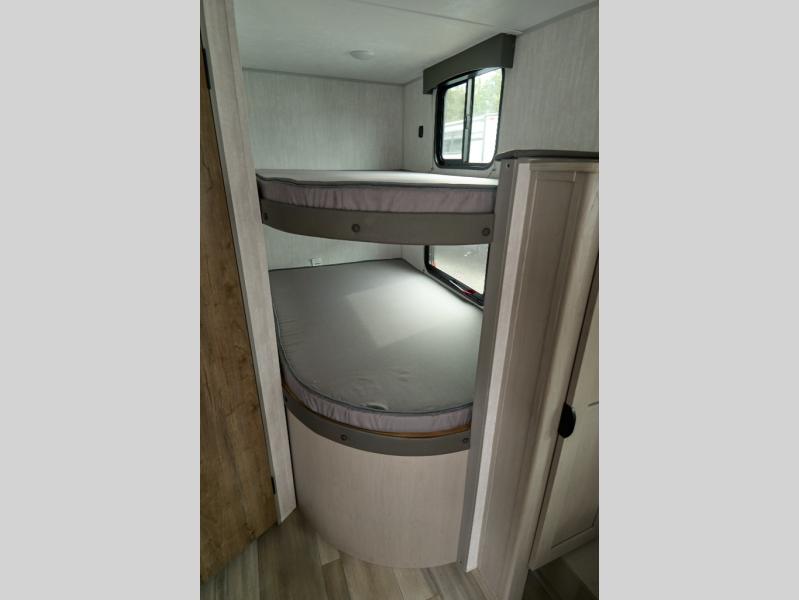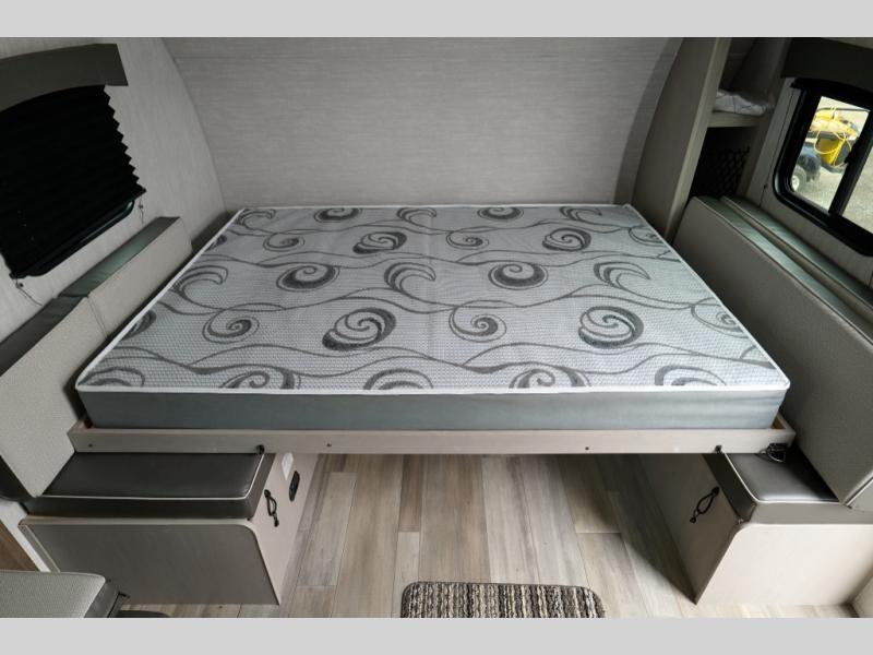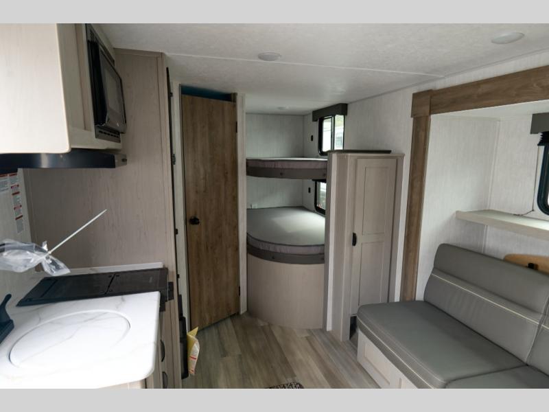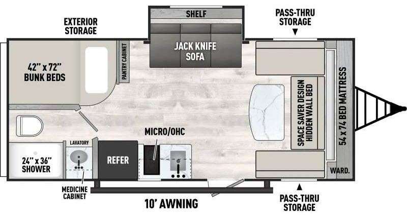 This versatile trailer easily sleeps a family of six and provides plenty of seating thanks to the versatile front hidden Murphy bed and U-dinette. During the day, the U-dinette provides seating for the whole gang. At night, move the table and cushions and flip down a comfortable bed. There is a jackknife sofa slide, and opposite you will find the kitchen area allowing you to easily whip up meals and snacks using the two burner cooktop, sink, overhead microwave oven, and refrigerator. A pantry cabinet is also available for all of your dry goods. At the rear of this unit, you will find sleeping for four on the double-size bunks along the roadside corner, and a full bath with a shower, toilet, and vanity with a sink and medicine cabinet along the curbside corner.