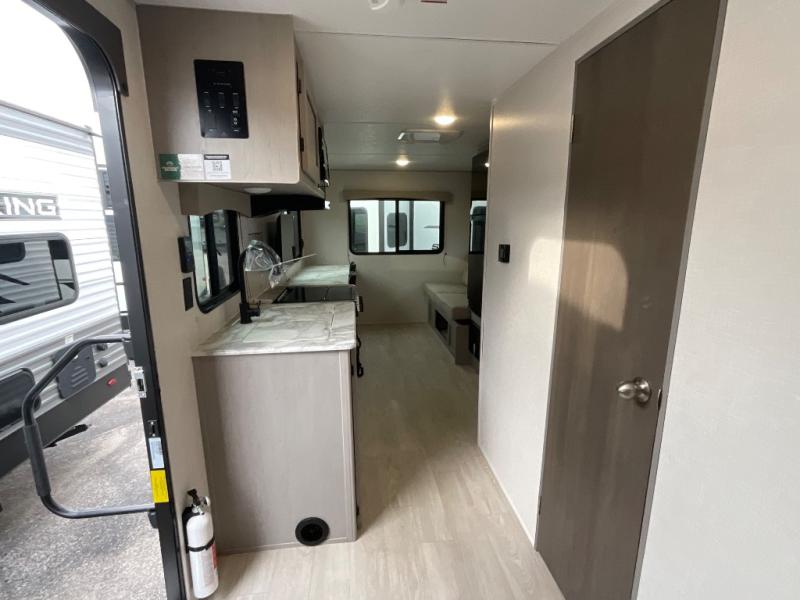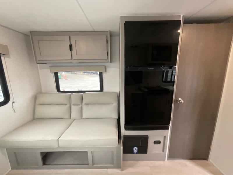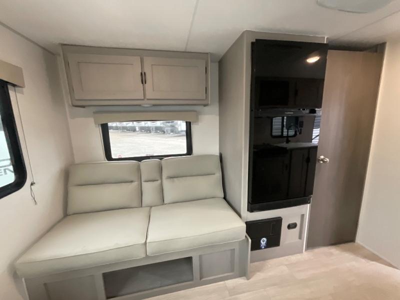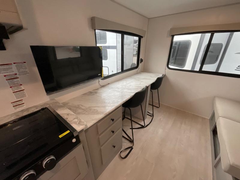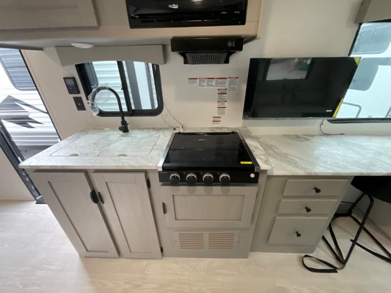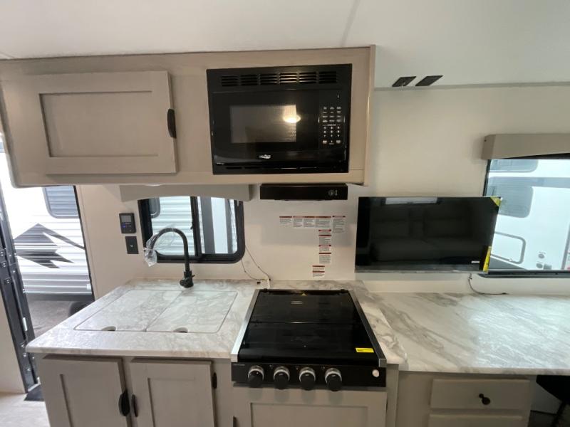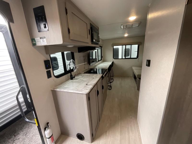 Time spent in this travel trailer will be time well spent! There is a front bedroom with a 60" x 74" queen bed, dual wardrobes, and a private shelf on either side of the bed to keep your belongings close by. A three burner cooktop and microwave will let you make meals each day, and an 8 cu. ft. 12V refrigerator and pantry will help keep food stocked. This unit includes a large countertop with two barstools in the back where you can dine together, along with a jack knife sofa on the other side for a place to relax!