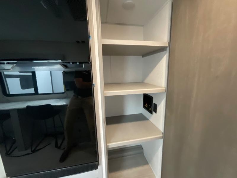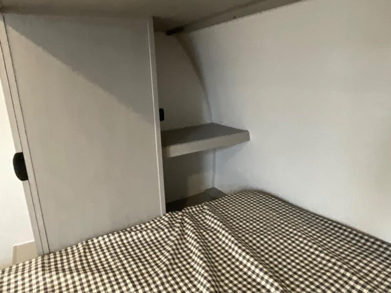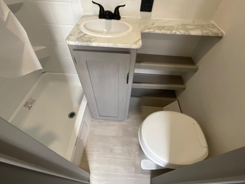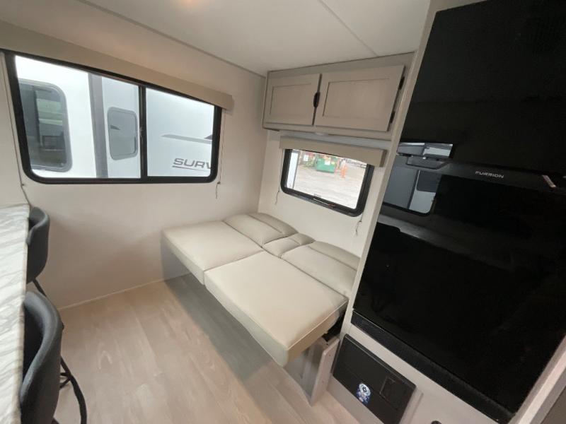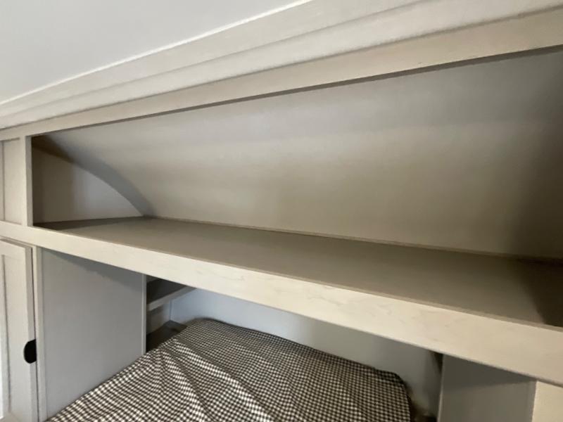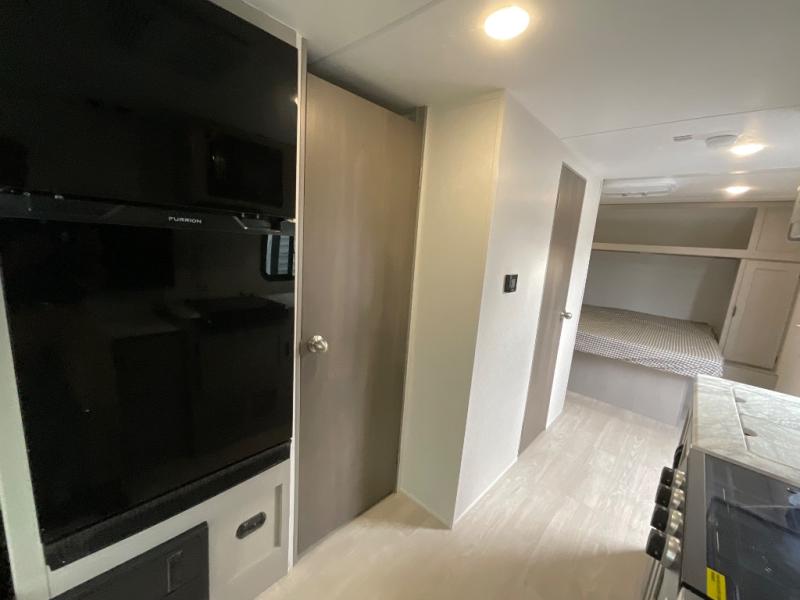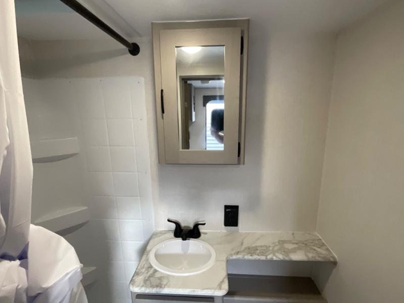 Time spent in this travel trailer will be time well spent! There is a front bedroom with a 60" x 74" queen bed, dual wardrobes, and a private shelf on either side of the bed to keep your belongings close by. A three burner cooktop and microwave will let you make meals each day, and an 8 cu. ft. 12V refrigerator and pantry will help keep food stocked. This unit includes a large countertop with two barstools in the back where you can dine together, along with a jack knife sofa on the other side for a place to relax!