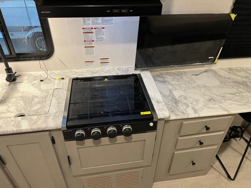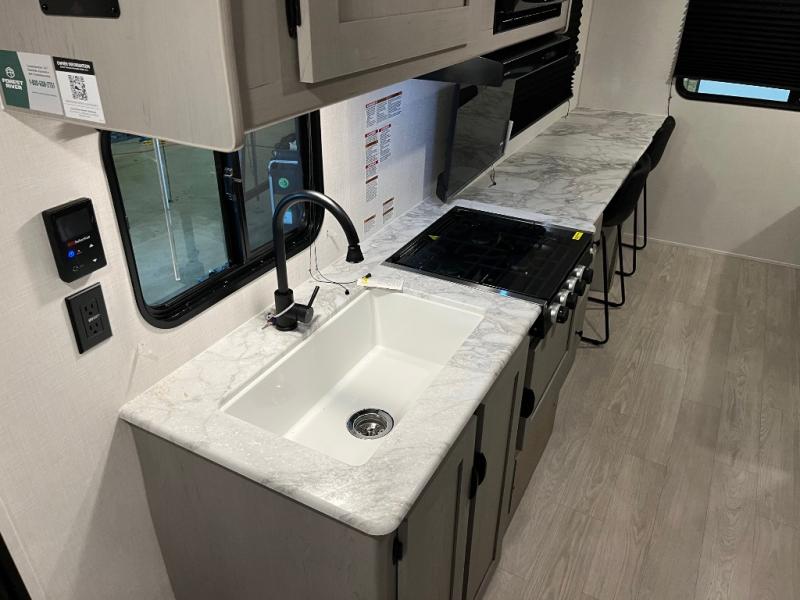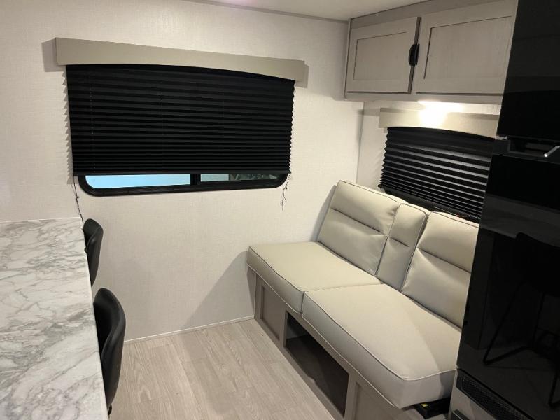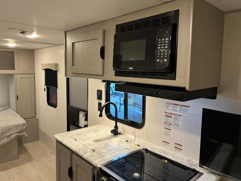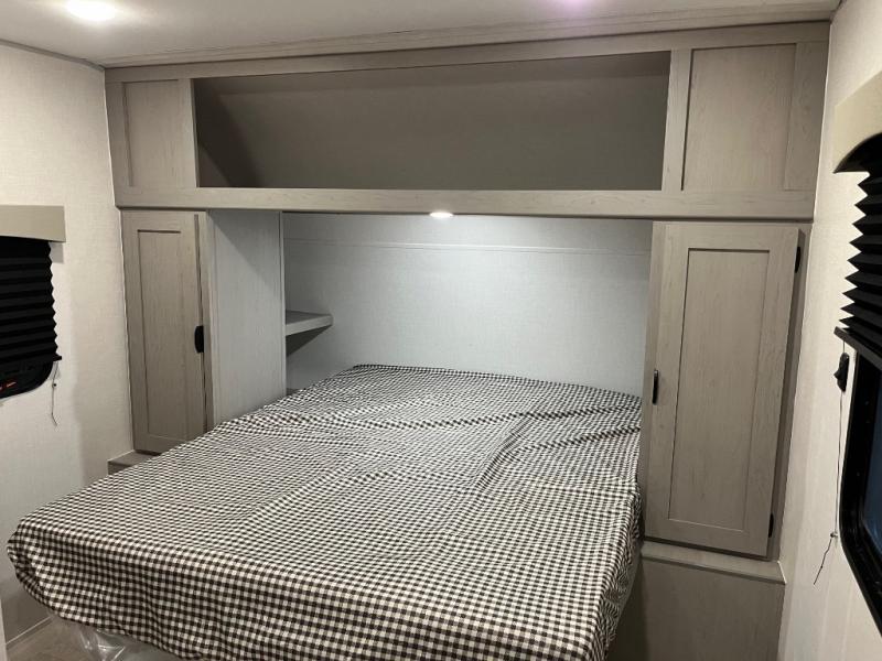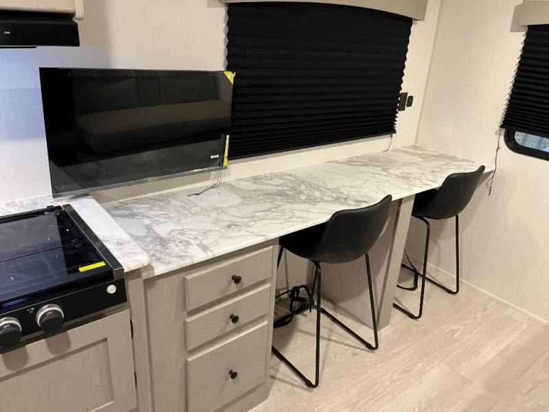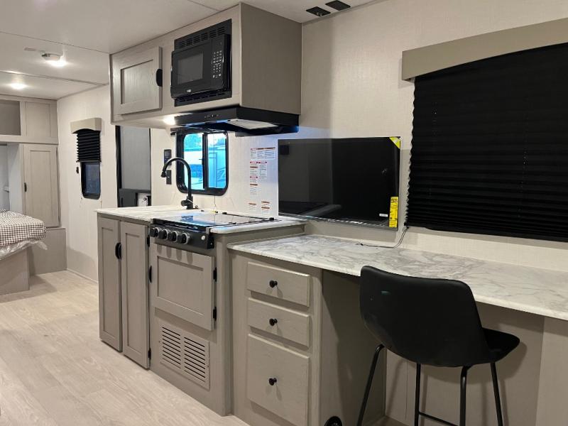 Time spent in this travel trailer will be time well spent! There is a front bedroom with a 60" x 74" queen bed, dual wardrobes, and a private shelf on either side of the bed to keep your belongings close by. A three burner cooktop and microwave will let you make meals each day, and an 8 cu. ft. 12V refrigerator and pantry will help keep food stocked. This unit includes a large countertop with two barstools in the back where you can dine together, along with a jack knife sofa on the other side for a place to relax!