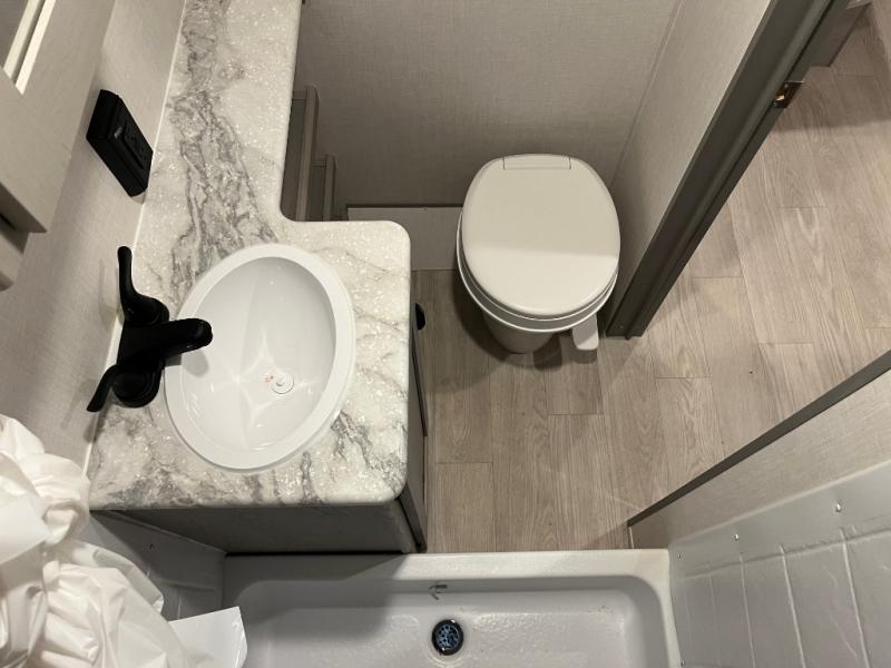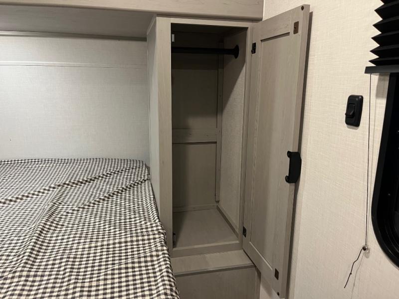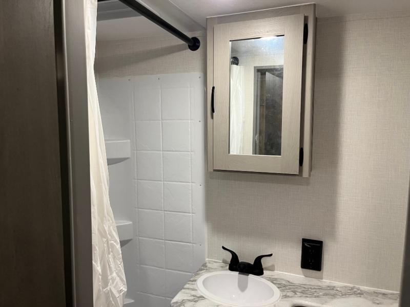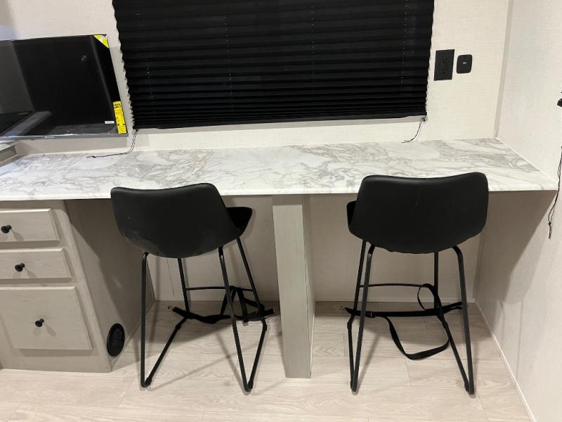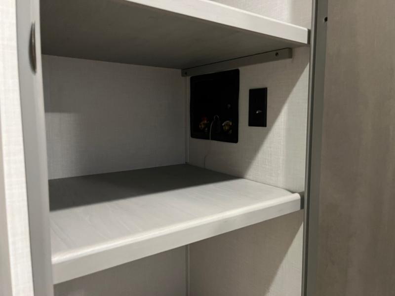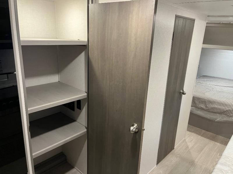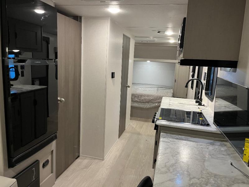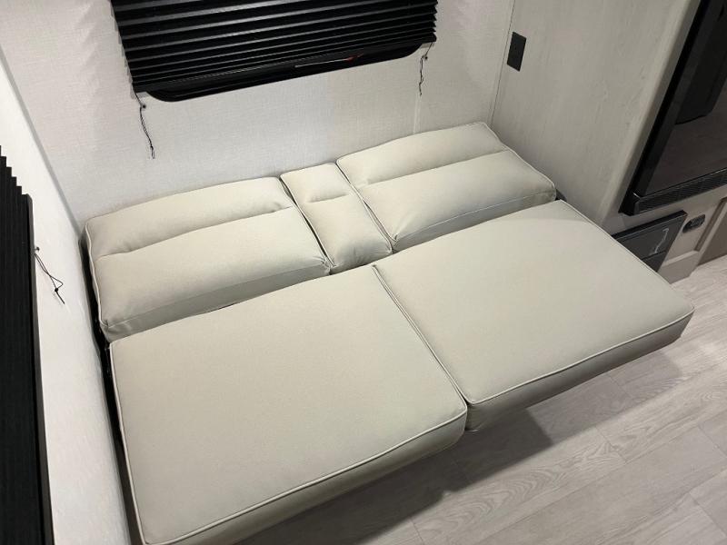Time spent in this travel trailer will be time well spent! There is a front bedroom with a 60" x 74" queen bed, dual wardrobes, and a private shelf on either side of the bed to keep your belongings close by. A three burner cooktop and microwave will let you make meals each day, and an 8 cu. ft. 12V refrigerator and pantry will help keep food stocked. This unit includes a large countertop with two barstools in the back where you can dine together, along with a jack knife sofa on the other side for a place to relax!