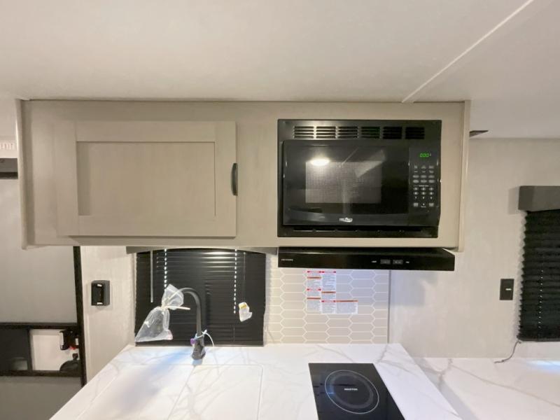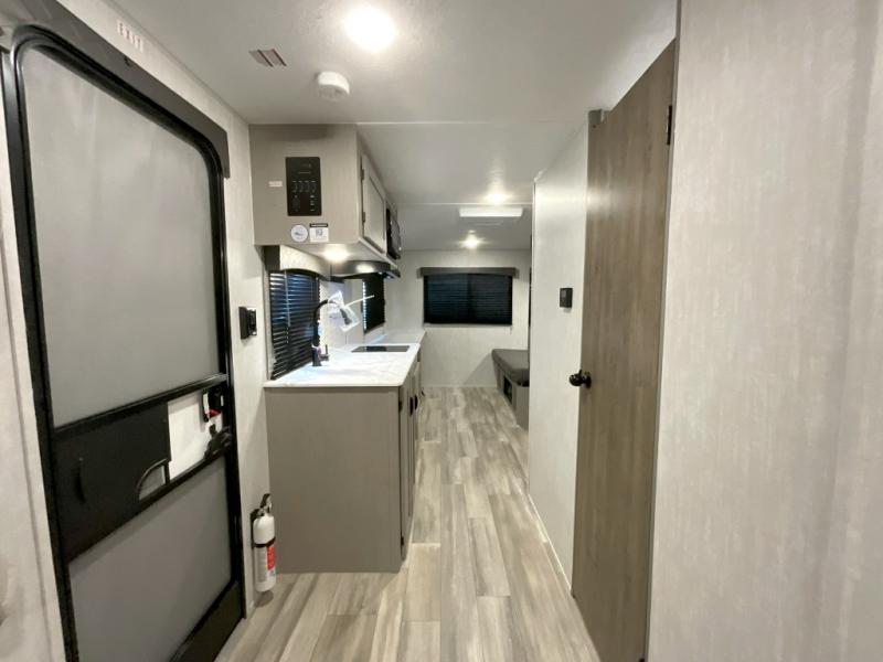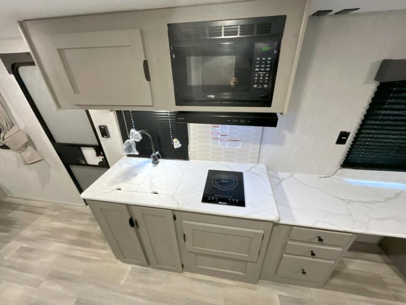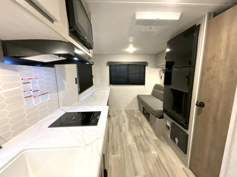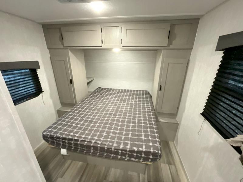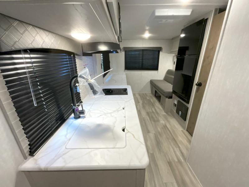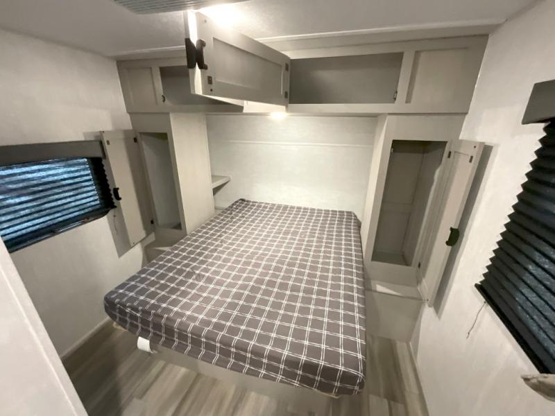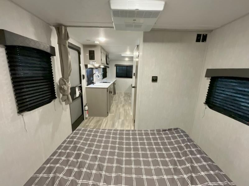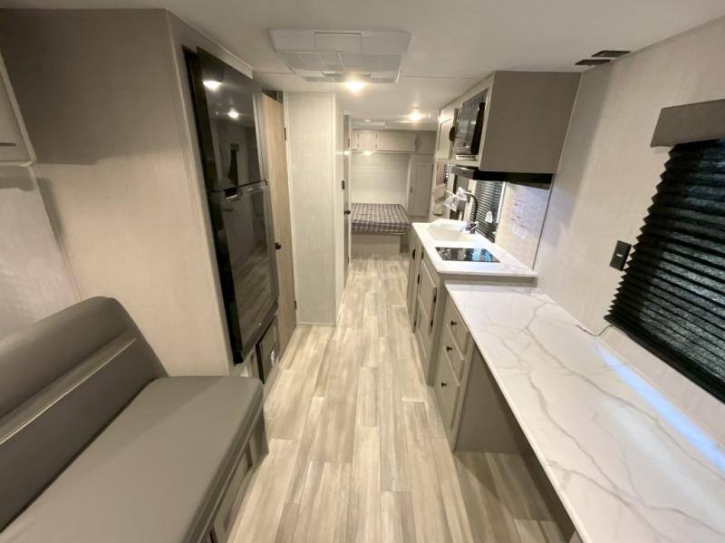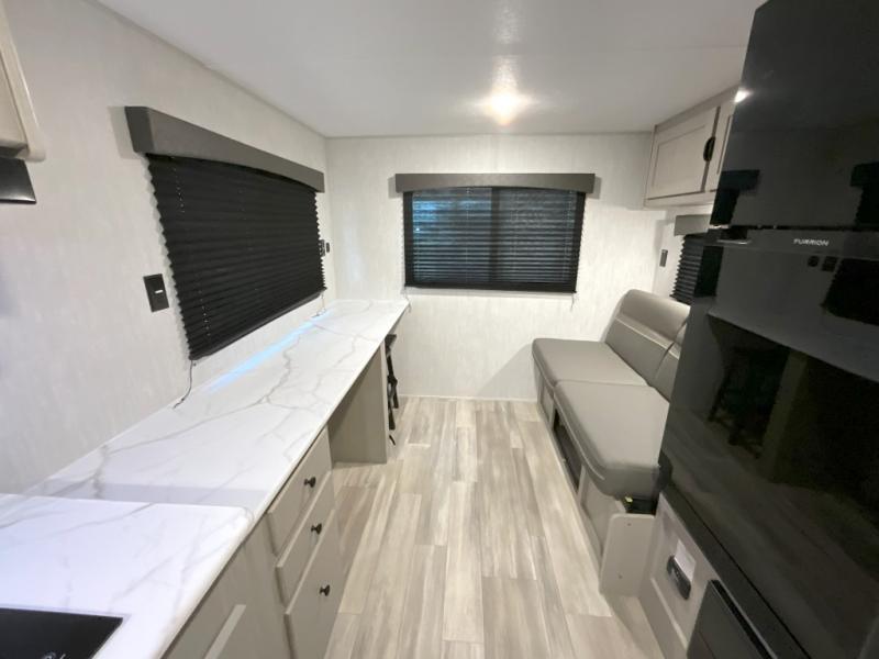 Time spent in this travel trailer will be time well spent! There is a front bedroom with a 60" x 74" queen bed, dual wardrobes, and a private shelf on either side of the bed to keep your belongings close by. A three burner cooktop and microwave will let you make meals each day, and an 8 cu. ft. 12V refrigerator and pantry will help keep food stocked. This unit includes a large countertop with two barstools in the back where you can dine together, along with a jack knife sofa on the other side for a place to relax!