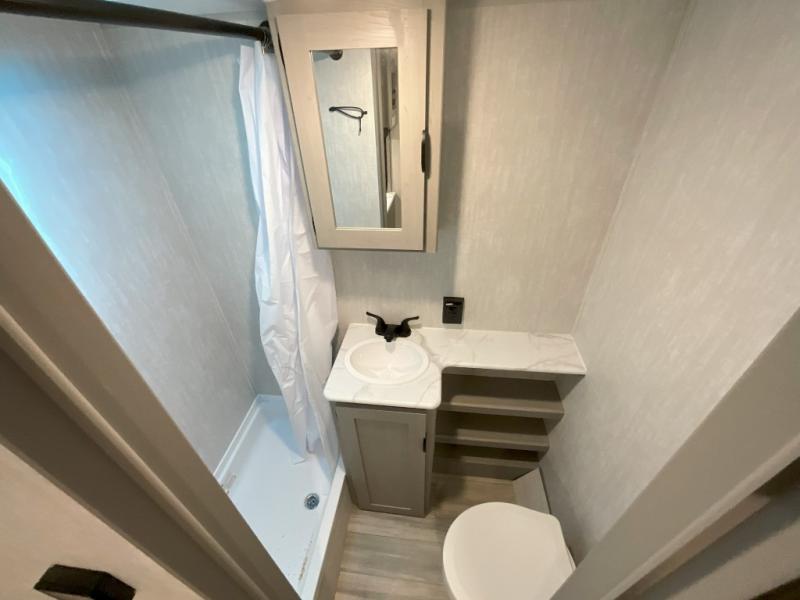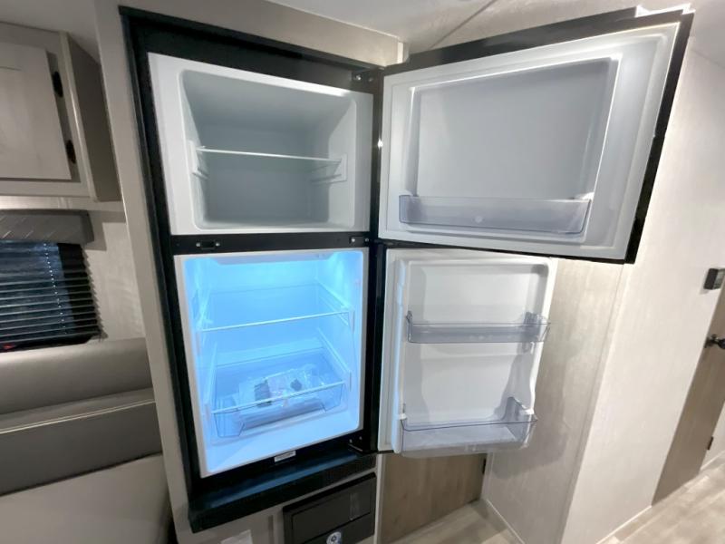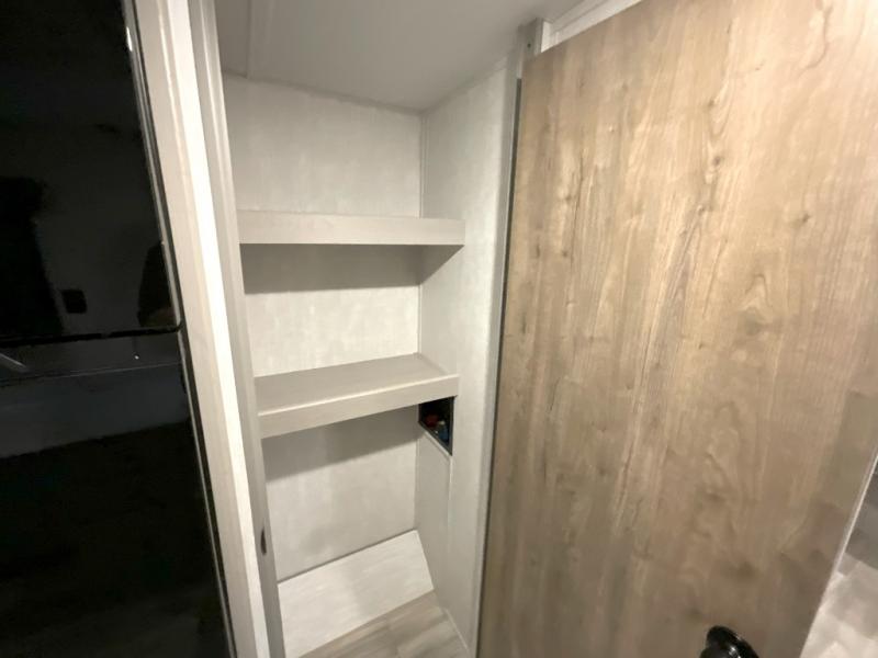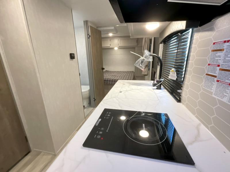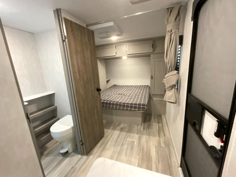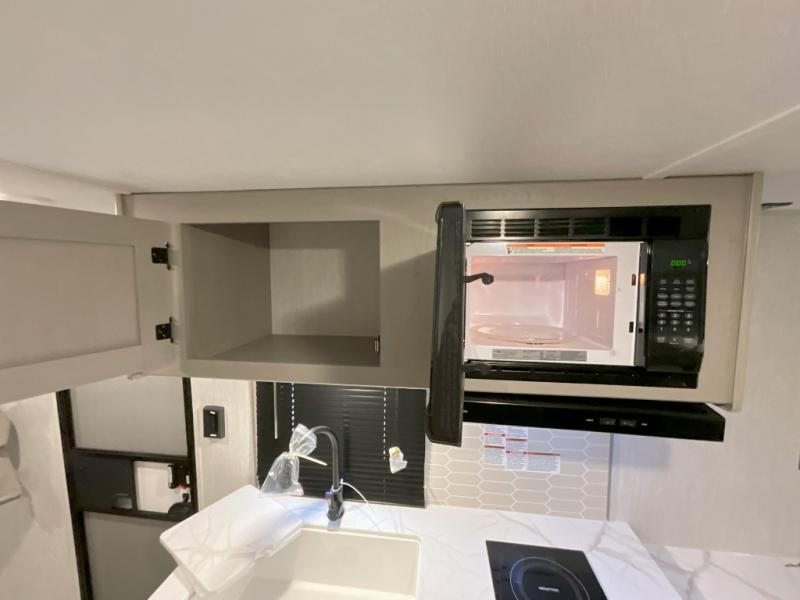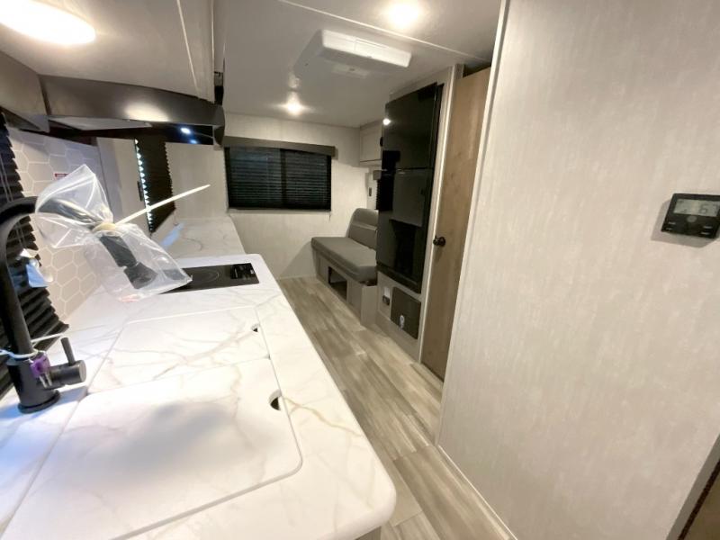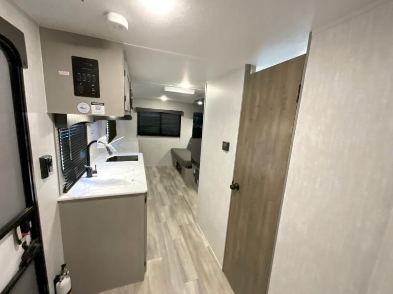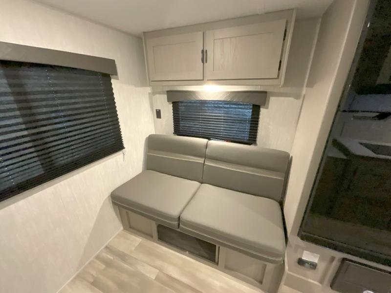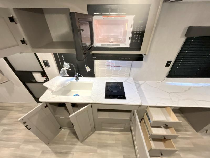 Time spent in this travel trailer will be time well spent! There is a front bedroom with a 60" x 74" queen bed, dual wardrobes, and a private shelf on either side of the bed to keep your belongings close by. A three burner cooktop and microwave will let you make meals each day, and an 8 cu. ft. 12V refrigerator and pantry will help keep food stocked. This unit includes a large countertop with two barstools in the back where you can dine together, along with a jack knife sofa on the other side for a place to relax!
