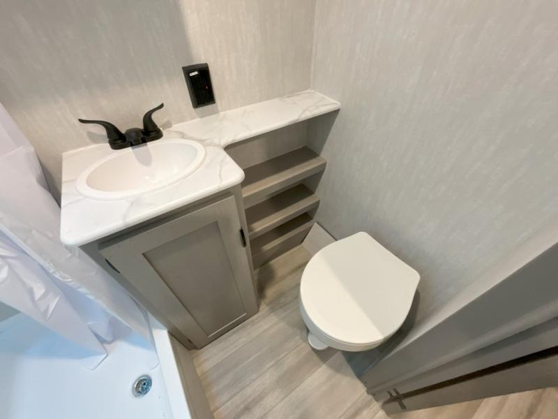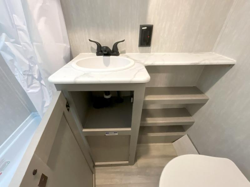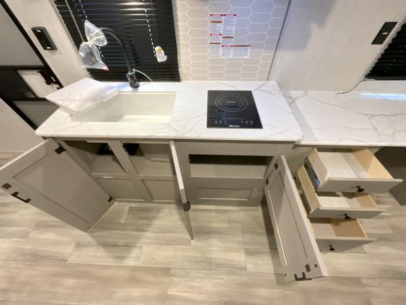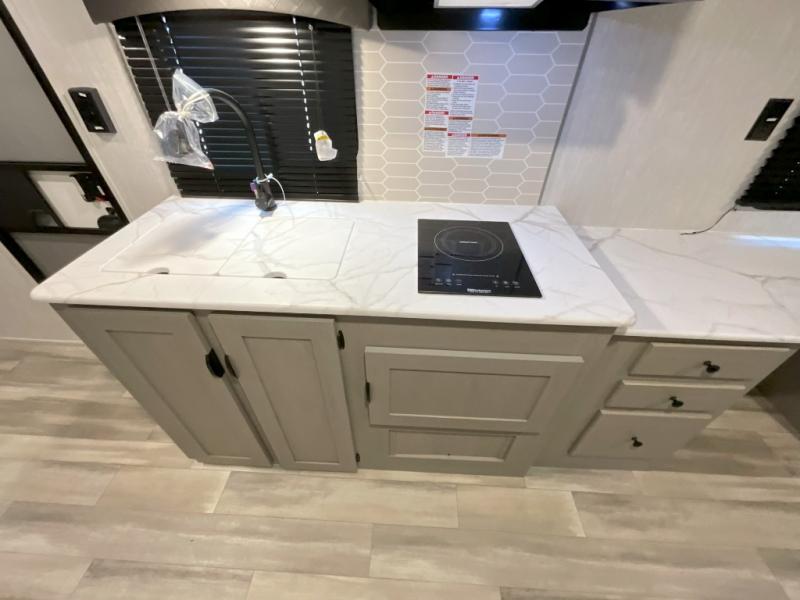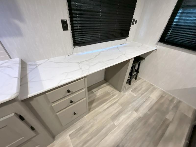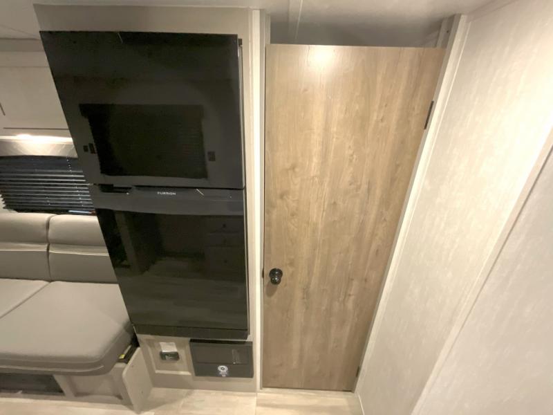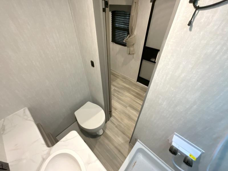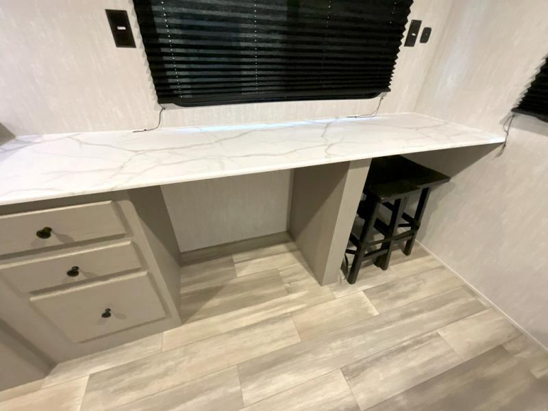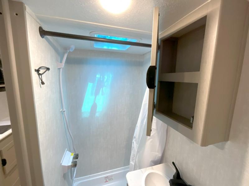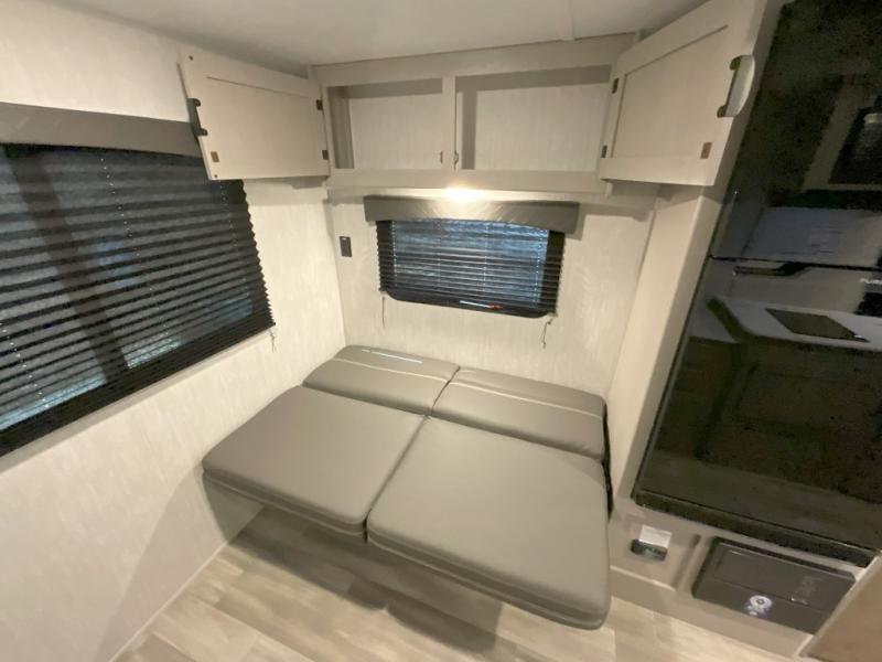 Time spent in this travel trailer will be time well spent! There is a front bedroom with a 60" x 74" queen bed, dual wardrobes, and a private shelf on either side of the bed to keep your belongings close by. A three burner cooktop and microwave will let you make meals each day, and an 8 cu. ft. 12V refrigerator and pantry will help keep food stocked. This unit includes a large countertop with two barstools in the back where you can dine together, along with a jack knife sofa on the other side for a place to relax!