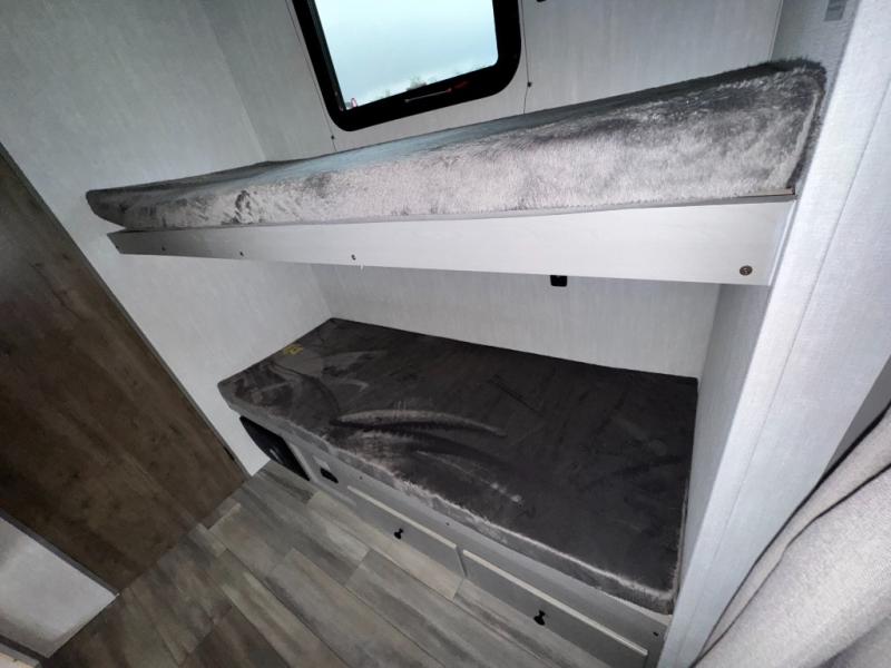 Your guests will love camping with you in this travel trailer! The bunkhouse suite includes four bunks with storage underneath plus a full rear bath to easily clean up each day. The front RV queen bed will provide a great night's rest, or you can choose the Murphy bed option if you're needing more seating space during the day. You can make your best meals in the full kitchen with a three burner cooktop and microwave oven, and there is an 8 cu. ft. 12V refrigerator to keep your cold items fresh. The U-shaped dinette provides a place to dine, play games, and even let additional guests sleep over. This unit also features a closet with washer and dryer prep if you choose to add those appliances.