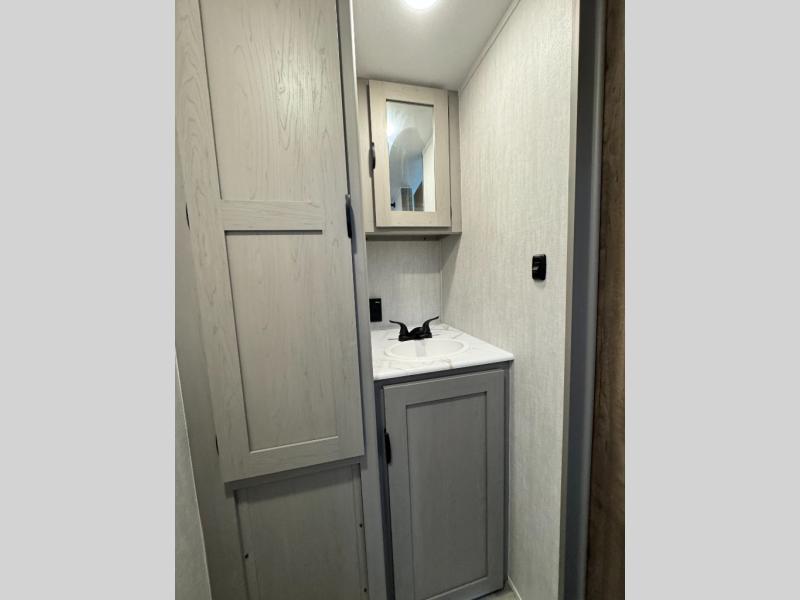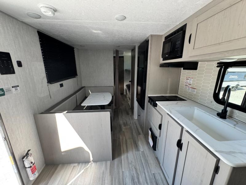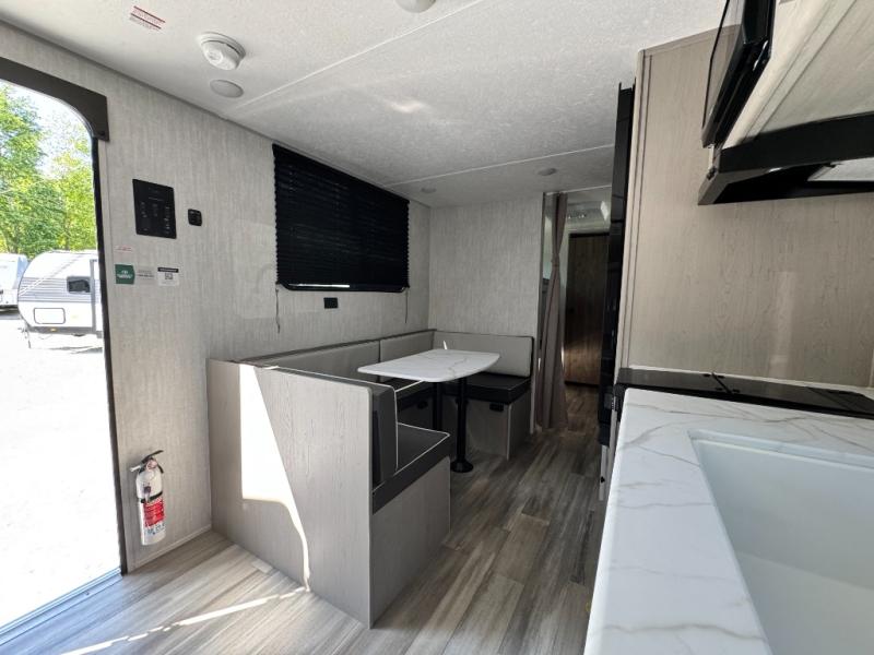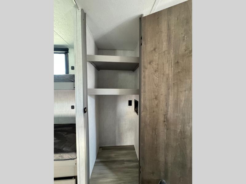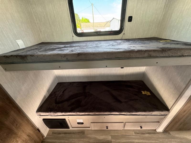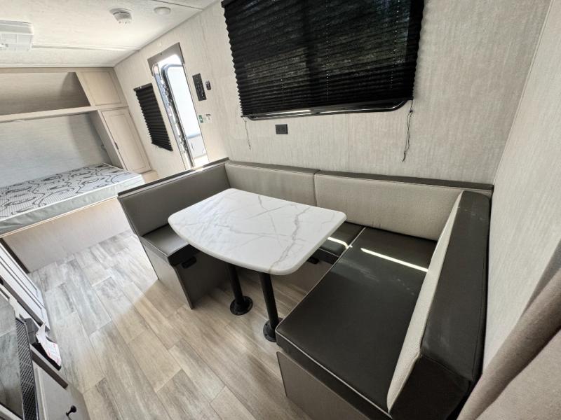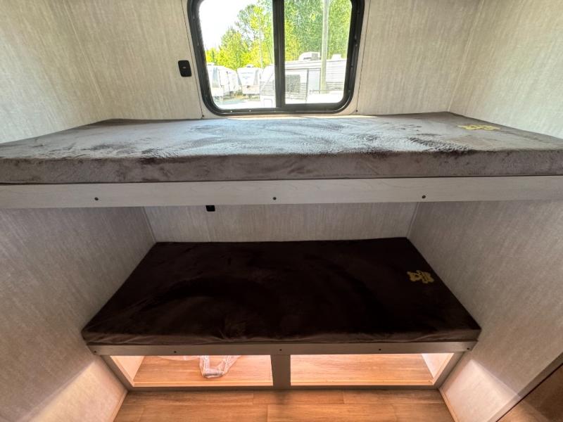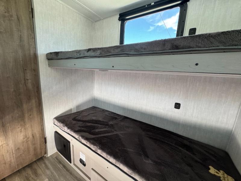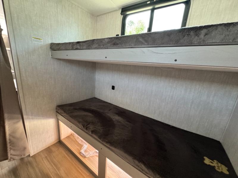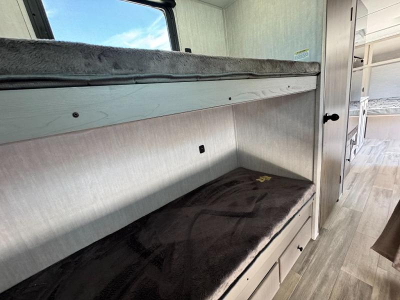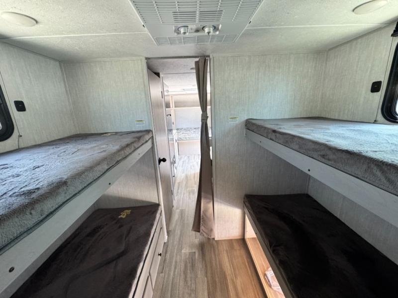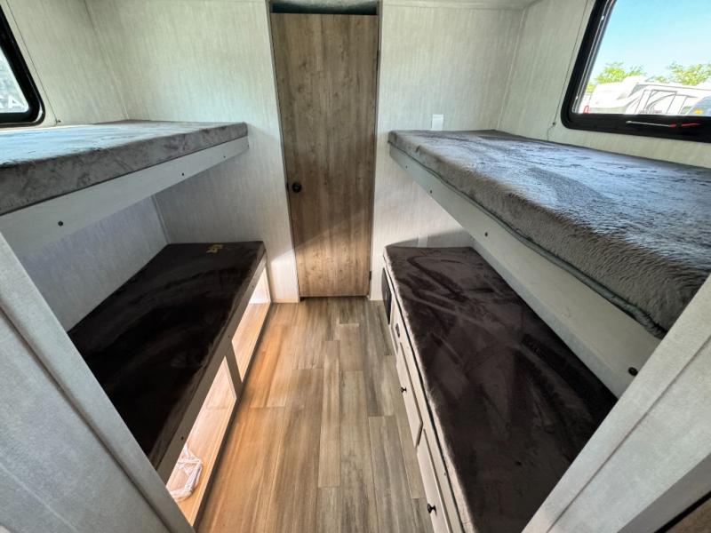 Your guests will love camping with you in this travel trailer! The bunkhouse suite includes four bunks with storage underneath plus a full rear bath to easily clean up each day. The front RV queen bed will provide a great night's rest, or you can choose the Murphy bed option if you're needing more seating space during the day. You can make your best meals in the full kitchen with a three burner cooktop and microwave oven, and there is an 8 cu. ft. 12V refrigerator to keep your cold items fresh. The U-shaped dinette provides a place to dine, play games, and even let additional guests sleep over. This unit also features a closet with washer and dryer prep if you choose to add those appliances.