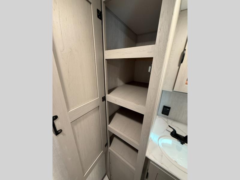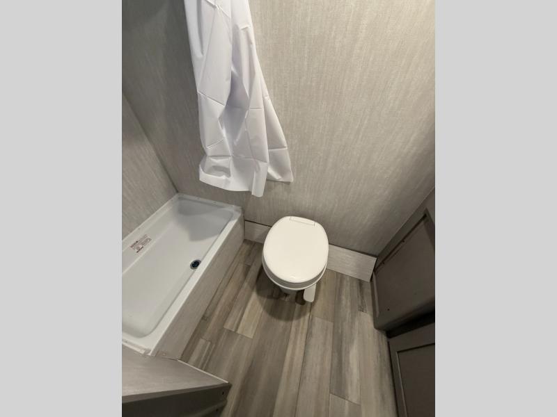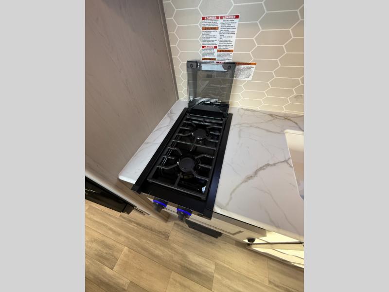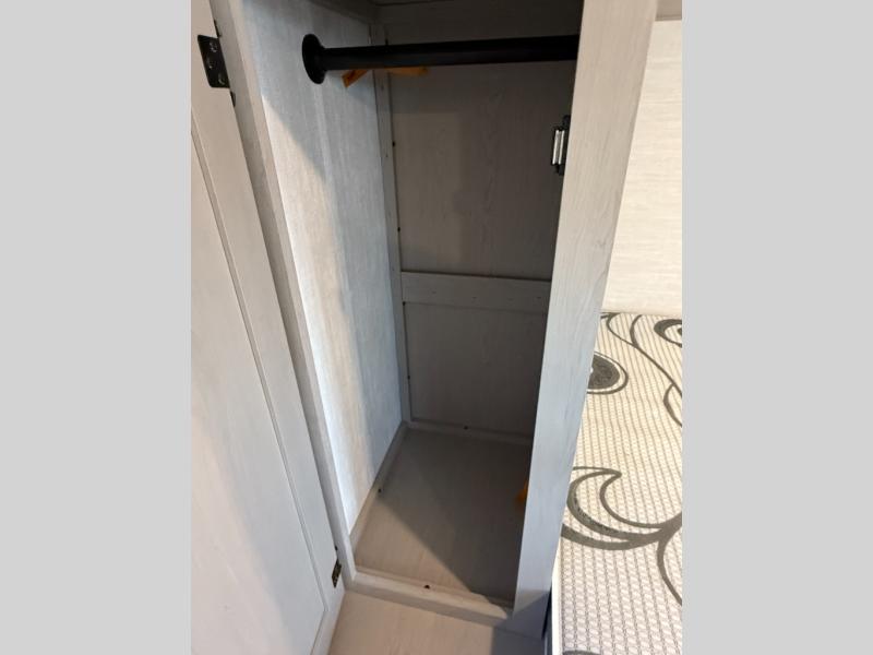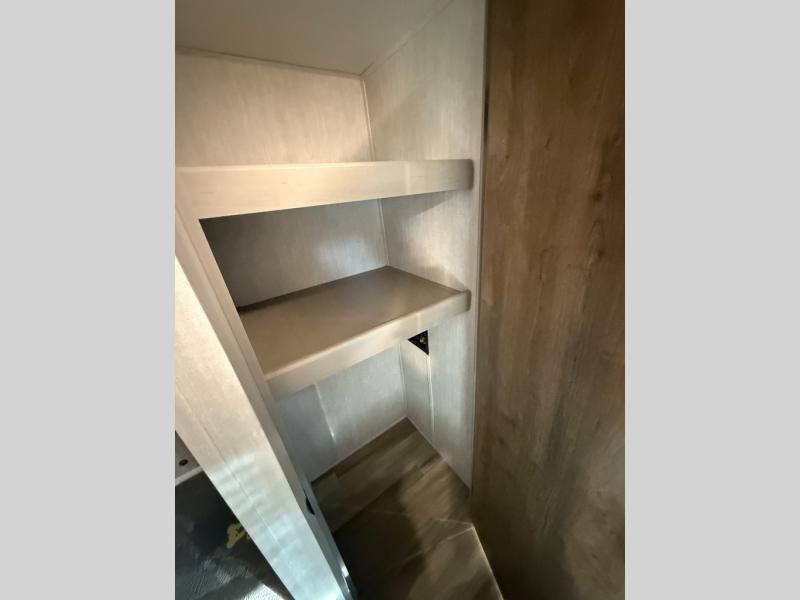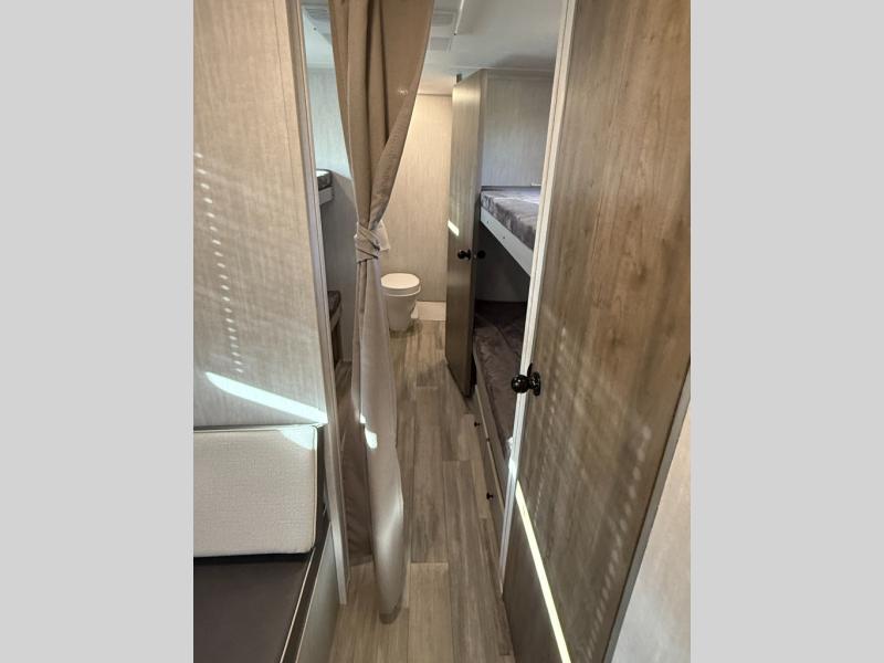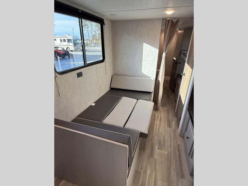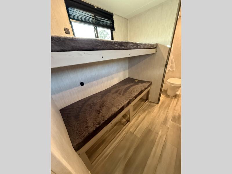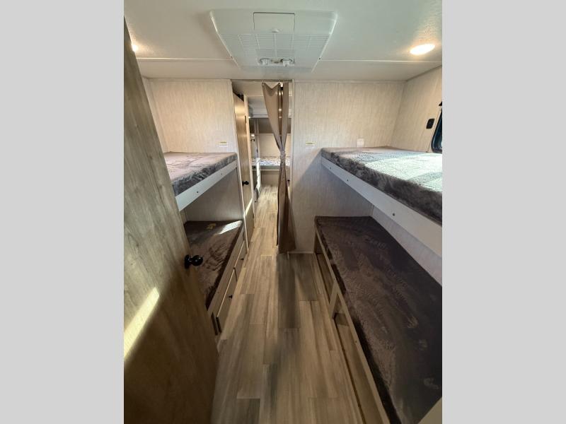 Your guests will love camping with you in this travel trailer! The bunkhouse suite includes four bunks with storage underneath plus a full rear bath to easily clean up each day. The front RV queen bed will provide a great night's rest, or you can choose the Murphy bed option if you're needing more seating space during the day. You can make your best meals in the full kitchen with a three burner cooktop and microwave oven, and there is an 8 cu. ft. 12V refrigerator to keep your cold items fresh. The U-shaped dinette provides a place to dine, play games, and even let additional guests sleep over. This unit also features a closet with washer and dryer prep if you choose to add those appliances.