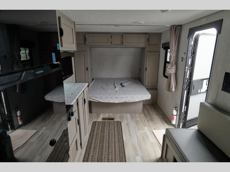 Your guests will love camping with you in this travel trailer! The bunkhouse suite includes four bunks with storage underneath plus a full rear bath to easily clean up each day. The front RV queen bed will provide a great night's rest, or you can choose the Murphy bed option if you're needing more seating space during the day. You can make your best meals in the full kitchen with a three burner cooktop and microwave oven, and there is an 8 cu. ft. 12V refrigerator to keep your cold items fresh. The U-shaped dinette provides a place to dine, play games, and even let additional guests sleep over. This unit also features a closet with washer and dryer prep if you choose to add those appliances.
