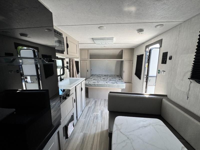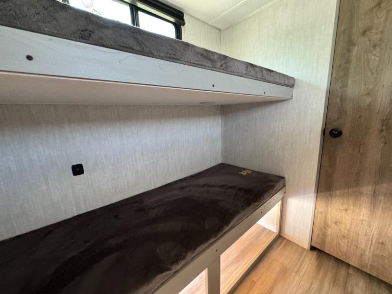 Your guests will love camping with you in this travel trailer! The bunkhouse suite includes four bunks with storage underneath plus a full rear bath to easily clean up each day. The front RV queen bed will provide a great night's rest, or you can choose the Murphy bed option if you're needing more seating space during the day. You can make your best meals in the full kitchen with a three burner cooktop and microwave oven, and there is an 8 cu. ft. 12V refrigerator to keep your cold items fresh. The U-shaped dinette provides a place to dine, play games, and even let additional guests sleep over. This unit also features a closet with washer and dryer prep if you choose to add those appliances.