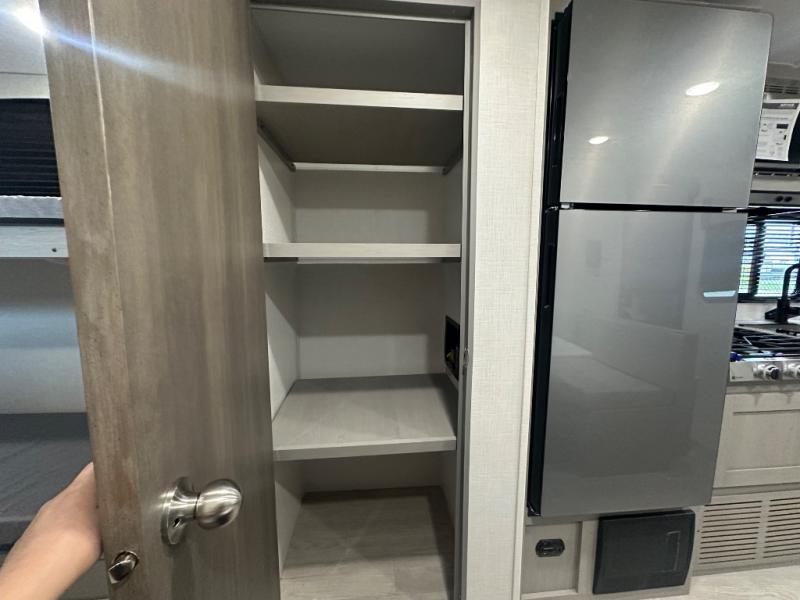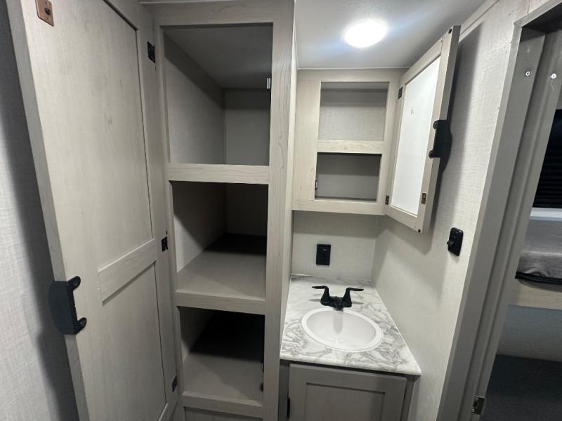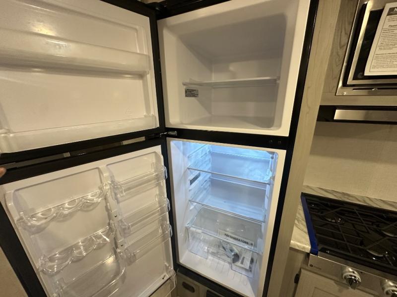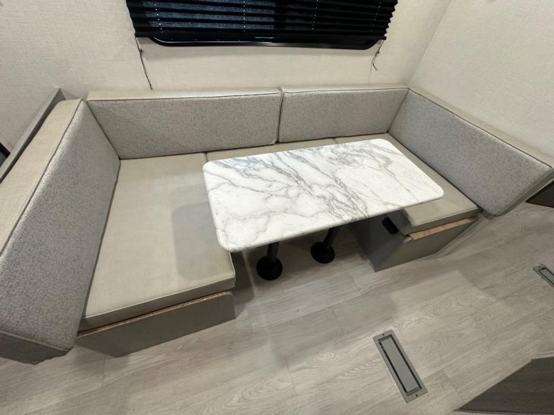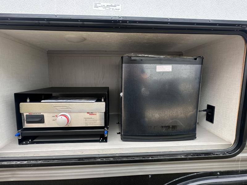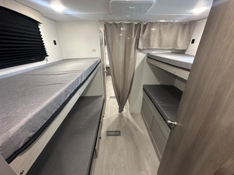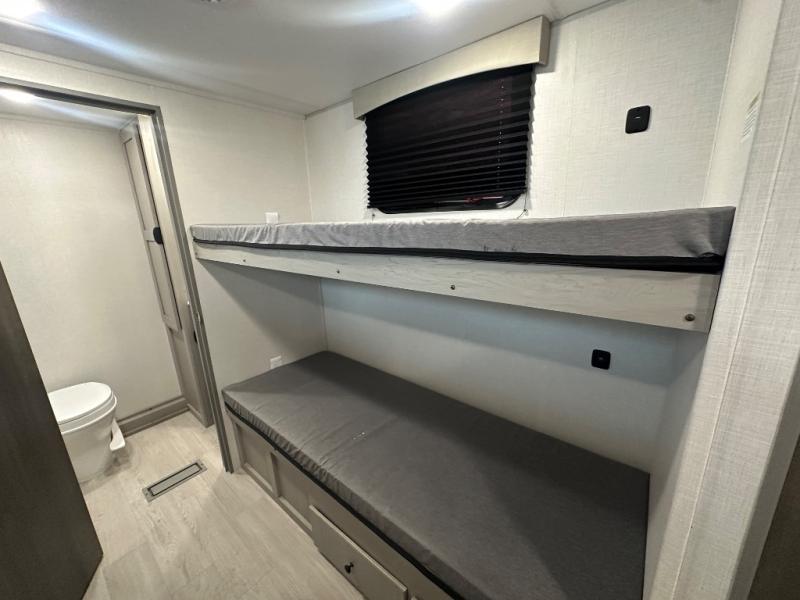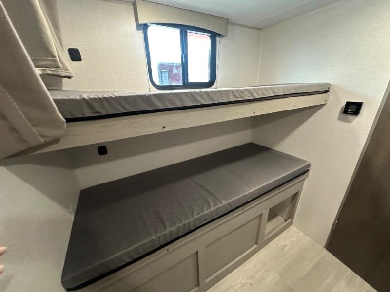 Your guests will love camping with you in this travel trailer! The bunkhouse suite includes four bunks with storage underneath plus a full rear bath to easily clean up each day. The front RV queen bed will provide a great night's rest, or you can choose the Murphy bed option if you're needing more seating space during the day. You can make your best meals in the full kitchen with a three burner cooktop and microwave oven, and there is an 8 cu. ft. 12V refrigerator to keep your cold items fresh. The U-shaped dinette provides a place to dine, play games, and even let additional guests sleep over. This unit also features a closet with washer and dryer prep if you choose to add those appliances.