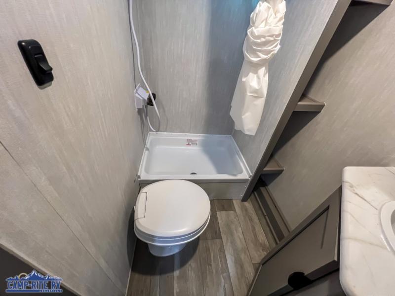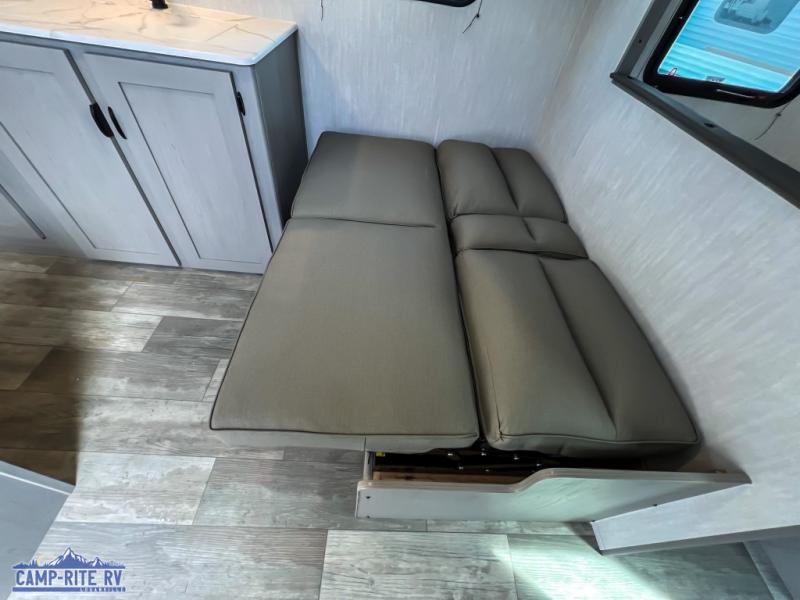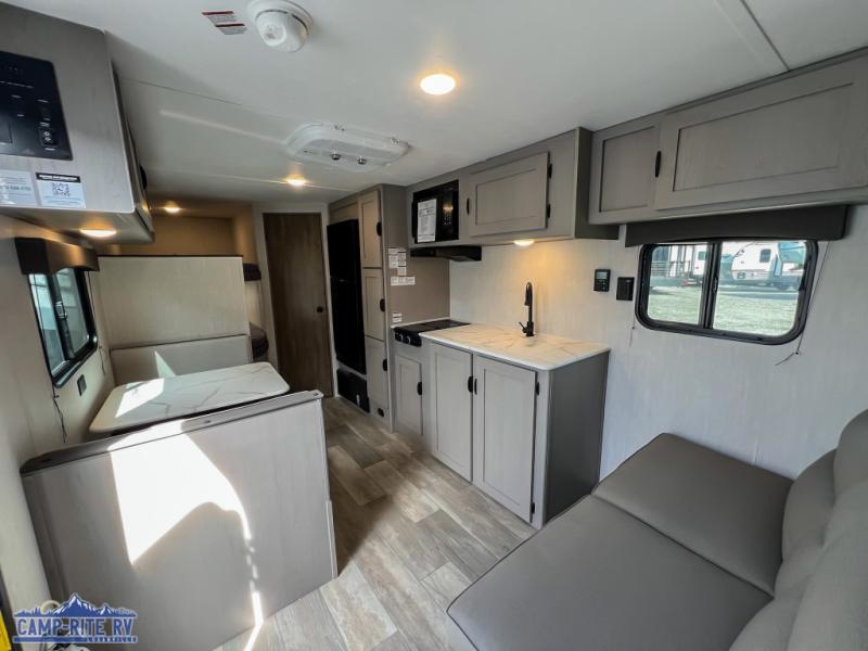 Bring the whole family with you in this travel trailer! The kiddos can sleep on the rear corner set of double-size bunks. The opposite rear corner features a full bath including a 24" x 36" shower, linen cabinet, toilet, and vanity with medicine cabinet overhead. In the main living space, you will find plenty of seating with a booth dinette and jackknife sofa which can also transform into an extra sleeping space if needed. Everyone's bellies will stay full with the induction cooktop, 8 cu. ft. 12-volt refrigerator, and microwave which you can use to pop a bag of popcorn for movie night. You will enjoy the front bedroom for a bit of privacy including a queen bed and large overhead cabinet for your things. On the outside, a large front pass-through for lawn chairs and camp gear. There is more storage beneath the bunks in back and a nice 10' awning to provide protection from the elements when outdoors.