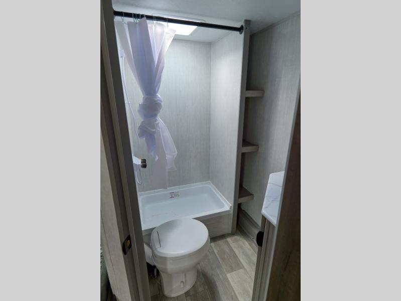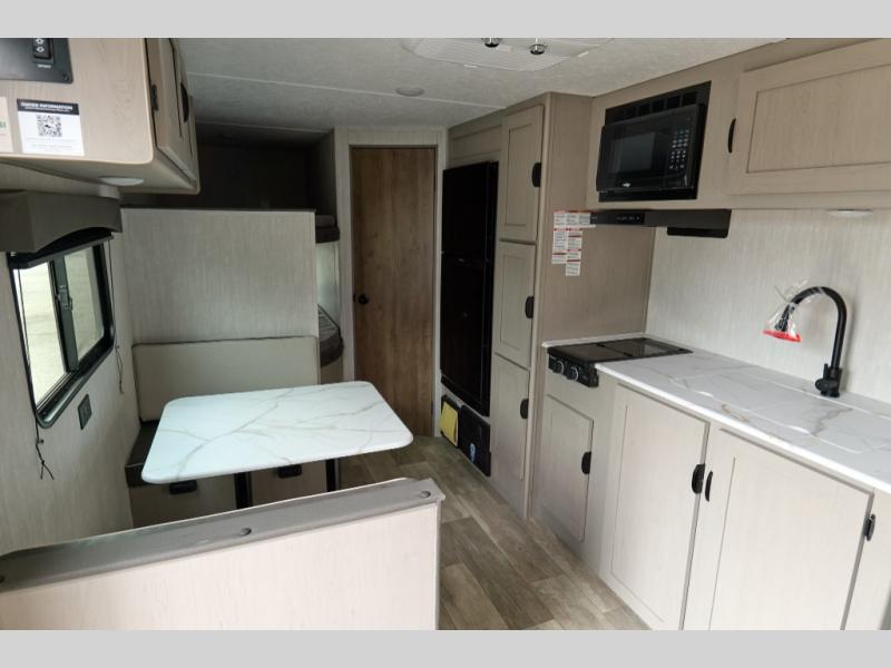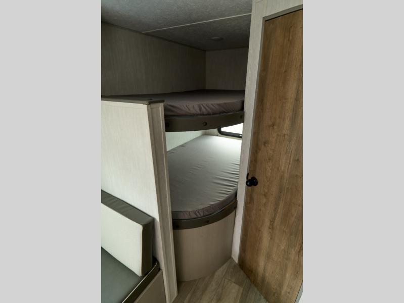 Bring the whole family with you in this travel trailer! The kiddos can sleep on the rear corner set of double-size bunks. The opposite rear corner features a full bath including a 24" x 36" shower, linen cabinet, toilet, and vanity with medicine cabinet overhead. In the main living space, you will find plenty of seating with a booth dinette and jackknife sofa which can also transform into an extra sleeping space if needed. Everyone's bellies will stay full with the induction cooktop, 8 cu. ft. 12-volt refrigerator, and microwave which you can use to pop a bag of popcorn for movie night. You will enjoy the front bedroom for a bit of privacy including a queen bed and large overhead cabinet for your things. On the outside, a large front pass-through for lawn chairs and camp gear. There is more storage beneath the bunks in back and a nice 10' awning to provide protection from the elements when outdoors.