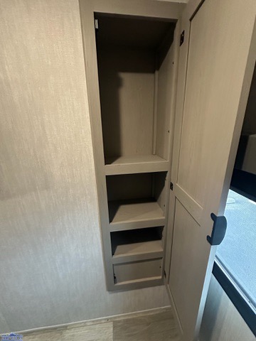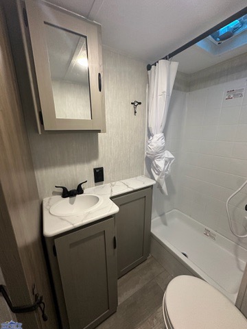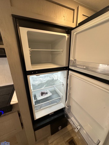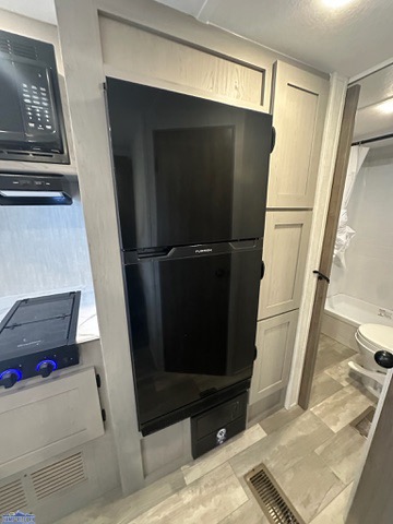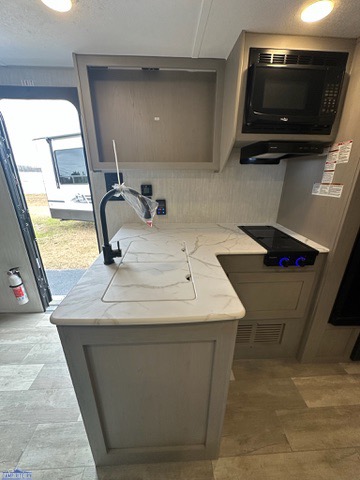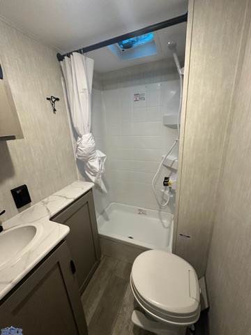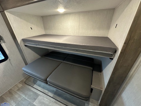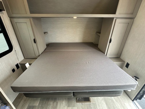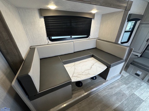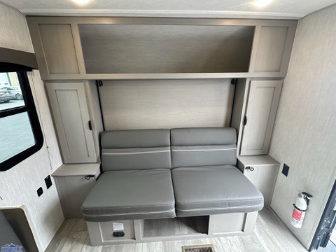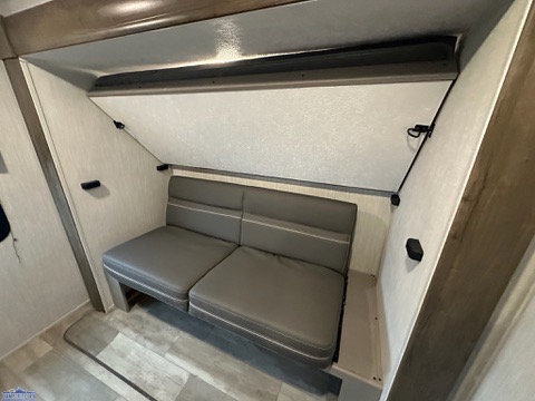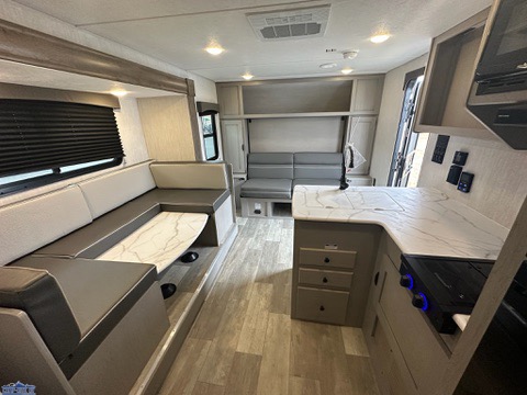 This versatile travel trailer is the perfect choice if you plan to camp with friends and family. The Murphy bed can be folded up during the day so you can relax on the jack knife sofa, and there is also a U-shaped dinette for dining space and game night. The rear corner den includes a second jack knife sofa within a slide out for more space plus a countertop where you can keep your drinks off of the floor. A full kitchen, complete with a three burner cooktop, microwave and 12V refrigerator will let you cook and store food. And don't overlook the full bath with a vanity with a sink, a toilet, and a 24" x 36" shower. There is even storage for clean towels and toiletries!