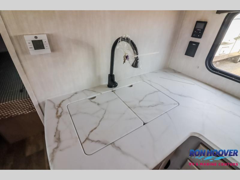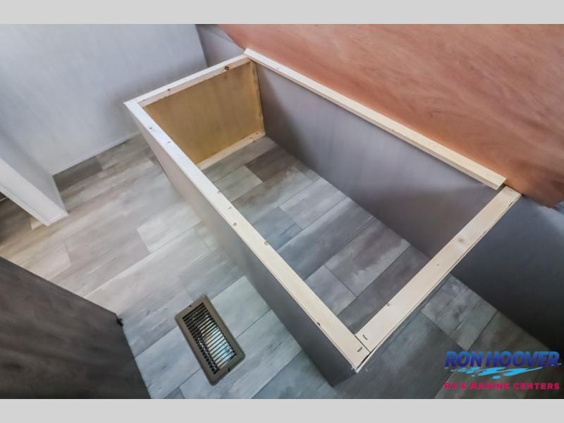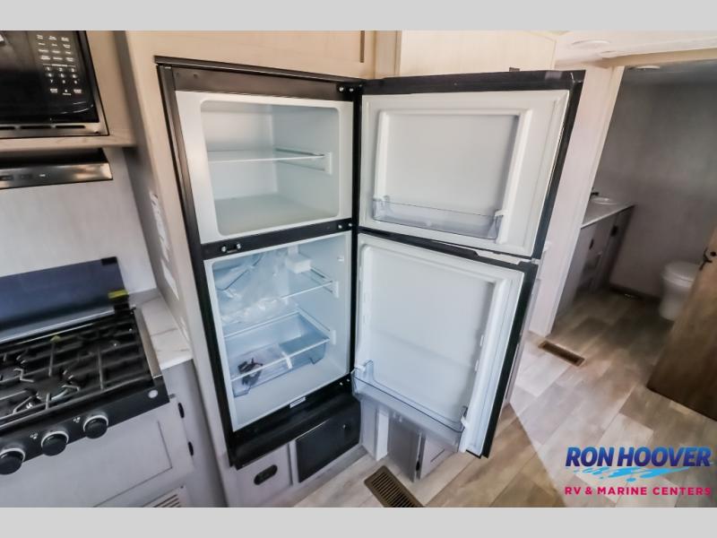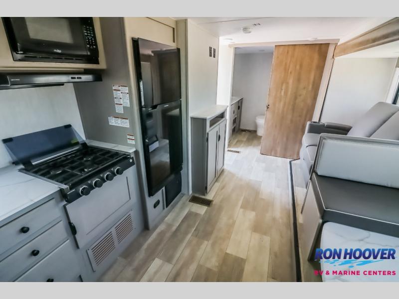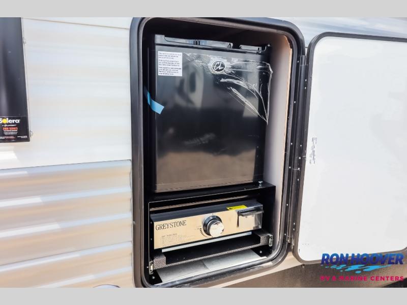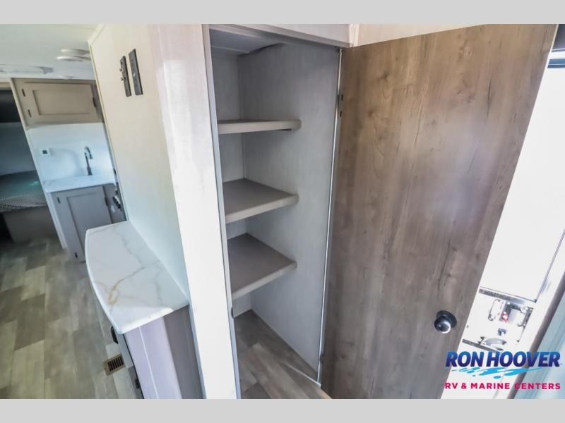 Pack your bags and head to the campground in this spacious travel trailer! The owners will love having their own space in the front private bedroom, complete with an RV queen bed plus dual wardrobes and shelves. If you have any guests staying over, they can sleep on the sofa and booth dinette within the large slide out, and an optional fireplace can be added to this space to make it feel a little more like home. A full kitchen will let you make meals each day, and the outside camp kitchen with a small refrigerator will be perfect for lunch outside. The spacious full rear bath features a large bath countertop, a shower with a glass door, and a linen cabinet to name a few conveniences. The walk-in pantry is another feature you are sure to appreciate, especially since it has washer and dryer prep if you choose to add these appliances.