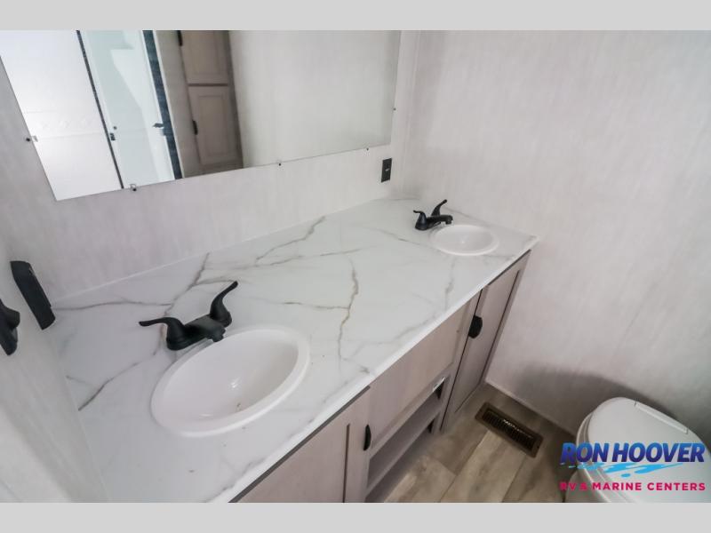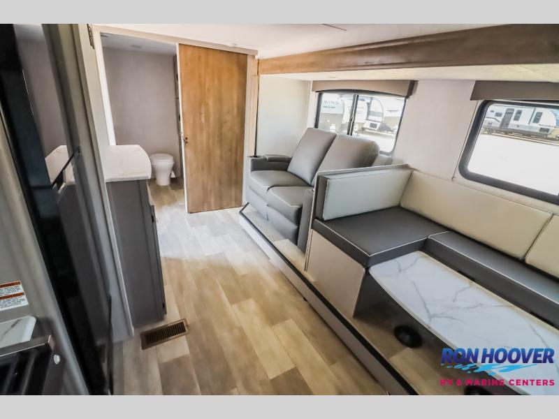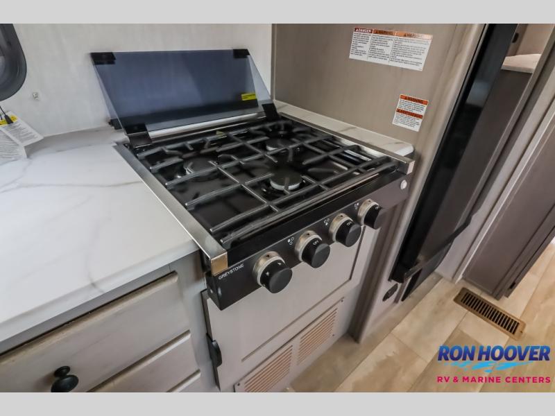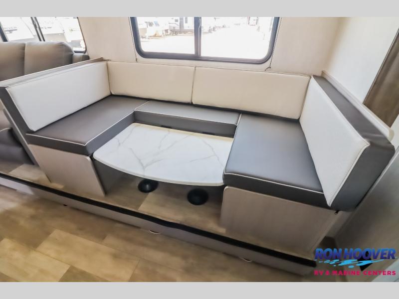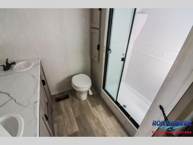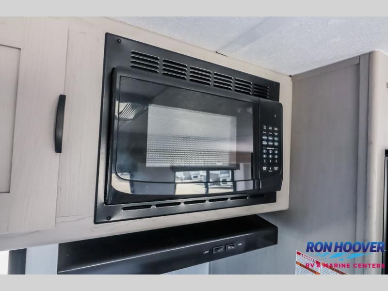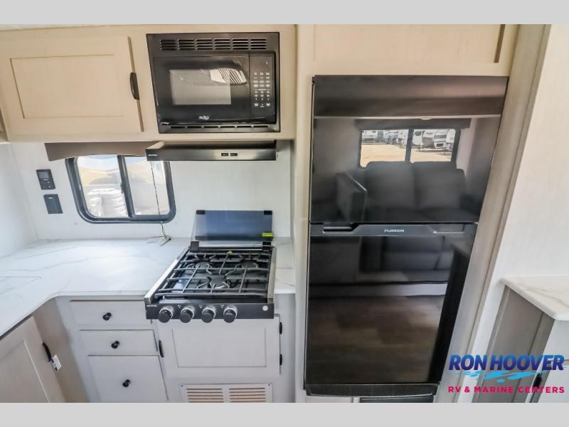 Pack your bags and head to the campground in this spacious travel trailer! The owners will love having their own space in the front private bedroom, complete with an RV queen bed plus dual wardrobes and shelves. If you have any guests staying over, they can sleep on the sofa and booth dinette within the large slide out, and an optional fireplace can be added to this space to make it feel a little more like home. A full kitchen will let you make meals each day, and the outside camp kitchen with a small refrigerator will be perfect for lunch outside. The spacious full rear bath features a large bath countertop, a shower with a glass door, and a linen cabinet to name a few conveniences. The walk-in pantry is another feature you are sure to appreciate, especially since it has washer and dryer prep if you choose to add these appliances.