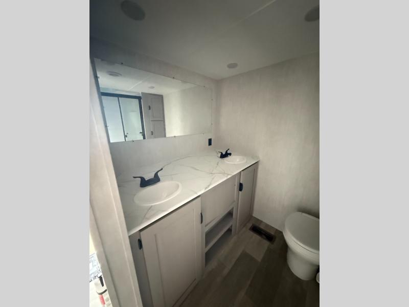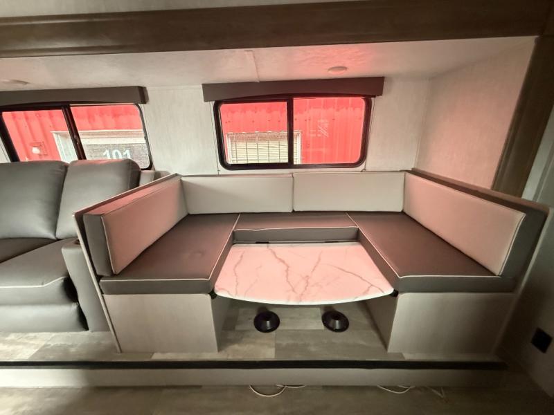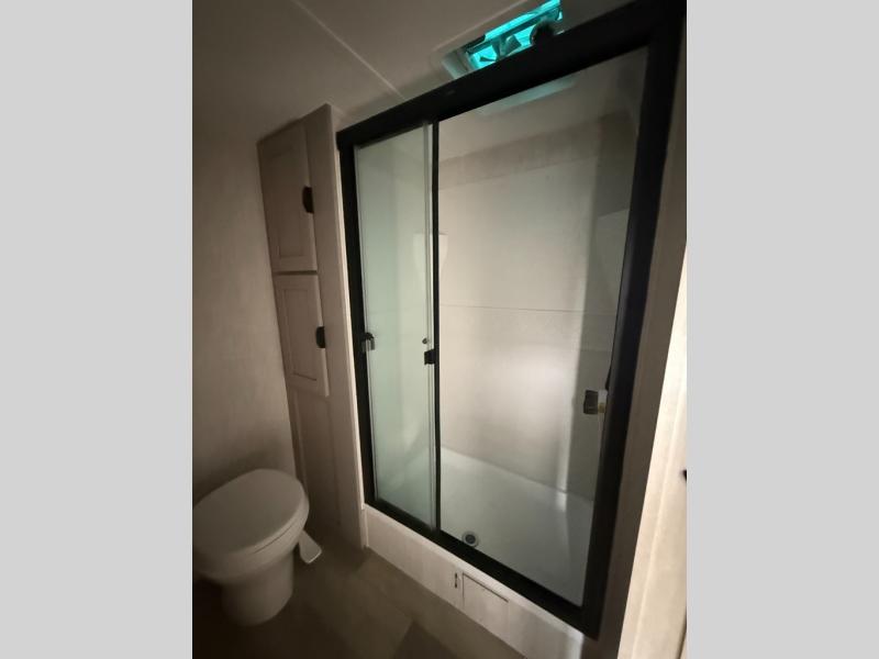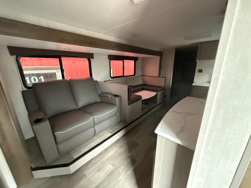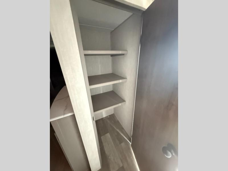 Pack your bags and head to the campground in this spacious travel trailer! The owners will love having their own space in the front private bedroom, complete with an RV queen bed plus dual wardrobes and shelves. If you have any guests staying over, they can sleep on the sofa and booth dinette within the large slide out, and an optional fireplace can be added to this space to make it feel a little more like home. A full kitchen will let you make meals each day, and the outside camp kitchen with a small refrigerator will be perfect for lunch outside. The spacious full rear bath features a large bath countertop, a shower with a glass door, and a linen cabinet to name a few conveniences. The walk-in pantry is another feature you are sure to appreciate, especially since it has washer and dryer prep if you choose to add these appliances.