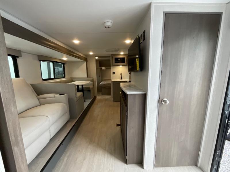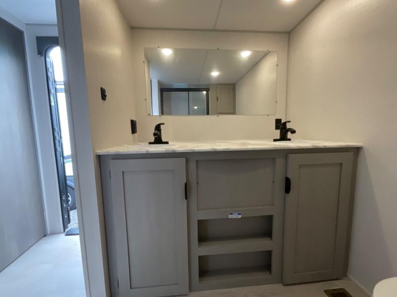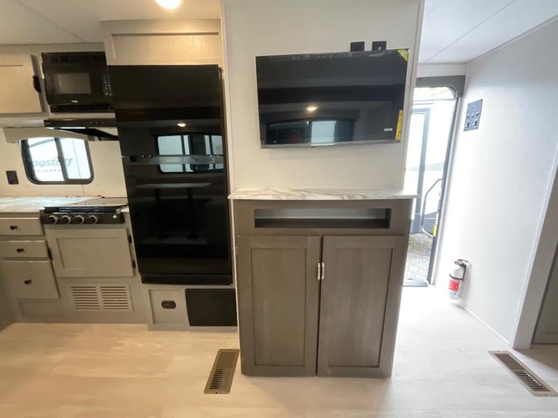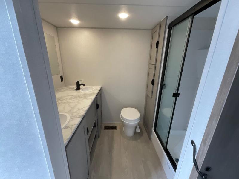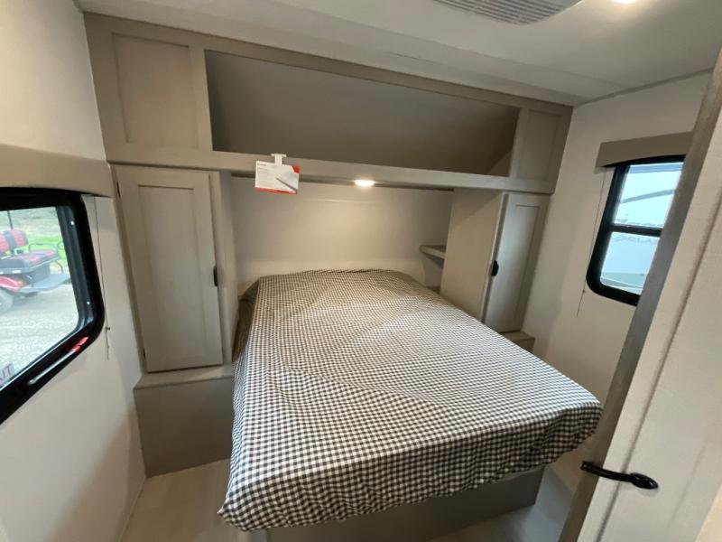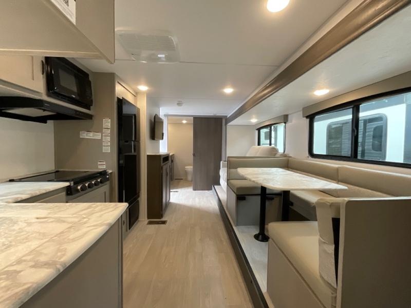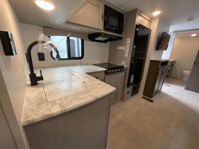 Pack your bags and head to the campground in this spacious travel trailer! The owners will love having their own space in the front private bedroom, complete with an RV queen bed plus dual wardrobes and shelves. If you have any guests staying over, they can sleep on the sofa and booth dinette within the large slide out, and an optional fireplace can be added to this space to make it feel a little more like home. A full kitchen will let you make meals each day, and the outside camp kitchen with a small refrigerator will be perfect for lunch outside. The spacious full rear bath features a large bath countertop, a shower with a glass door, and a linen cabinet to name a few conveniences. The walk-in pantry is another feature you are sure to appreciate, especially since it has washer and dryer prep if you choose to add these appliances.