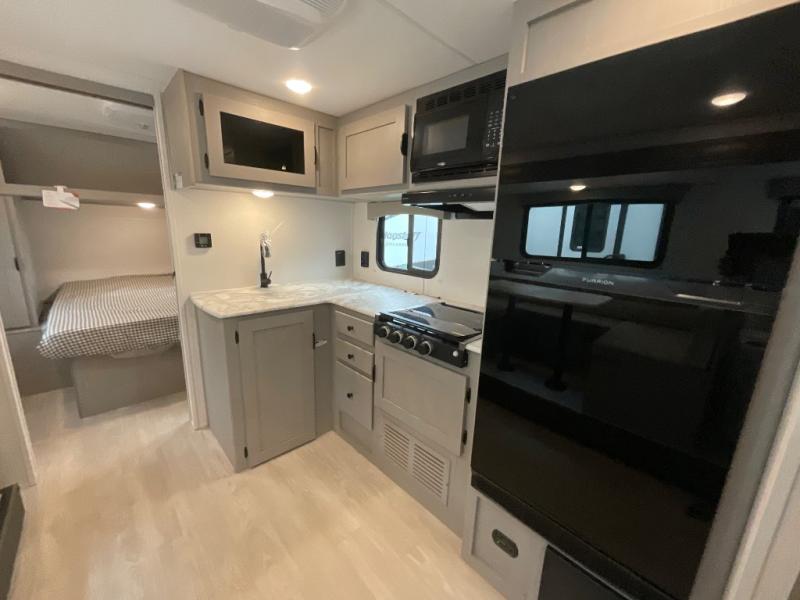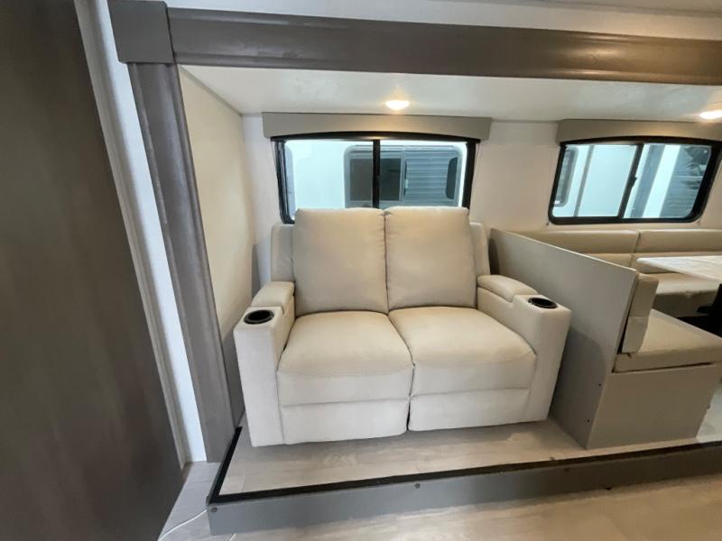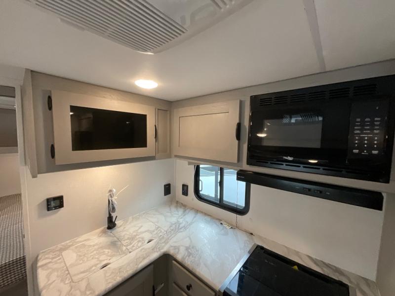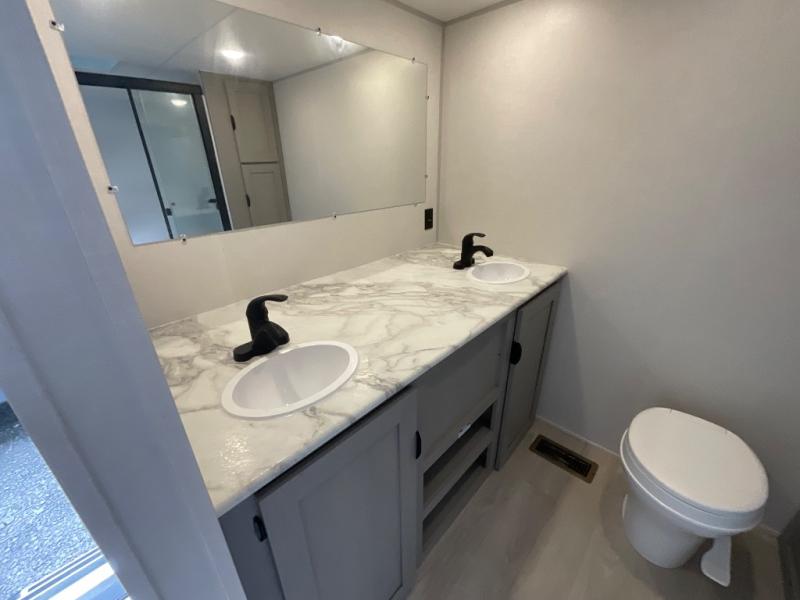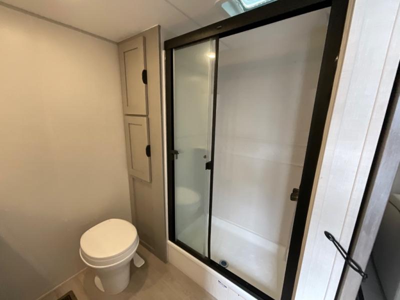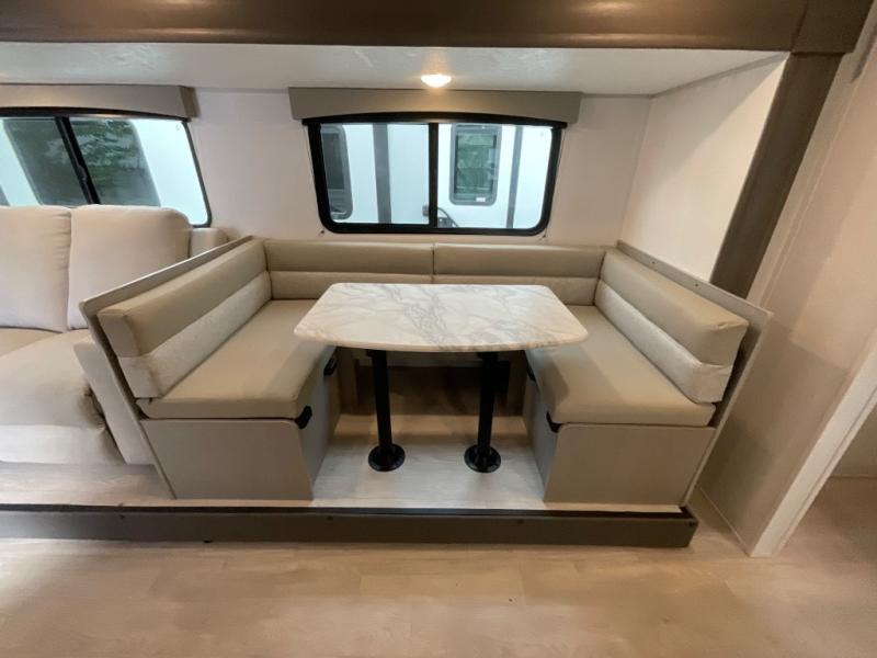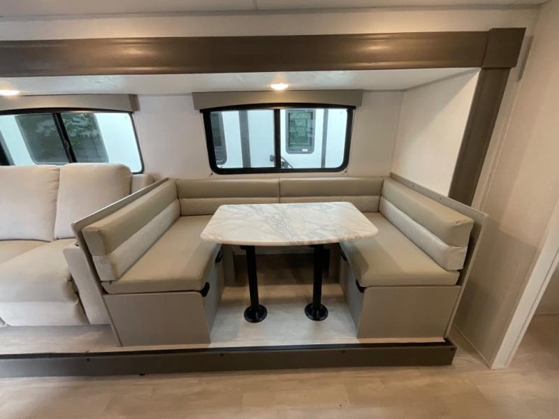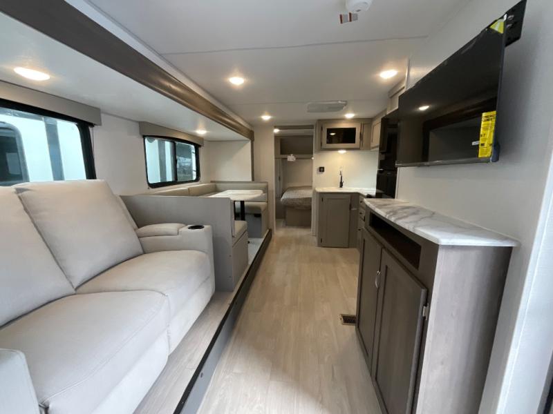 Pack your bags and head to the campground in this spacious travel trailer! The owners will love having their own space in the front private bedroom, complete with an RV queen bed plus dual wardrobes and shelves. If you have any guests staying over, they can sleep on the sofa and booth dinette within the large slide out, and an optional fireplace can be added to this space to make it feel a little more like home. A full kitchen will let you make meals each day, and the outside camp kitchen with a small refrigerator will be perfect for lunch outside. The spacious full rear bath features a large bath countertop, a shower with a glass door, and a linen cabinet to name a few conveniences. The walk-in pantry is another feature you are sure to appreciate, especially since it has washer and dryer prep if you choose to add these appliances.