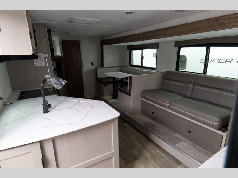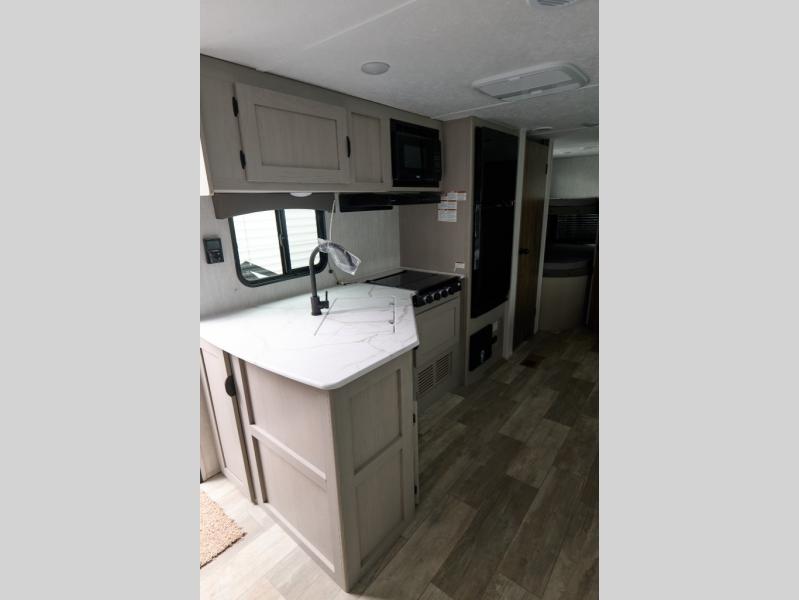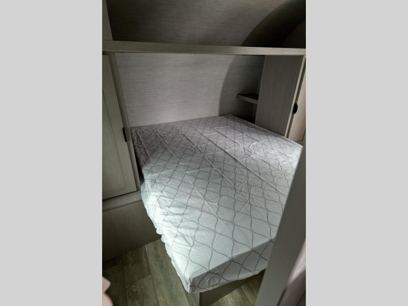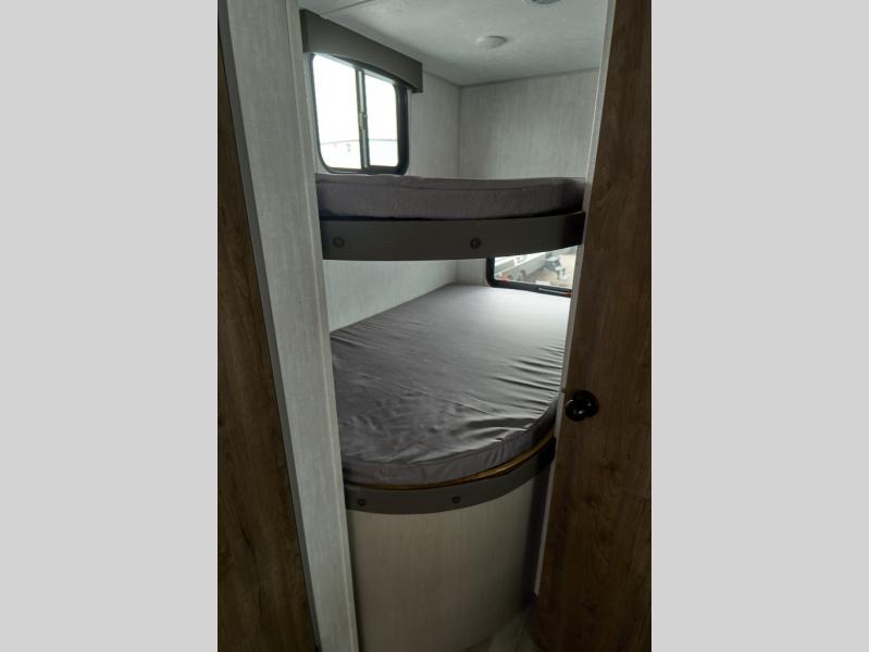 Pack your bags and head to the campground in this spacious travel trailer for eight! The owners will love having their own space in the front private bedroom, complete with an RV queen bed and dual wardrobes and shelves. There are double-size bunks in the rear corner, with the full bath in the other rear corner for easy nighttime use. Everyone can meet in the combined living area and kitchen while the cook makes breakfast. There is a sofa and booth dinette within the large slide out and an entertainment center with an optional fireplace if you want to make this space more cozy. This unit also includes a large pantry with washer and dryer prep, giving you the option to add these appliances, and an optional camp kitchen can be added for the cook who loves being outdoors!