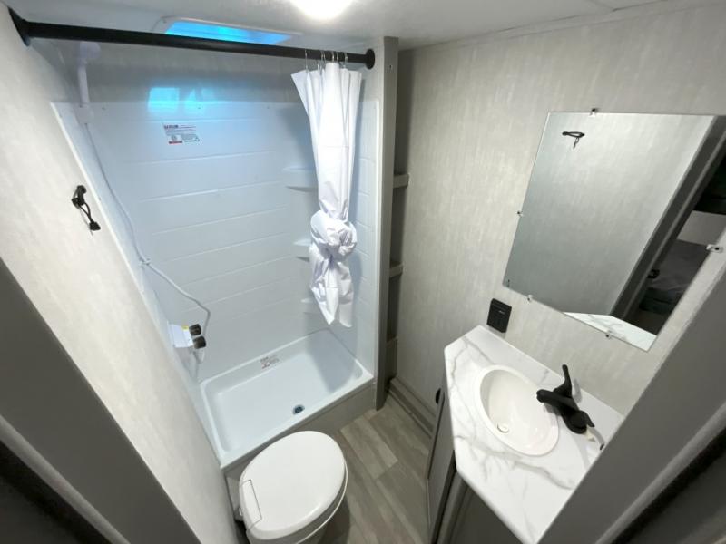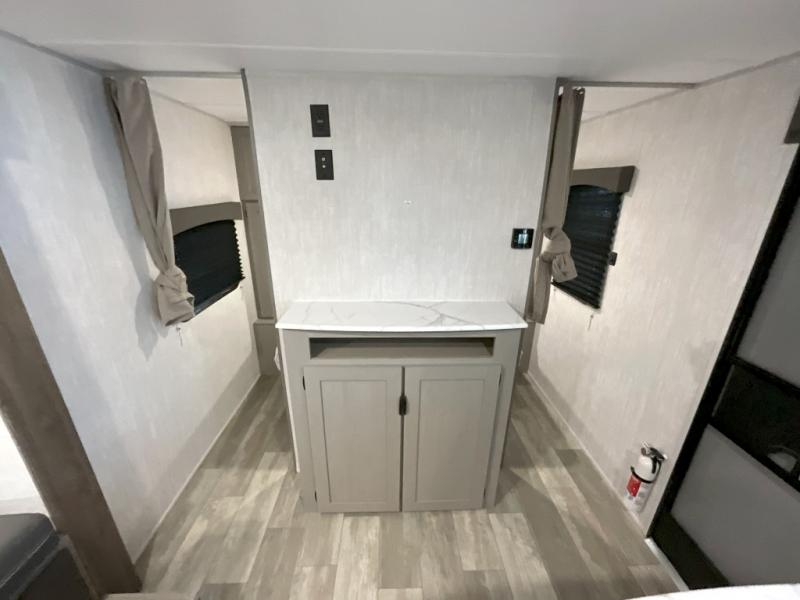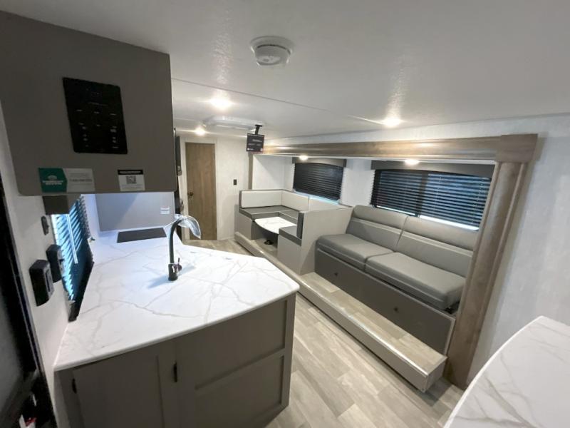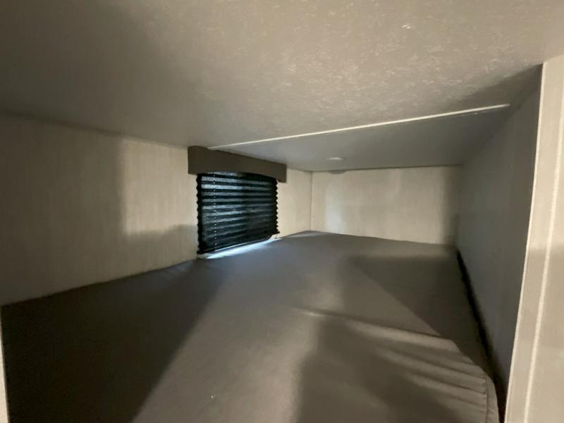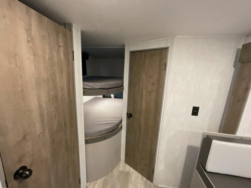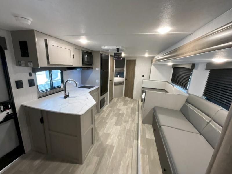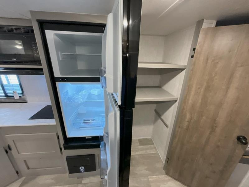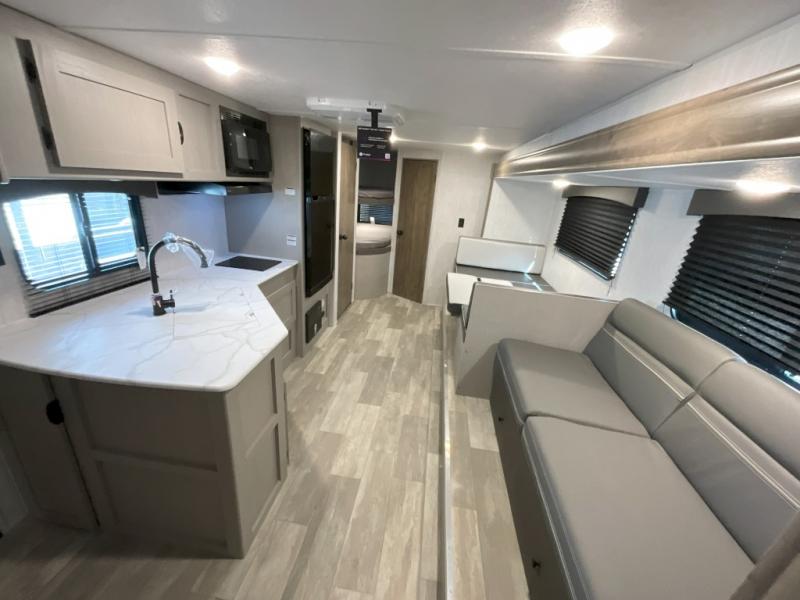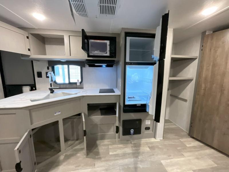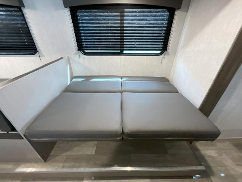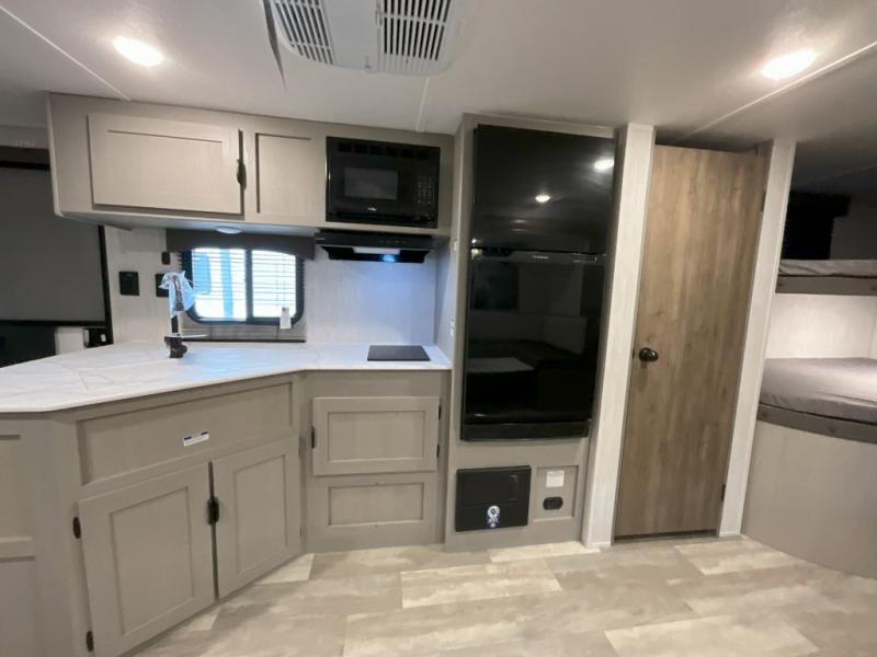 Pack your bags and head to the campground in this spacious travel trailer for eight! The owners will love having their own space in the front private bedroom, complete with an RV queen bed and dual wardrobes and shelves. There are double-size bunks in the rear corner, with the full bath in the other rear corner for easy nighttime use. Everyone can meet in the combined living area and kitchen while the cook makes breakfast. There is a sofa and booth dinette within the large slide out and an entertainment center with an optional fireplace if you want to make this space more cozy. This unit also includes a large pantry with washer and dryer prep, giving you the option to add these appliances, and an optional camp kitchen can be added for the cook who loves being outdoors!