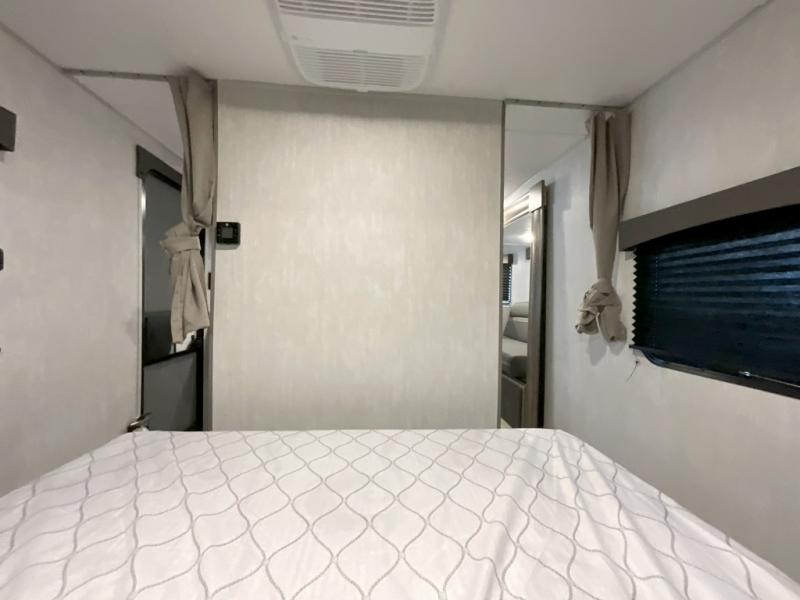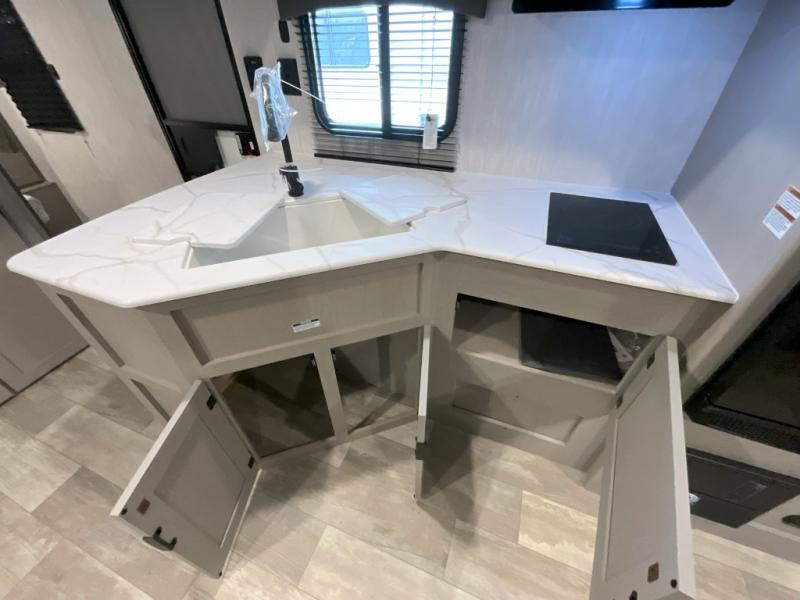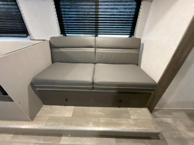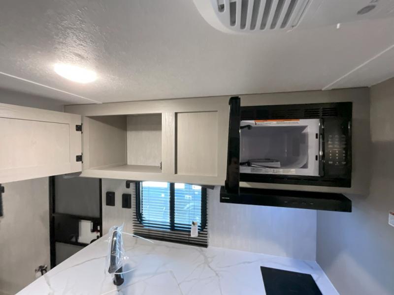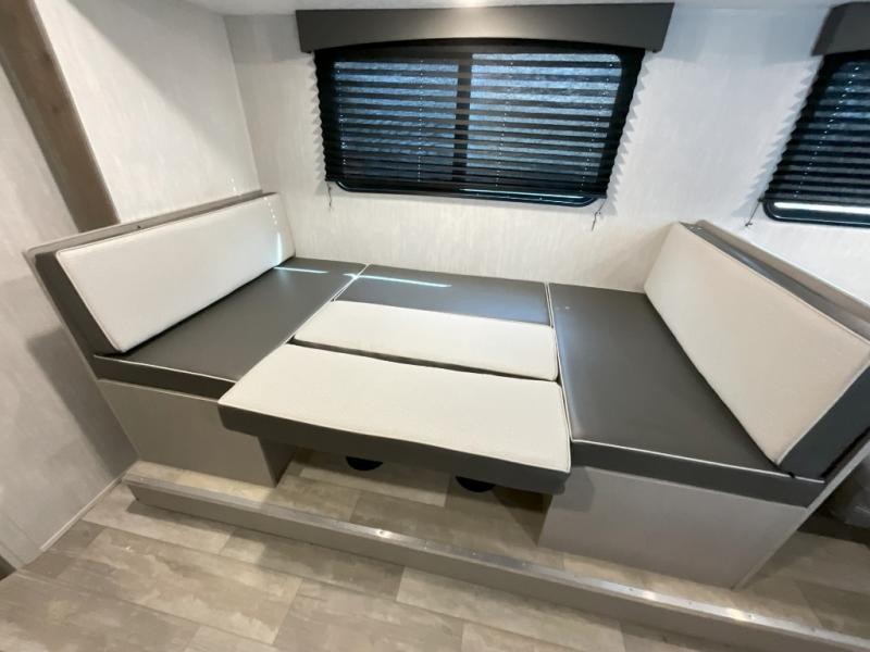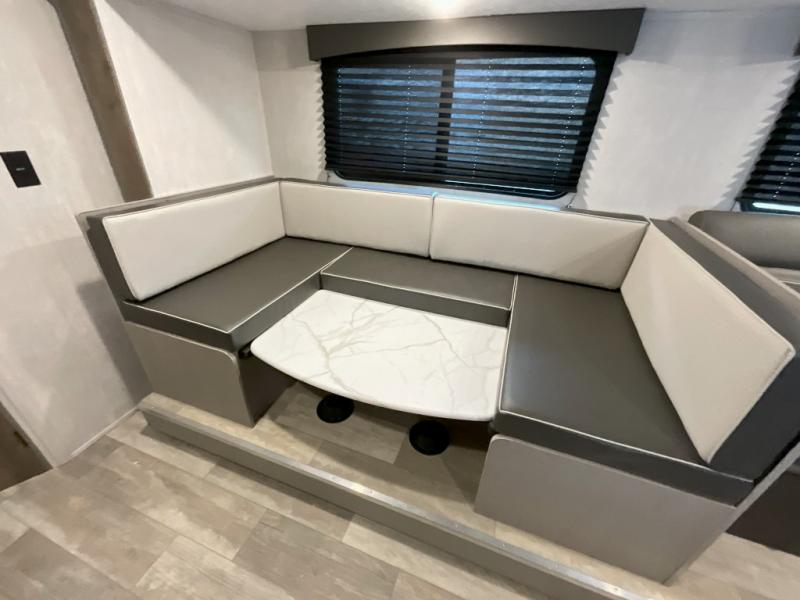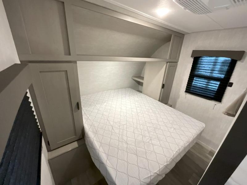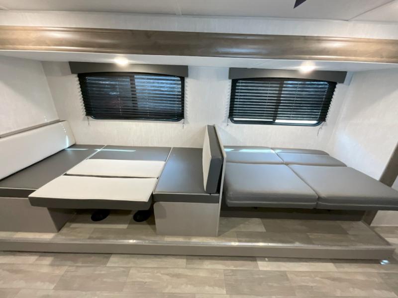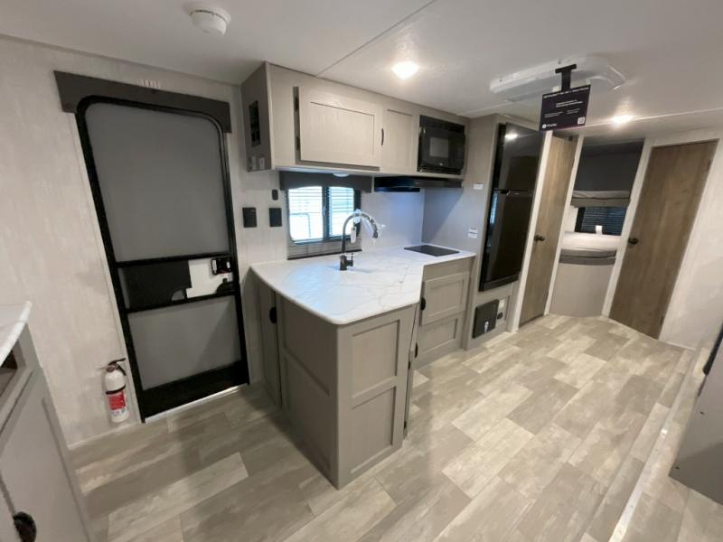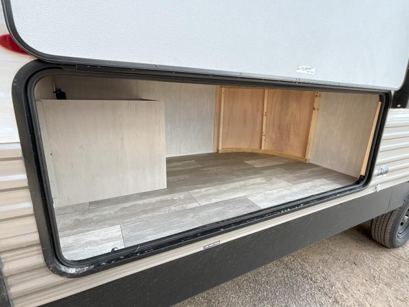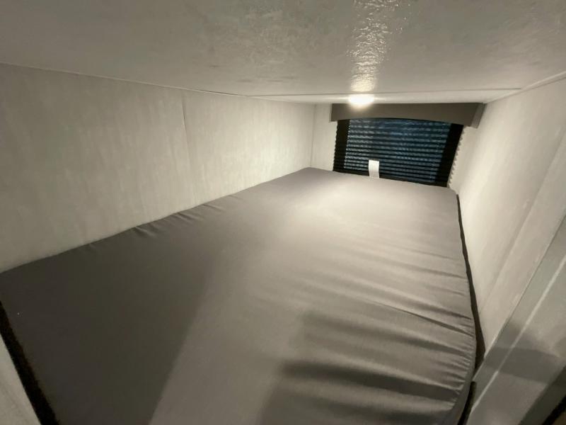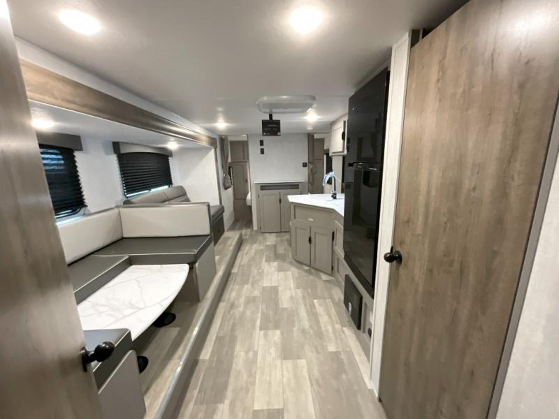 Pack your bags and head to the campground in this spacious travel trailer for eight! The owners will love having their own space in the front private bedroom, complete with an RV queen bed and dual wardrobes and shelves. There are double-size bunks in the rear corner, with the full bath in the other rear corner for easy nighttime use. Everyone can meet in the combined living area and kitchen while the cook makes breakfast. There is a sofa and booth dinette within the large slide out and an entertainment center with an optional fireplace if you want to make this space more cozy. This unit also includes a large pantry with washer and dryer prep, giving you the option to add these appliances, and an optional camp kitchen can be added for the cook who loves being outdoors!