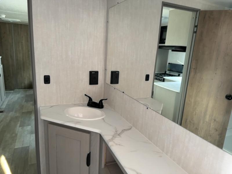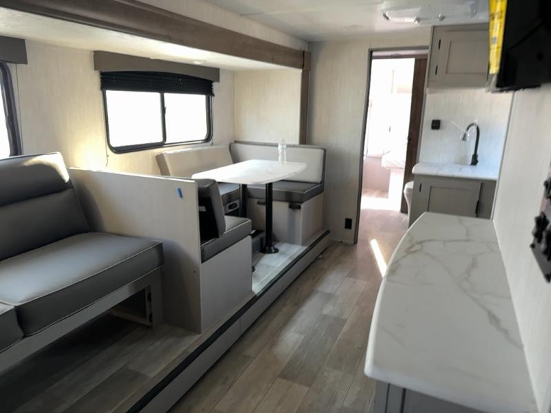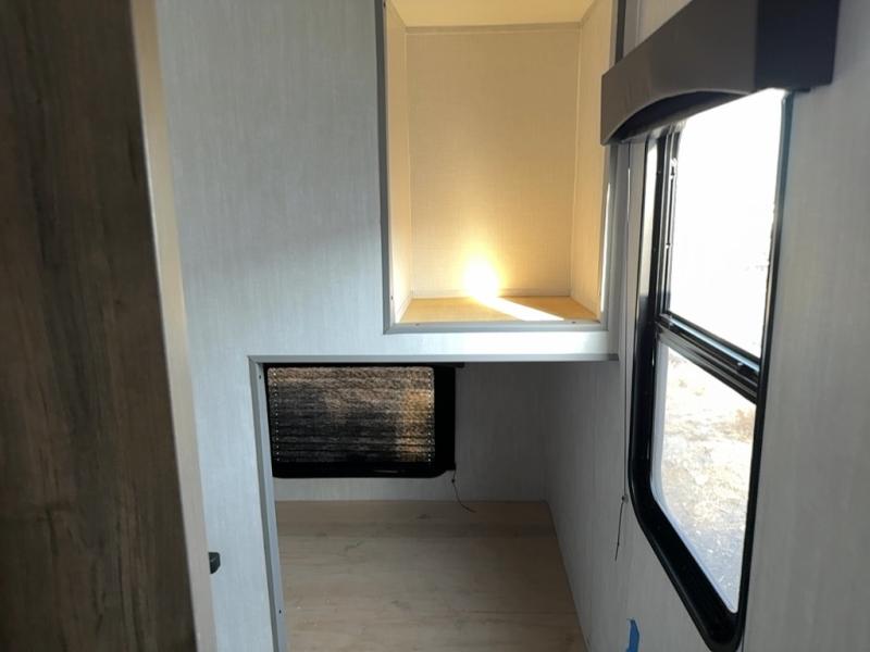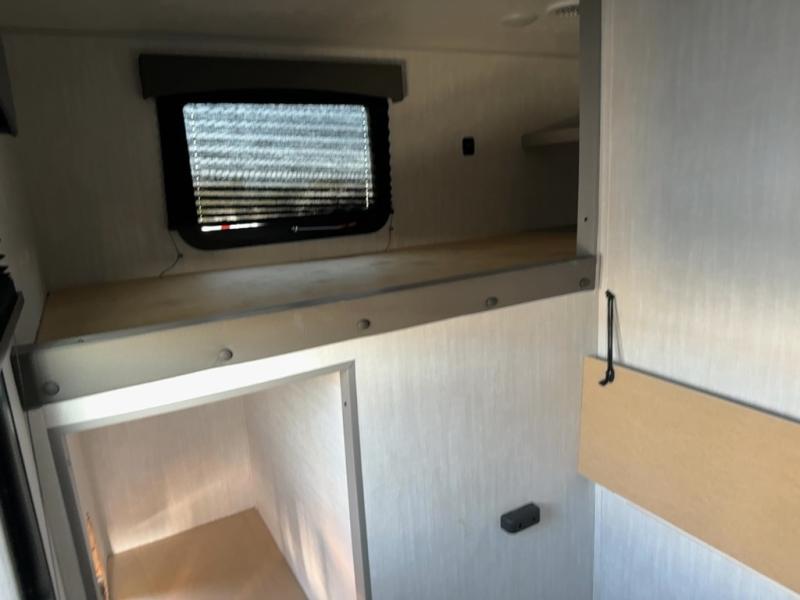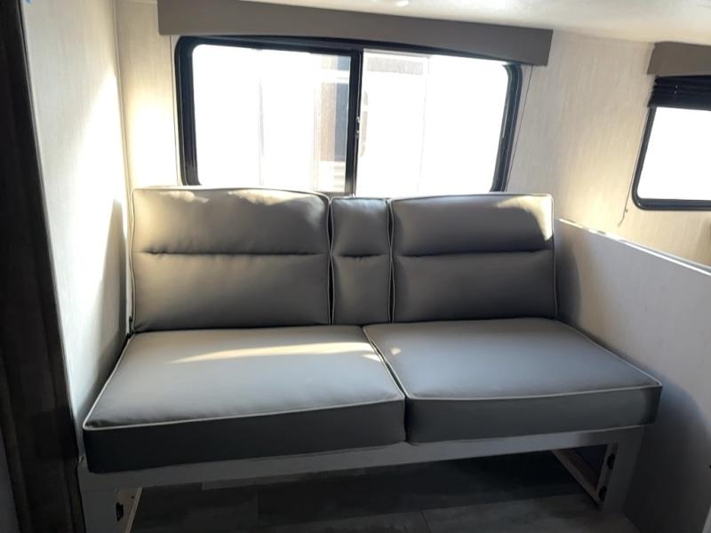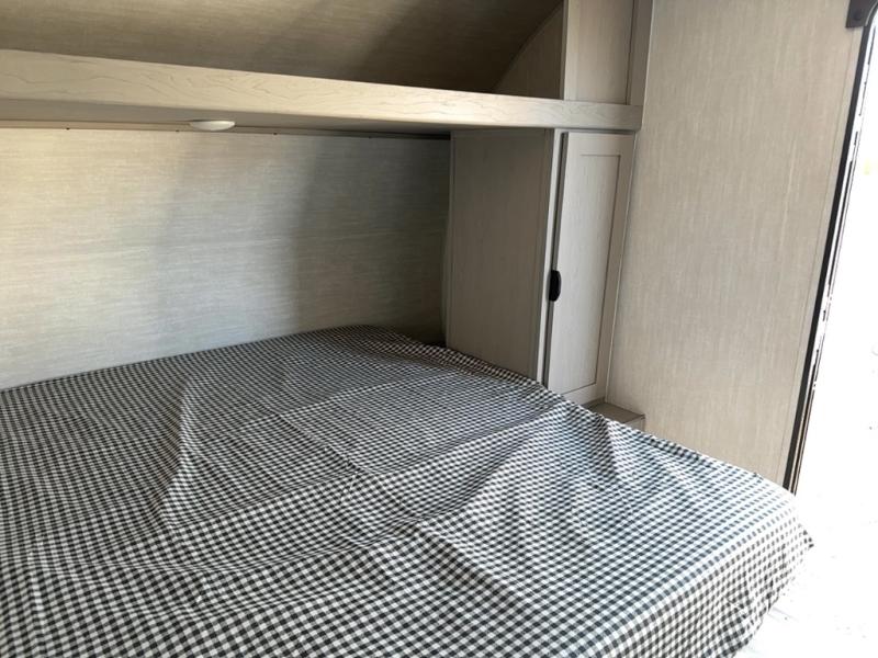 At the front of the trailer, a private bedroom welcomes you with a comfortable 60" x 80" queen bed for a restful night’s sleep, along with wardrobes on each side and an overhead shelf for organized storage. A convenient entry door provides direct access to this cozy space. Moving through the pass-through full bathroom, you’ll find storage beneath the countertop for toiletries and a 32" x 32" shower with a glass door, perfect for unwinding after a full day of adventure. At the center of the trailer, the main living area and kitchen create a spacious and functional hub, featuring a sofa and U-shaped dinette housed in a slide-out for plenty of seating space, while the fully equipped kitchen includes a sink with drying rack, a three-burner cooktop, and a 10 cu. ft. refrigerator so you can cook like a chef. Next to the second entry door, a walk-in pantry offers abundant space for dry goods and supplies. At the rear, two private bunk rooms each include a 38" x 72" bunk, dedicated storage, and a flip-up desk, ideal for work, study, or quiet time.