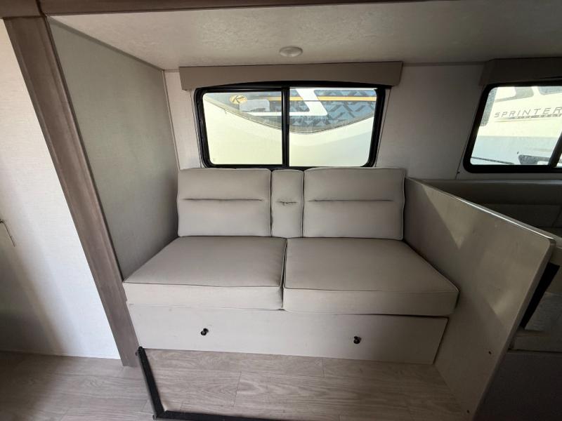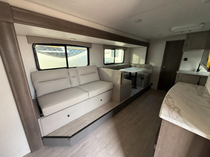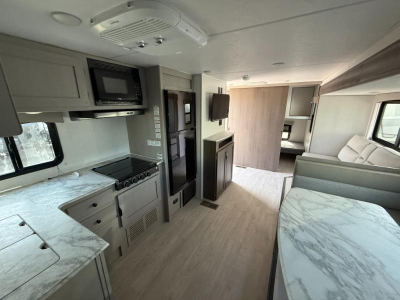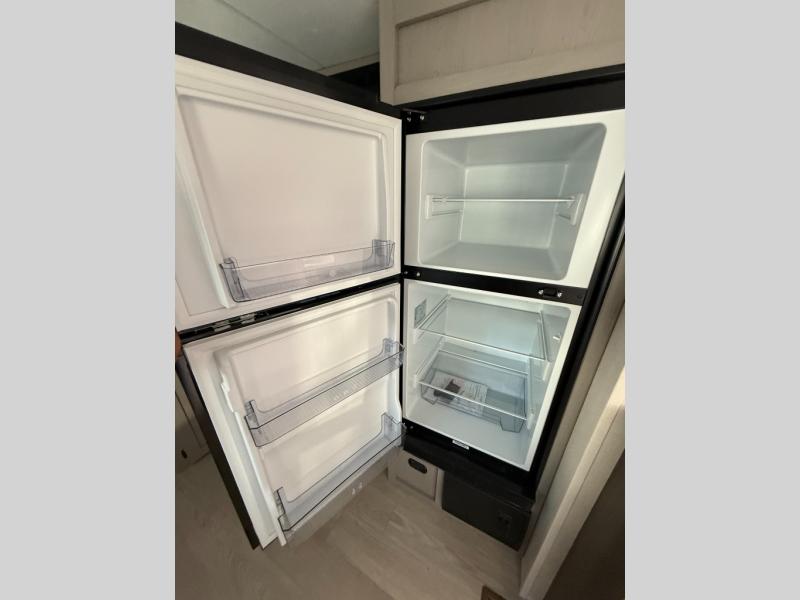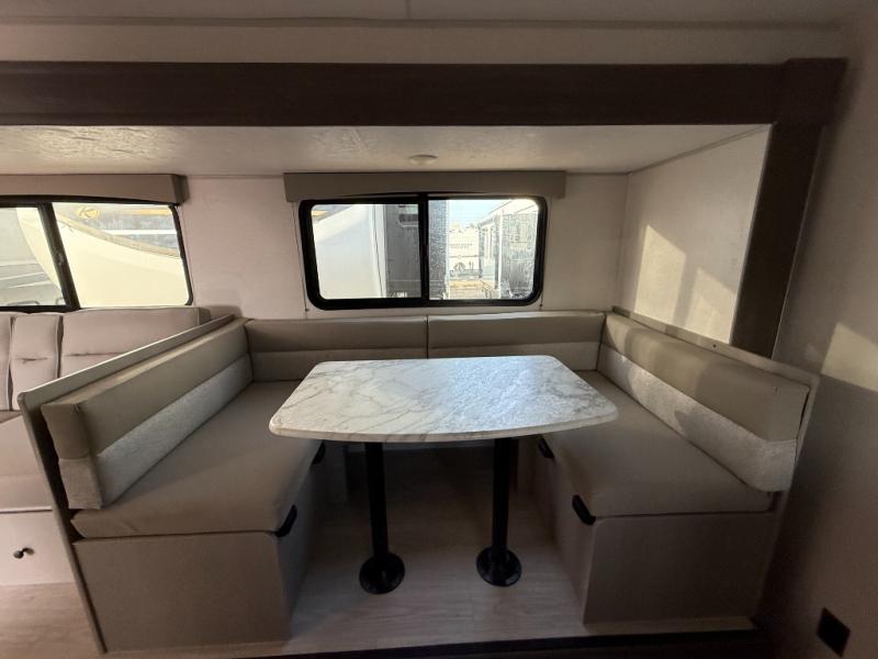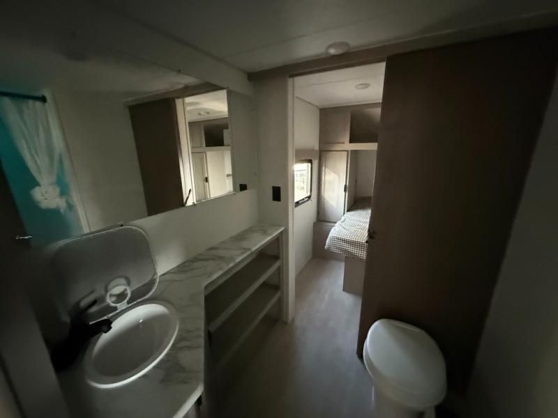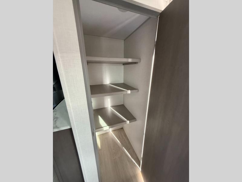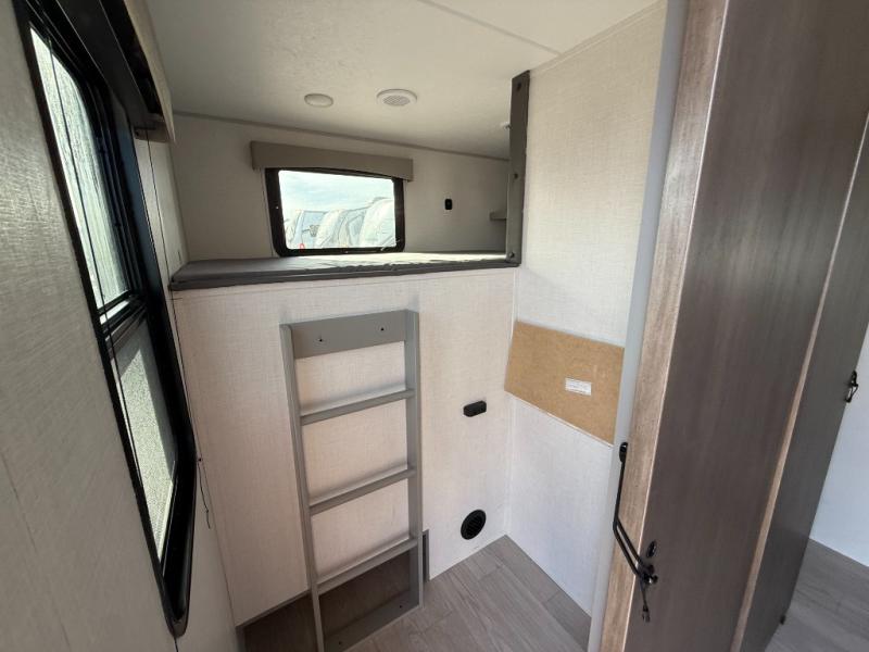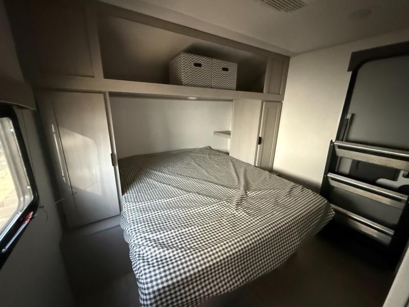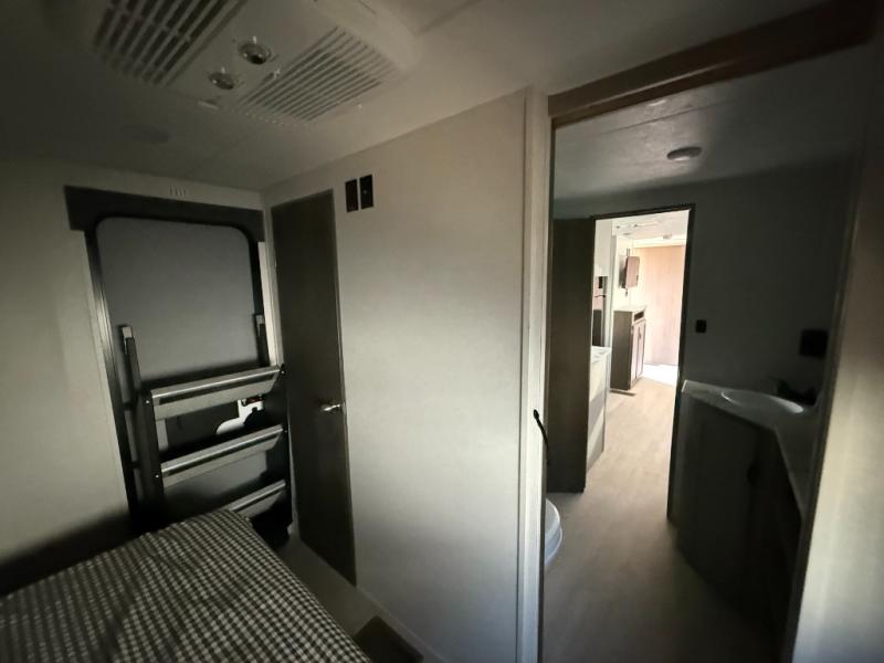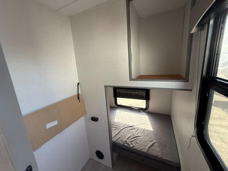 At the front of the trailer, a private bedroom welcomes you with a comfortable 60" x 80" queen bed for a restful night’s sleep, along with wardrobes on each side and an overhead shelf for organized storage. A convenient entry door provides direct access to this cozy space. Moving through the pass-through full bathroom, you’ll find storage beneath the countertop for toiletries and a 32" x 32" shower with a glass door, perfect for unwinding after a full day of adventure. At the center of the trailer, the main living area and kitchen create a spacious and functional hub, featuring a sofa and U-shaped dinette housed in a slide-out for plenty of seating space, while the fully equipped kitchen includes a sink with drying rack, a three-burner cooktop, and a 10 cu. ft. refrigerator so you can cook like a chef. Next to the second entry door, a walk-in pantry offers abundant space for dry goods and supplies. At the rear, two private bunk rooms each include a 38" x 72" bunk, dedicated storage, and a flip-up desk, ideal for work, study, or quiet time.